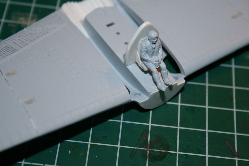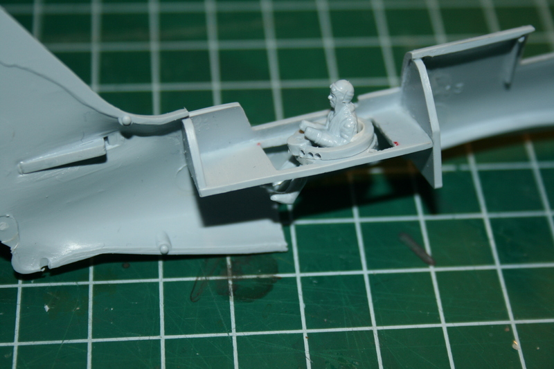 Der Pilot und der Schütze wiesen erfreulicherweise nicht die typischen 50mm Kanoneneinschusslöcher auf, die ich von Airfix kenne und auch die Konturen waren so scharf, dass ich beide verwende (im Gegensatz zu den Figuren der meiner vorher gebauten Avenger). Eine beherzte Bohrung durch die Hände gestattet es dem Piloten auch den Joystick zu halten. Der Sitz wurde ersetzt, die Rückwand deshalb auch.