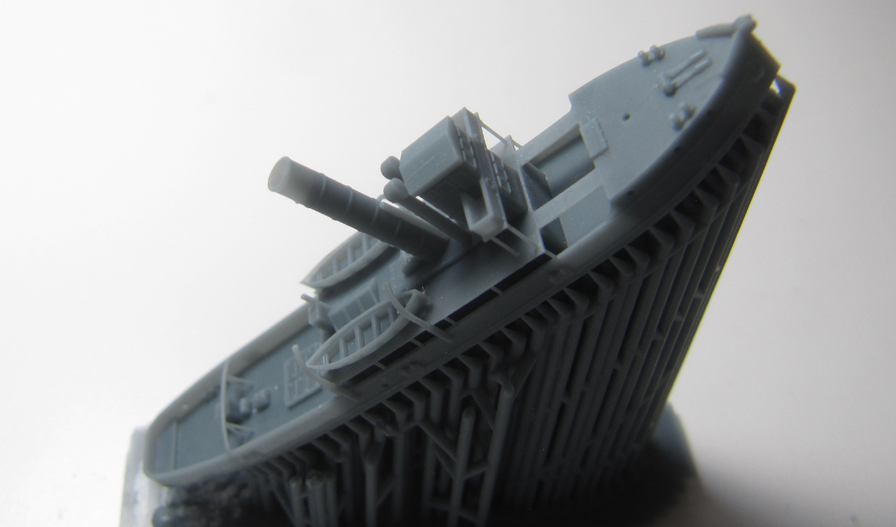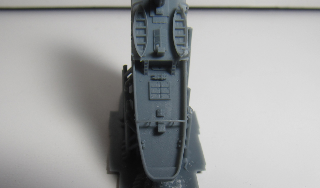 Das Modell besteht nur aus einem Teil. Aufbauten, Schornstein, Lüfter, Beiboote und Davits sind schon mit angedruckt (einer der Davits ist auf dem Foto abgebrochen). Das Modell ist sehr detailliert (aber auch sehr klein).