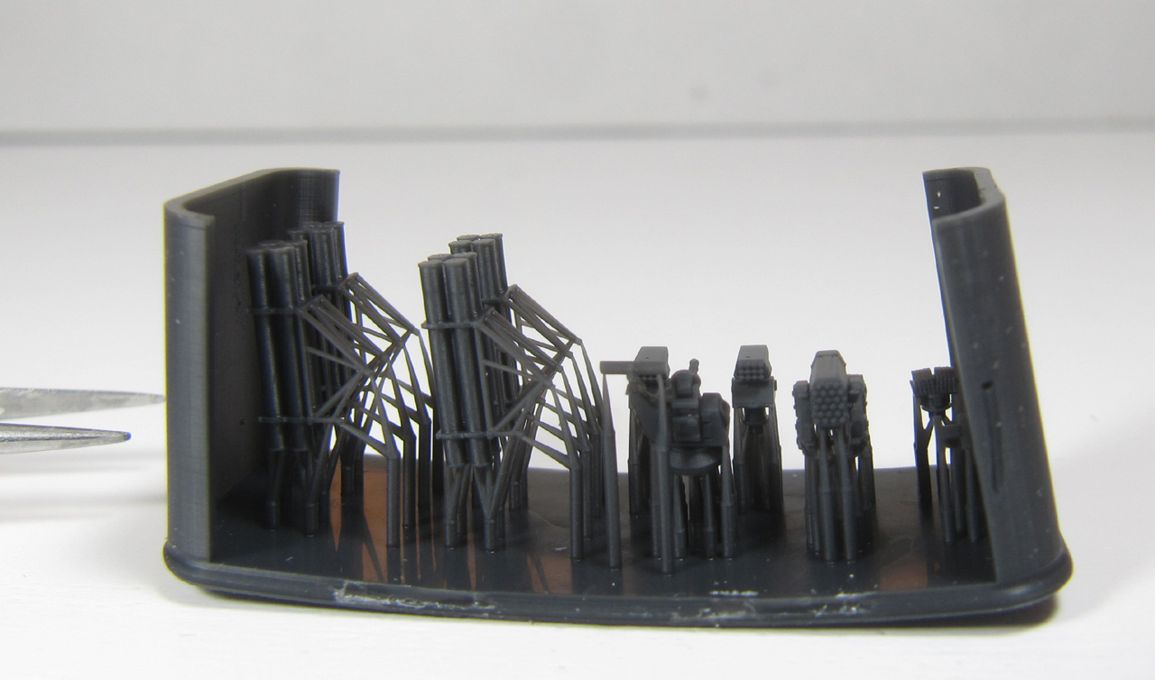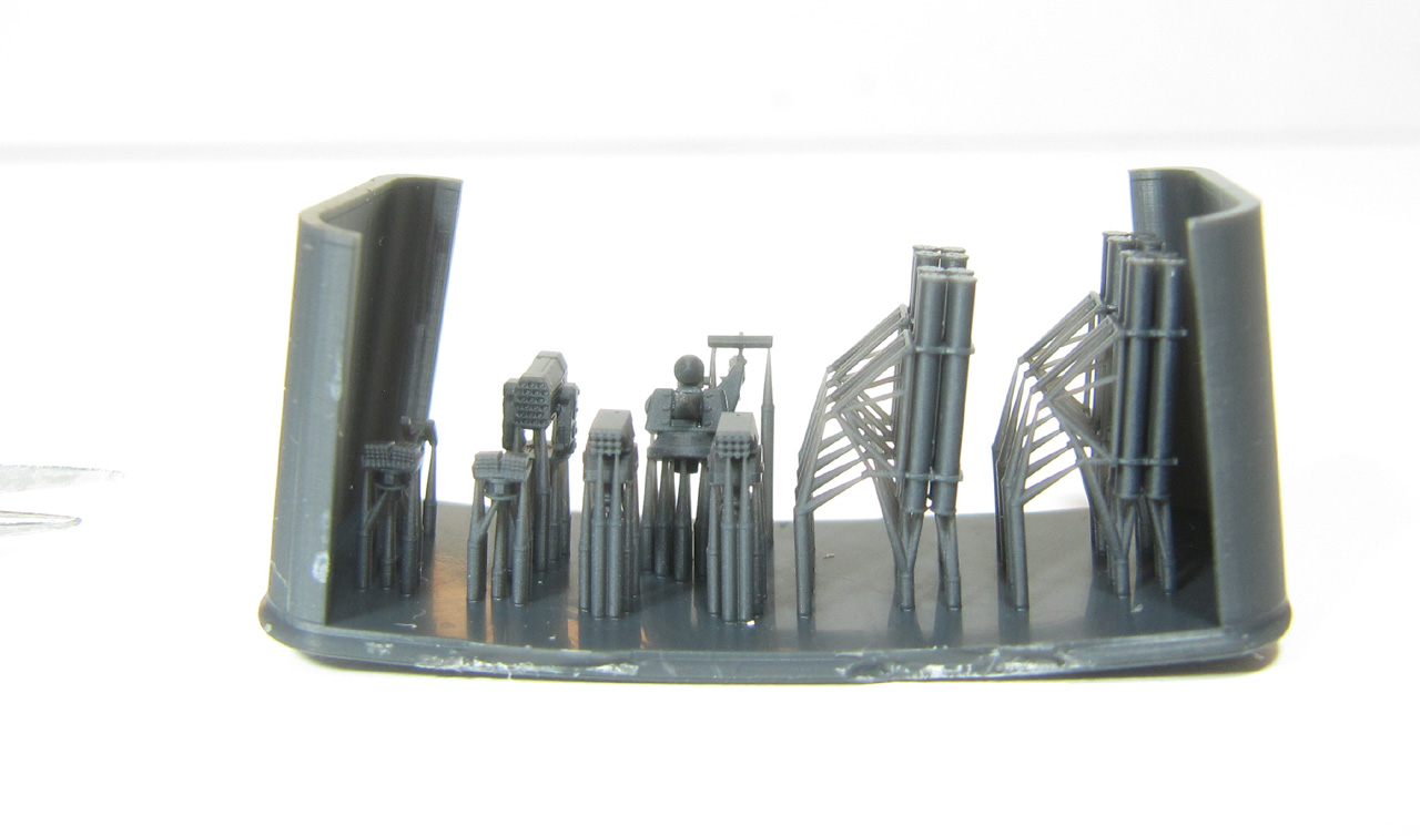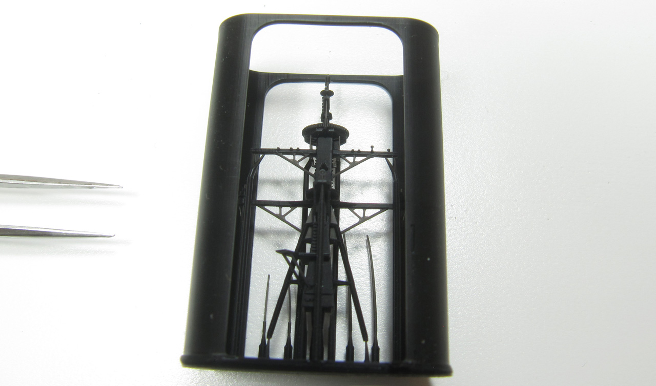 Als 3D-gedrucktes Teil sind u.a. der Mast, SPG-62-Feuerleitradare, der SPS-95K-Radar, die Tankstutzen und die Vorrichtung für das Einschleppen des Bordhubschraubers enthalten. Diese Teile sind in Boxen sorgfältig verpackt und mit Schutzrahmen versehen. Leider sind keine Nummerierungen der Teile am Rahmen aufgedruckt. Der Mast alleine ist z.B. sehr bemerkenswert. Nur durch den 3D-Druck ist so eine Detaillierung als dreidimensionales Teil (im Gegensatz zu zweidimensionalen Fotoätzteilen) möglich. Wenn man den Schutzrahmen entfernt, lässt er sich auch gut von den Stützstrukturen entfernen und am Modell anbringen. Etwas unglücklich ist, dass neben dem Mast auch einige Stabantennen angedruckt sind. Diese sind beim Abtrennen des Masts von Stützstrukturen doch etwas im Weg (mal abgesehen davon, dass sie sich verbogen haben; aber es gibt auch alternative gedrehte Messingteile).