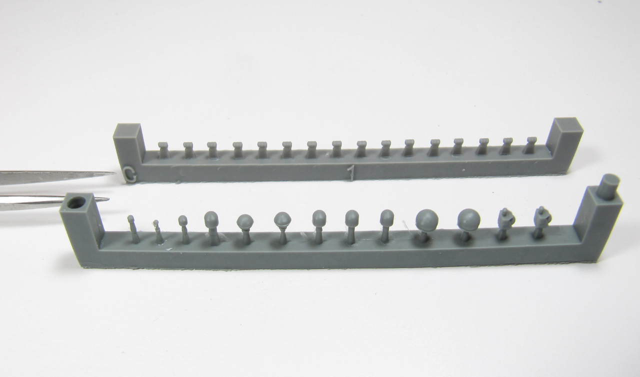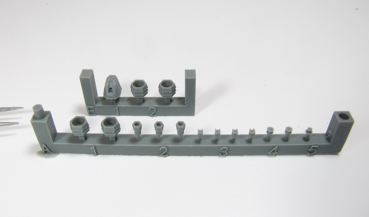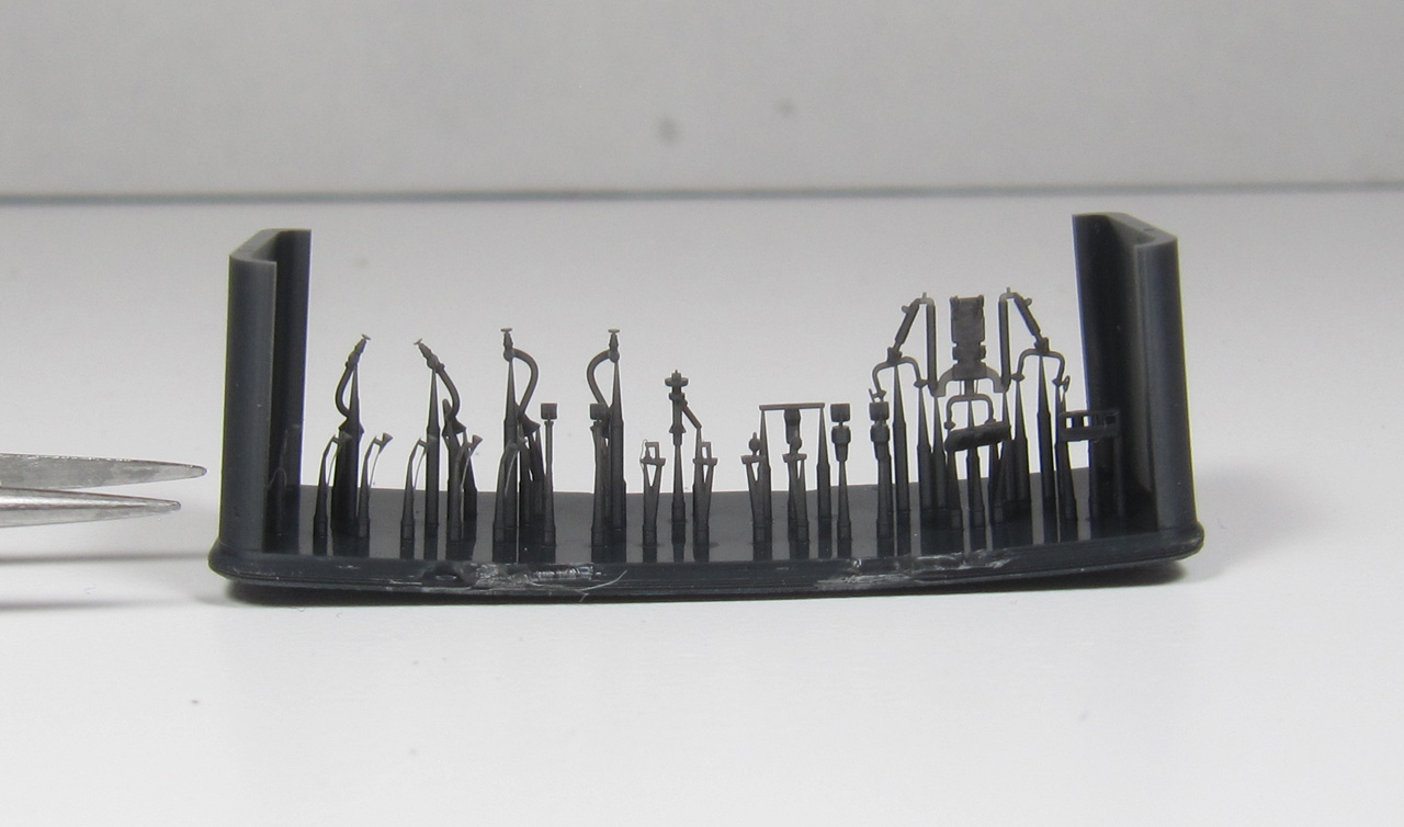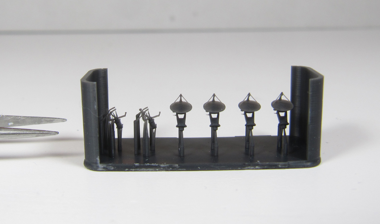 Als 3D-gedrucktes Teil sind u.a. der Mast, SPG-62-Feuerleitradare, der SPS-95K-Radar, die Tankstutzen und die Vorrichtung für das Einschleppen des Bordhubschraubers enthalten. Diese Teile sind in Boxen sorgfältig verpackt und mit Schutzrahmen versehen. Leider sind keine Nummerierungen der Teile am Rahmen aufgedruckt. Der Mast alleine ist z.B. sehr bemerkenswert. Nur durch den 3D-Druck ist so eine Detaillierung als dreidimensionales Teil (im Gegensatz zu zweidimensionalen Fotoätzteilen) möglich. Wenn man den Schutzrahmen entfernt, lässt er sich auch gut von den Stützstrukturen entfernen und am Modell anbringen. Etwas unglücklich ist, dass neben dem Mast auch einige Stabantennen angedruckt sind. Diese sind beim Abtrennen des Masts von Stützstrukturen doch etwas im Weg (mal abgesehen davon, dass sie sich verbogen haben; aber es gibt auch alternative gedrehte Messingteile).