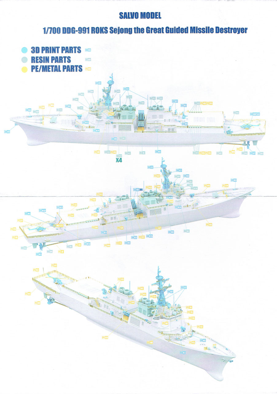Dieser Bausatz des südkoreanischer Lenkwaffenzerstörers Sejong Daewang von Salvo Model zeichnet sich durch erstklassige Resinteile (sowohl gegossen als auch 3D-gedruckt) aus, die sehr gut detailliert und vorbildgetreu sind. Der Bausatz gehört in dieser Hinsicht sicher zu den besten, die aktuell von modernen Marineschiffen im Maßstab 1/700 erhältlich sind. Die Anleitung ist leider nicht auf diesem Niveau. Mit etwas Fotorecherchen dürfte man auch mit dieser Anleitung klar kommen. Die Bausätze von Salvo Model sind aktuell etwas schwierig zu bekommen und werden oft auch sehr teuer angeboten. Wegen der Qualität der Teile ist der Bausatz