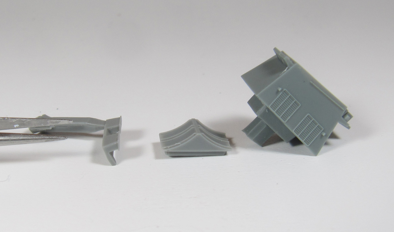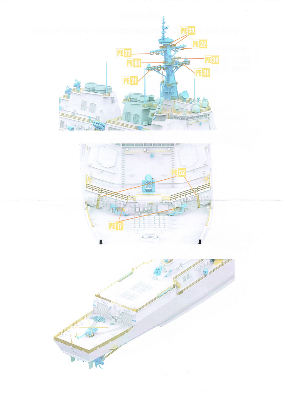 Aus gegossenen Resin sind noch der vordere Schornstein, eine Plattform für die Signalflaggen und die Abweiser für den Ausstoß der Motoren der Anti-Schiffsraketen sowie Rahmen mit dem 12,7-cm-Geschützturm, Teilen für die Schornsteine, Kisten, Spille, diverse Antennen und Rettungsinseln enthalten. Diese Teile sind auch sehr gut gegossen.