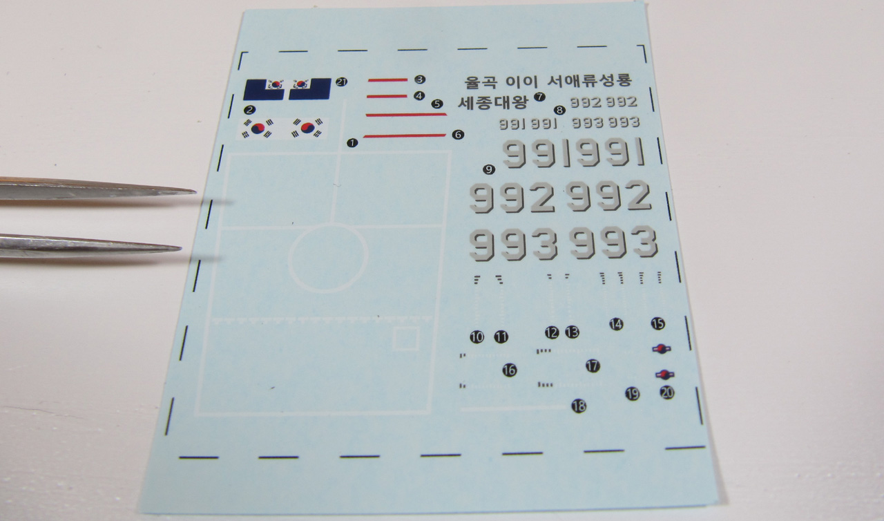 Die Abziehbilder umfassen die Kennnummern für die drei Schiffe des ersten Los - Sejong Daewang, Yulgok Yi I und Seoae Ryu Seong-ryong. Dazu gibt es Markierungen für den Bordhubschrauber, Flaggen, Ahminge...