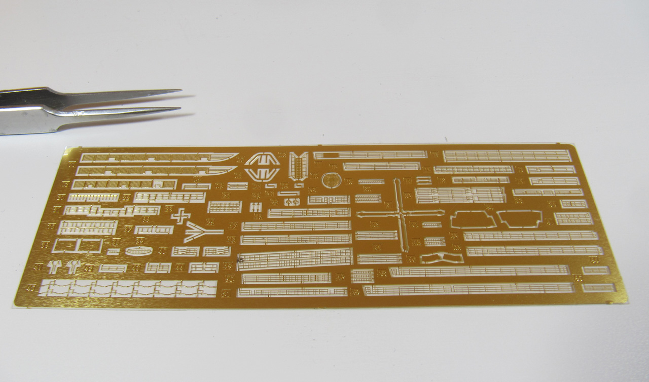 Die Anleitung umfasst einige dreidimensionale Zeichnungen, auf denen die Positionen der Teile markiert sind (abgesehen von den gedrehten Stabantennen aus Messing). Hier muss man etwas suchen, bis man die Positionen der verschiedenen Teile findet. Zum Teil sind die Teile auch sehr klein dargestellt, so dass es etwas unklar ist, wie diese montiert und insbesondere gefaltet werden sollen (z.B. die Gestelle für die Rettungsinseln). Auf den Zeichnungen sehe ich auch sechs MG und Ankerketten - diese Teile sind aber nicht im Bausatz enthalten. Ein weiteres Problem ist, dass bei den Resin- und Fotoätzteilen Nummern auf den Rahmen bzw. der Platine angegeben sind, aber bei den 3D-gedruckten Teilen keine Nummern an den Rahmen zu finden sind.