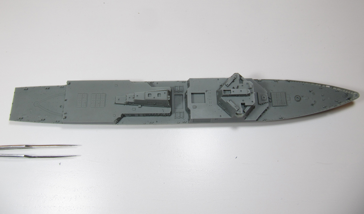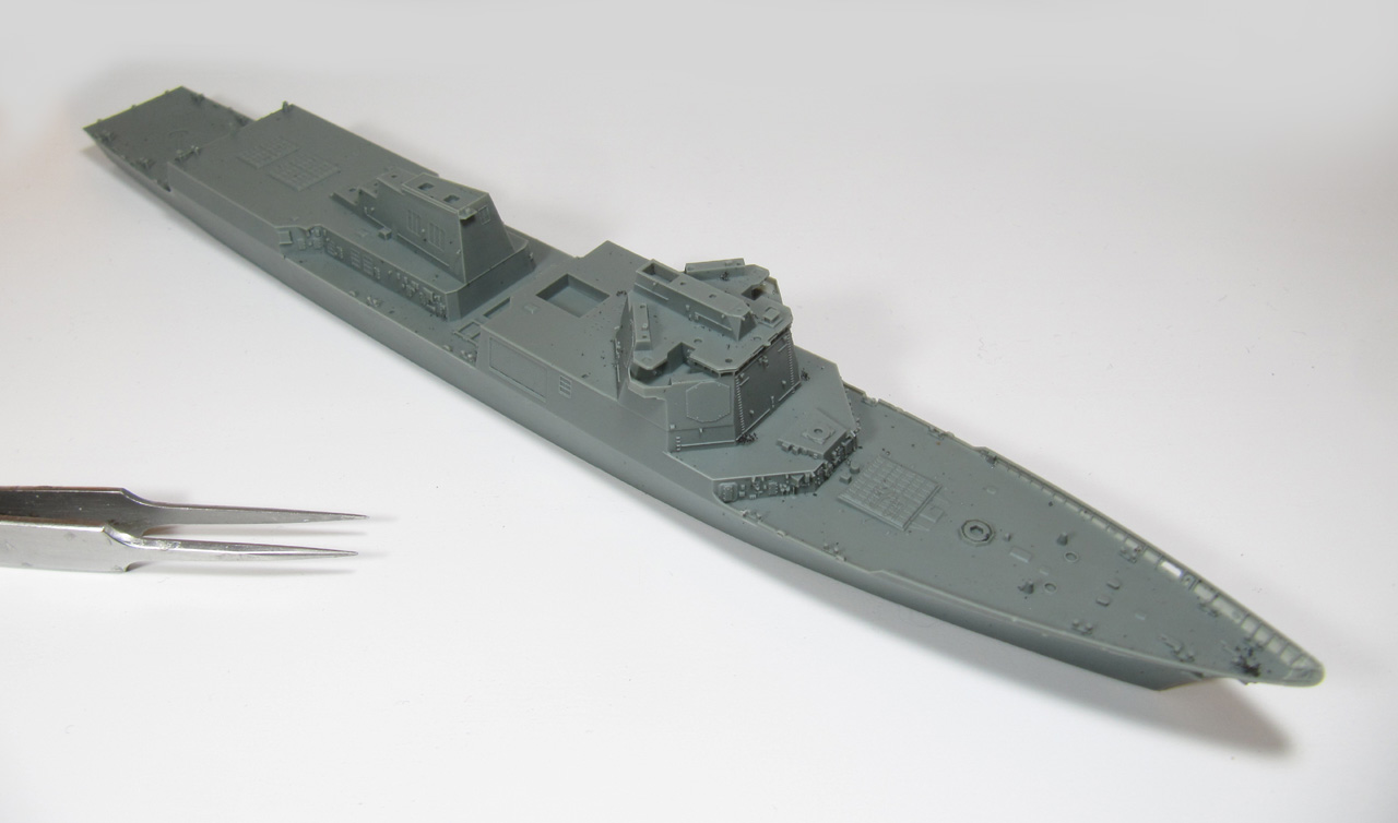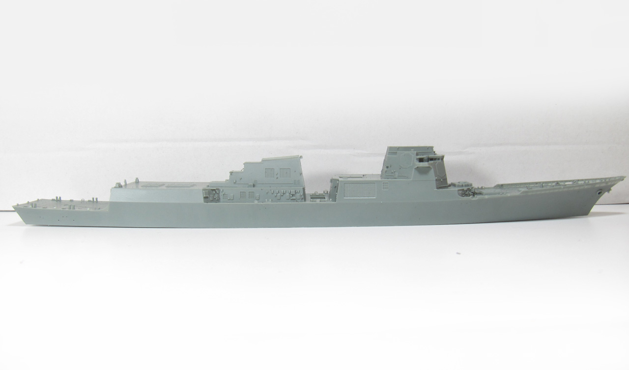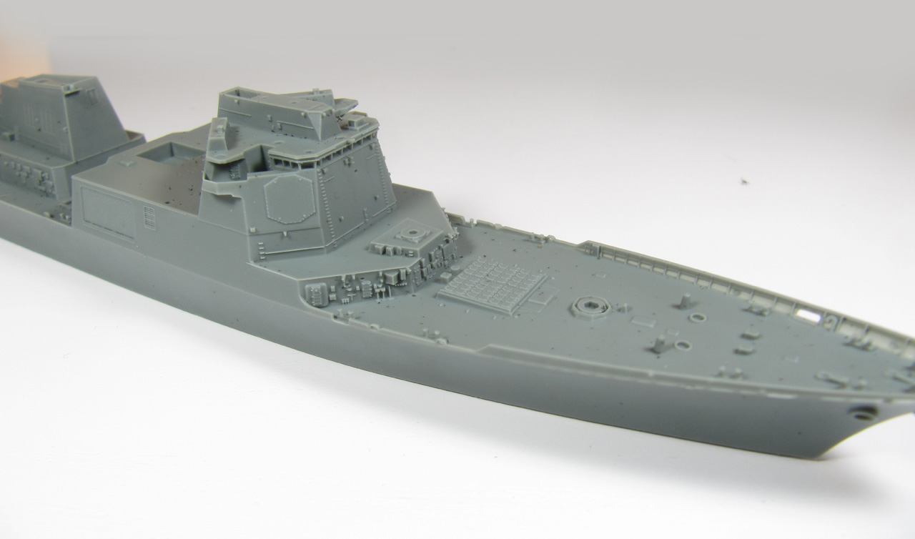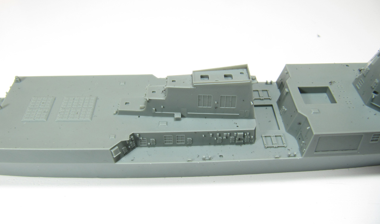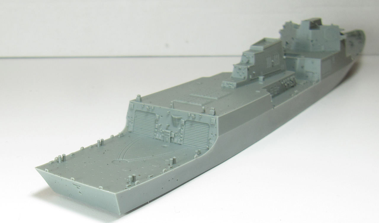Der Rumpf ist mit einem Großteil der Aufbauten als ein Teil gegossen. Die Gussqualität und die Detaillierung sind sehr gut. Von den Form und den Abmessungen ist der Rumpf sehr vorbildgetreu. Um die weiteren Teile richtig positionieren zu können, sind passende Vertiefungen vorhanden. Auf dem Hubschrauberdeck sind die Poller ausgefahren dargestellt - auf den Fotos des Originals sind sie praktisch immer eingezogen.