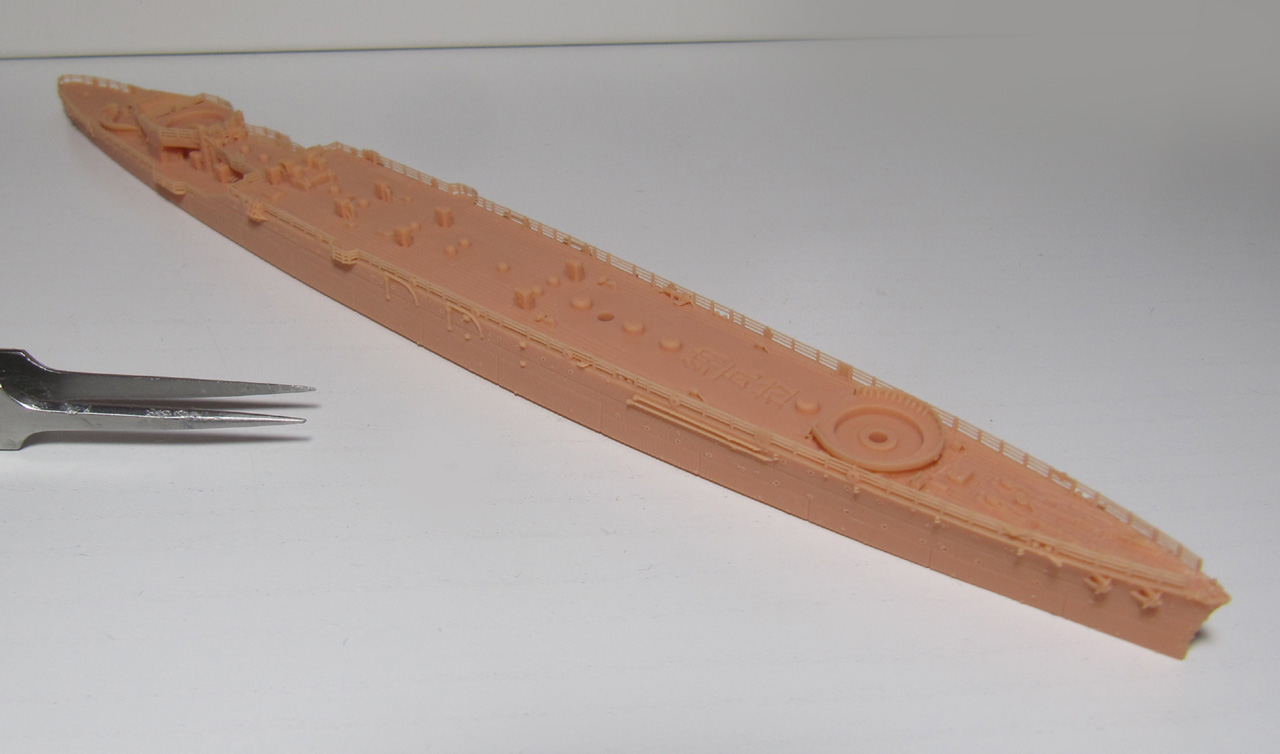 Der Rumpf ist hier nur bis zum Backdeck gedruckt. Der Rumpf ist von den Abmessungen und der Form vorbildgetreu. Die Detaillierung ist aber teilweise etwas grob, so sind die Gravuren für die Decksplanken relativ stark und die Gravuren an den Rumpfseiten sind stark übertrieben - bei Original wirken die Rumpfseiten glatt. Eine Reling ist angedruckt, aber relativ dick. Sehr merkwürdig ist ein massives, rundes Loch unterhalb des Ankers auf der Backbordseite (ist auf den Fotos nicht zu sehen, da es mir erst nach dem Fotografieren aufgefallen ist). Dieses Loch sieht man auch auf den Werbefotos auf eBay, auch etwas auf dem Titelbild ganz oben. Mir ist schleierhaft, was einen solchen Fehler in den Dateien verursachen kann. Man wird es verfüllen/verspachteln müssen, ohne den Anker und die Bullaugen in der Nähe zu beschädigen Bei meinem Exemplar beginnt sich der Rumpf etwas zu verbiegen (Bug und Heck nach unten). Es gibt unten im Rumpf eine Vertiefung, in die man ein Metallteil zu Stabilisierung des Rumpfs einkleben kann.