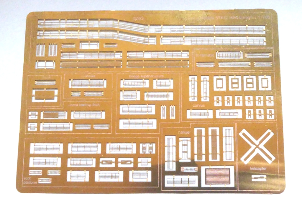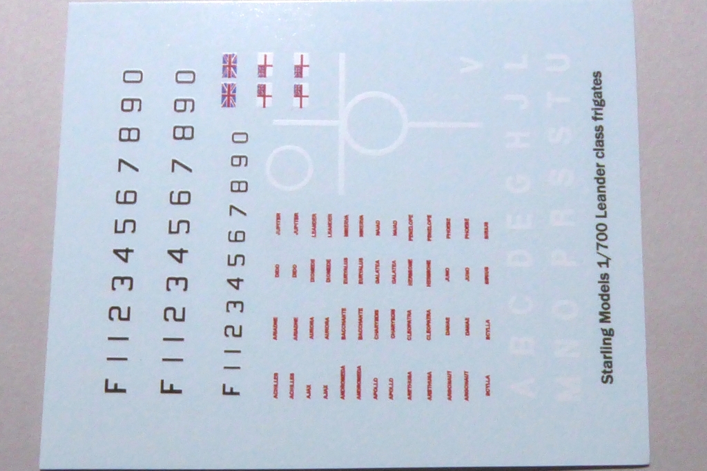 Der Bogen mit den Abziehbildern ist der gleiche wie für Andromeda. Er liefert Zahlen für die Bildung der Rumpfnummer, Buchstaben zur Bildung der Fliegerkennung, die Landedecks-Markierungen und Namensschilder für alle 26 Schiffe der Klasse.