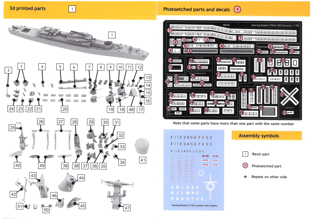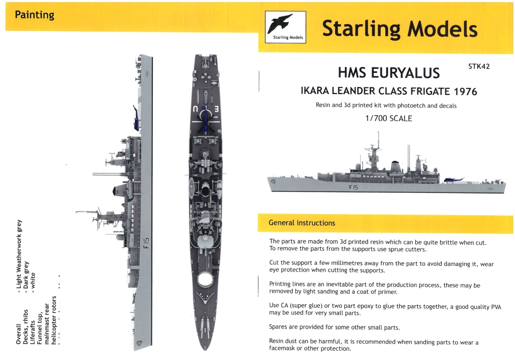 Nach dem Modell der HMS Andromeda als Exocet-Version mit Seawolf-Starter von 1982 hat der britische Hersteller Starling Models jetzt eine Ikara-Version der Leander-Klasse herausgebracht. Der Bausatz besteht hauptsächlich aus 3D-gedruckten Resinteilen, die sich (außer dem Rumpf) auf vier Trägern befinden. Alle Teile sind scharfkantig und sauber ausgeformt und reichlich detailliert, entsprechen also zeitgemäßen hohen Qualitätsstandards.