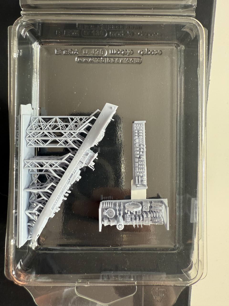 In der Schachtel finden sich zunächst drei 3D-gedruckte Teile. Dies sind zum einen der vollständige Rumpf mit dem größten Teil der Aufbauten und zwei 3D-Drucke mit diversen Kleinteilen. Diese Teile sind zum Schutz in einer Klarsichtbox verpackt, in der die Teile mit doppelseitigem Klebeband fixiert sind. So kann nichts herumfliegen und beschädigt werden.