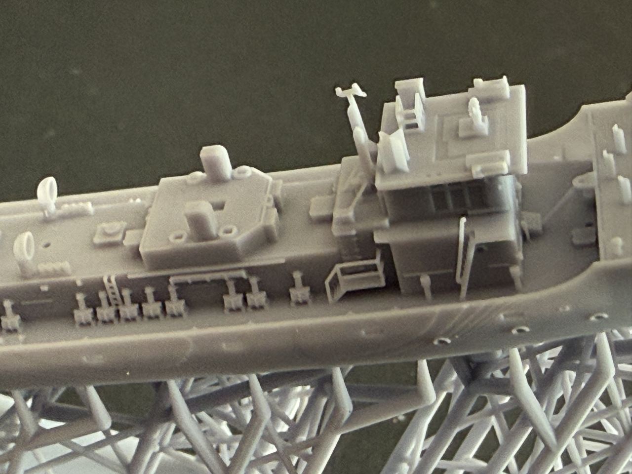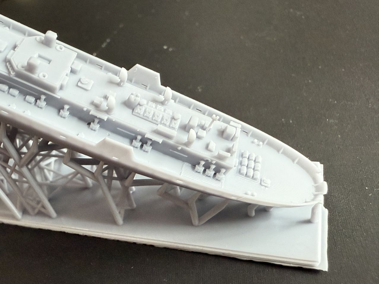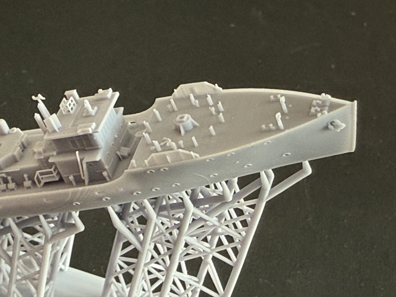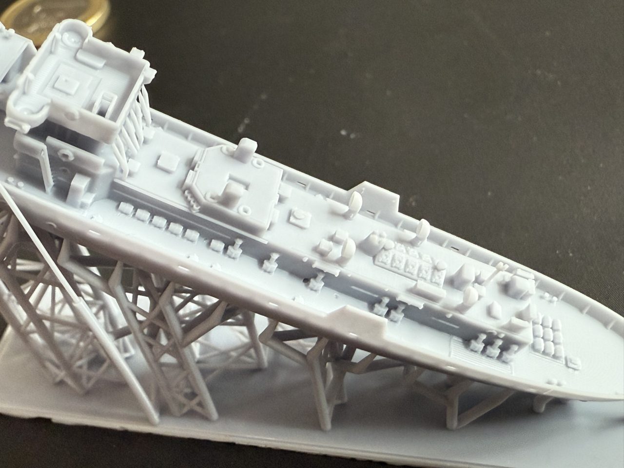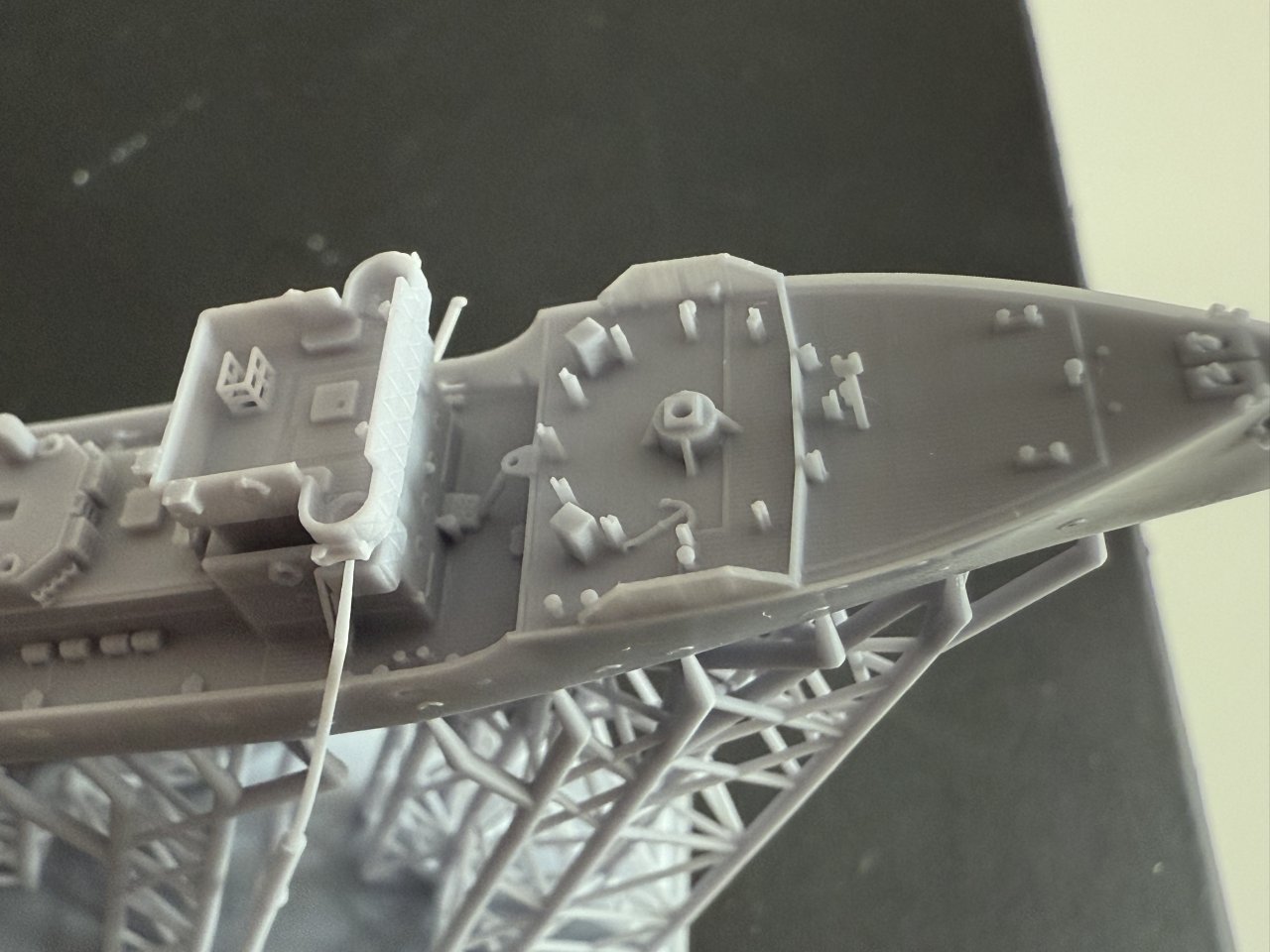 Die Qualität der Drucke ist überragend. Die Details auf dem Rumpf, der mitsamt den Supportstrukturen ausgeliefert wird, sind unglaublich fein und zum Teil sind die Relingstrukturen an Niedergängen mitgedruckt. Beide Varianten unterscheiden sich, entsprechend dem Original, in den Aufbauten. Eine Vollrumpfversion ist nicht vorgesehen, d.h. es liegt kein Unterwasserschiff bei. Die Schiffe können demnach eher im Hafen liegend oder bei ruhiger See dargestellt werden. Dynamische Szenen, bei stürmischer See, sind somit nur durch eine Ergänzung des Unterwasserschiffes dargestellt werden. Hier ist Eigeninitiative gefragt. Aber vielleicht bietet Black Cat zukünftig auch Vollrumpfversionen, wie bei den entsprechenden Modellen im Maßstab 1/350, an.
