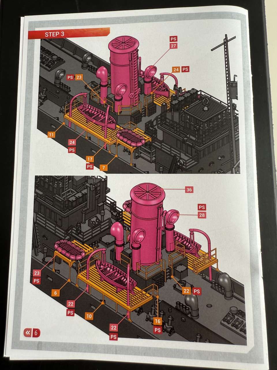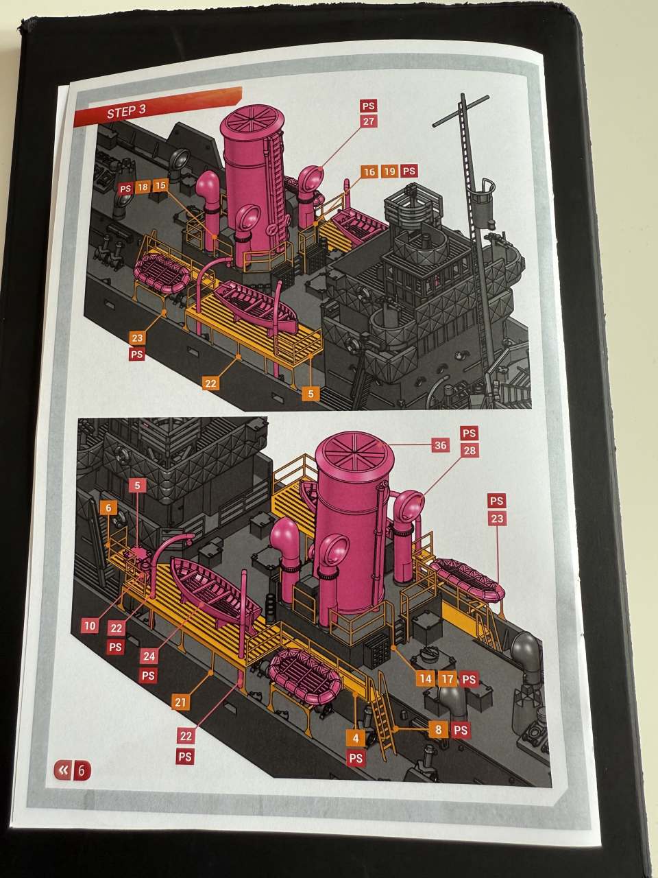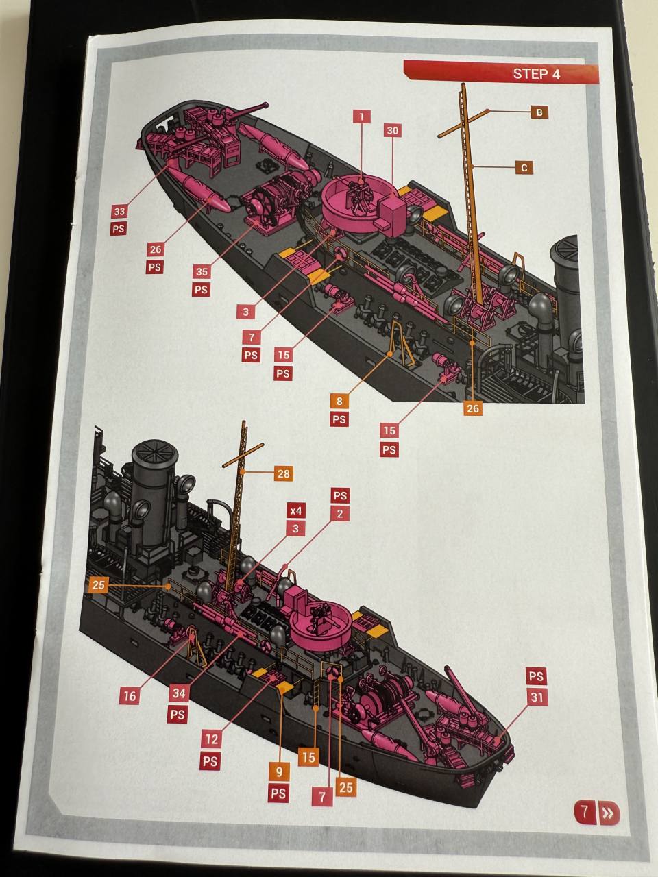 Weiterhin finden sich hier verschiedene Hinweise zur Verarbeitung der Teile. So vorbereitet folgt auf den nächsten vier Seiten der Bauplan, der aufgrund der Farbunterteilung der zu verbauenden Teile, keine Fragen offen lässt. Auf der letzten Seite endet dann der Bauplan mit einem Bemalungsplan des Schiffes, jeweils in einer Draufsicht, einer Backbord- und Steuerbordansicht und einer Bug- und Heckansicht.