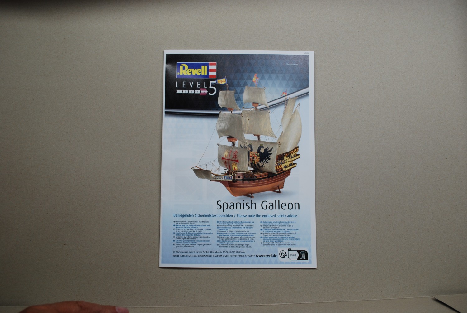 Mit neuem Deckelbild erscheint die altbekannte „Spanische Galeone“ von Revell . Allseits bekannt ist der Umstand das dieser Bausatz mit wenigen Änderungen auch als englisches Man'O War in die Ladenregale geschafft hat. Man wundert sich ein wenig das das obligatorische NEW! nicht auf dem Karton steht...Die Boxart wurde neu gestaltet., im Laufe der Bausatzhistorie ist mal das fertige Modell auf dem Karton, dann ein gemaltes Bild, jetzt ist ein recht dynamisches Bild des Schiffes ist bewegter See abgebildet.