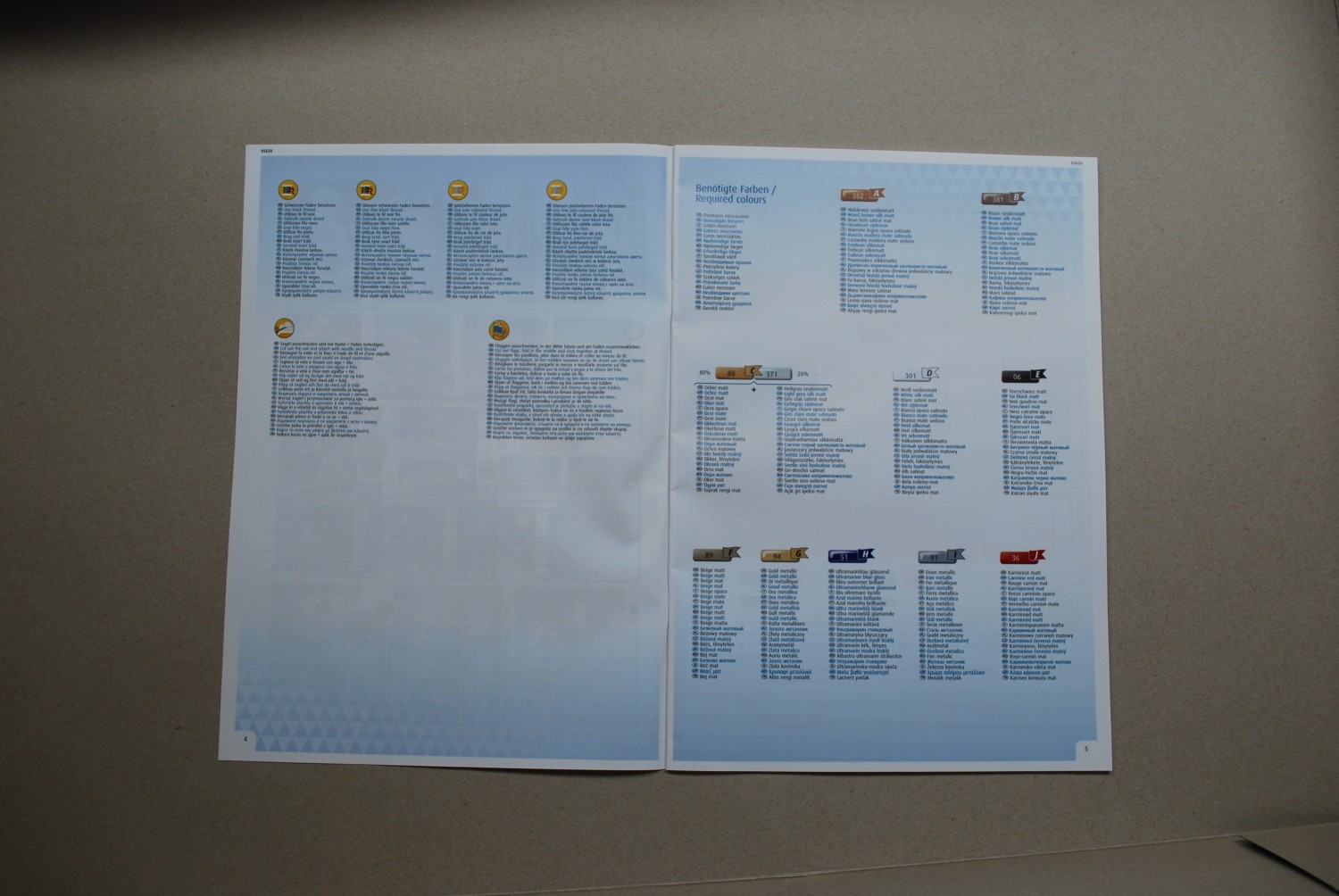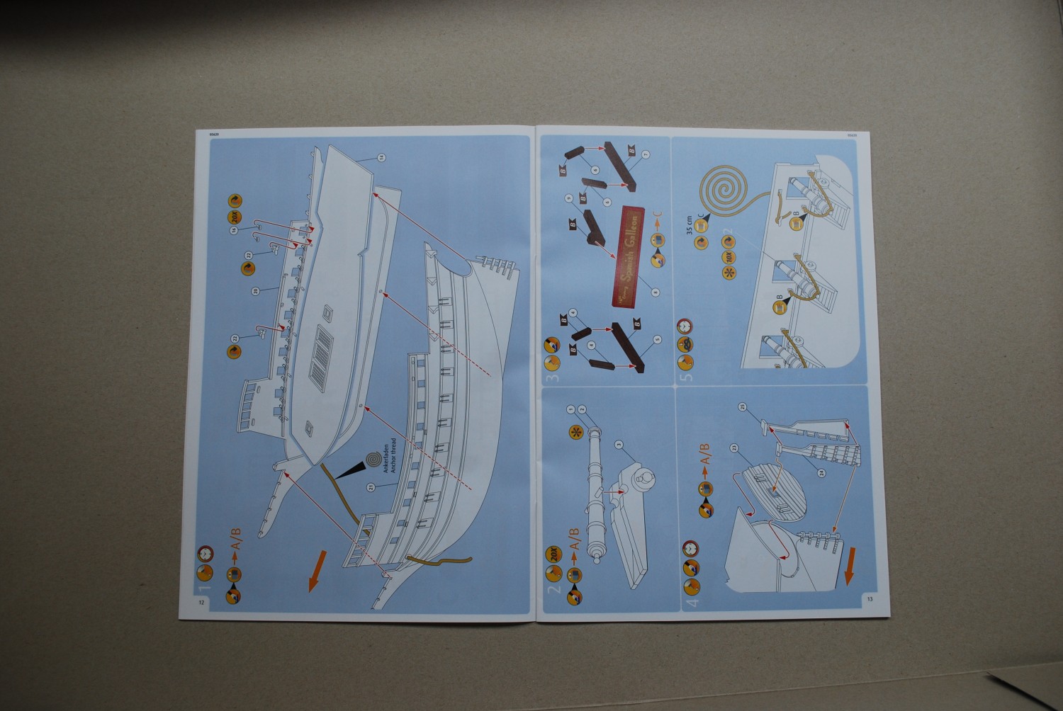 In der seit einigen Jahren üblichen Manier farbig in Heftform gestaltet, ist der Bauplan einfach und übersichtlich. Die Titelseite ziert ein gebautes Modell der Galeone mit dem Hinweis auf einen beiliegenden Sicherheitstext, auf den folgenden Seiten kommen die obligaten Basteltipps, eine Farbliste für das sehr bunte Schiff, die üppige Teileübersicht und der Hinweis auf die Ersatzteilversorgung durch die sehr schnelle und freundliche Abteilung X. Ab Seite 12 geht es dann mit dem Bastelvergnügen los. Zuerst werden bis Seite 23 Rumpf und Deck zusammengefügt und bemalt. Insbesondere die bunten Bordwände sollten vor dem Zusammenbau bemalt werden – es ist einfacher, wenn die Teile flach auf dem Tisch liegen. Ab Seite 23 beginnt die Takelung des Modells mit ersten Arbeiten am Bugspriet, dem schrittweisen Zusammenbau der Masten und dem Einbau der fertigen Baustufen. Auf Seite 30 geht es weiter mit dem Anknoten der ersten Blöcke an die Rahen, dann folgt das schrittweise Anbringen der Stage und Pardunen und schließlich die Takelung des laufenden Gutes zur Bedienung der Rahen und Segel. Wohl der Übersichtlichkeit geschuldet, hat Revell fast jeder Rah eine Baustufe jeweils für Toppnanten, Geitaue und Brassen gewidmet. Ob dies unbedingt so hilfreich ist, sei dahin gestellt. Auf jeden Fall gibt das Seiten im Bauplan. Mit dem Aufbringen der Naßschiebebilder mit Adlern, Löwen und den kastilischen Insignien auf die Segel zur Kennzeichnung der Galeone als königlich-spanisches Schiff beginnt die Takelung der Segeleinrichtung. Die letzte Seite befasst sich noch Bemalvorschlägen für die Kru. Direkt aus dem Kasten gebaut, wäre der Bau der Galeone hier abgeschlossen.