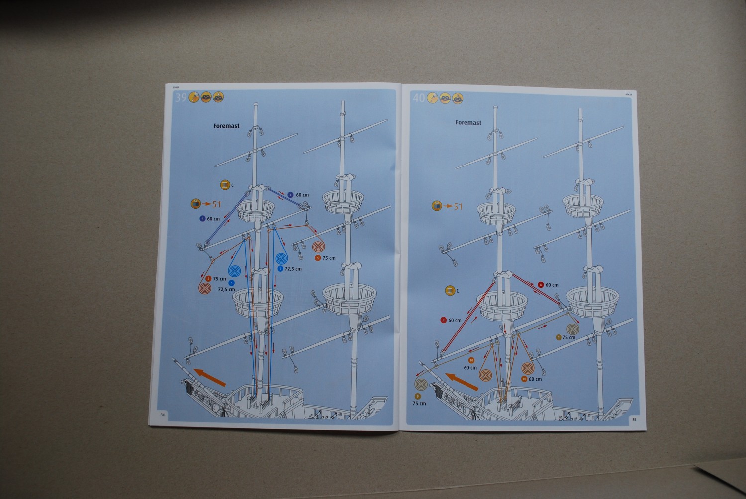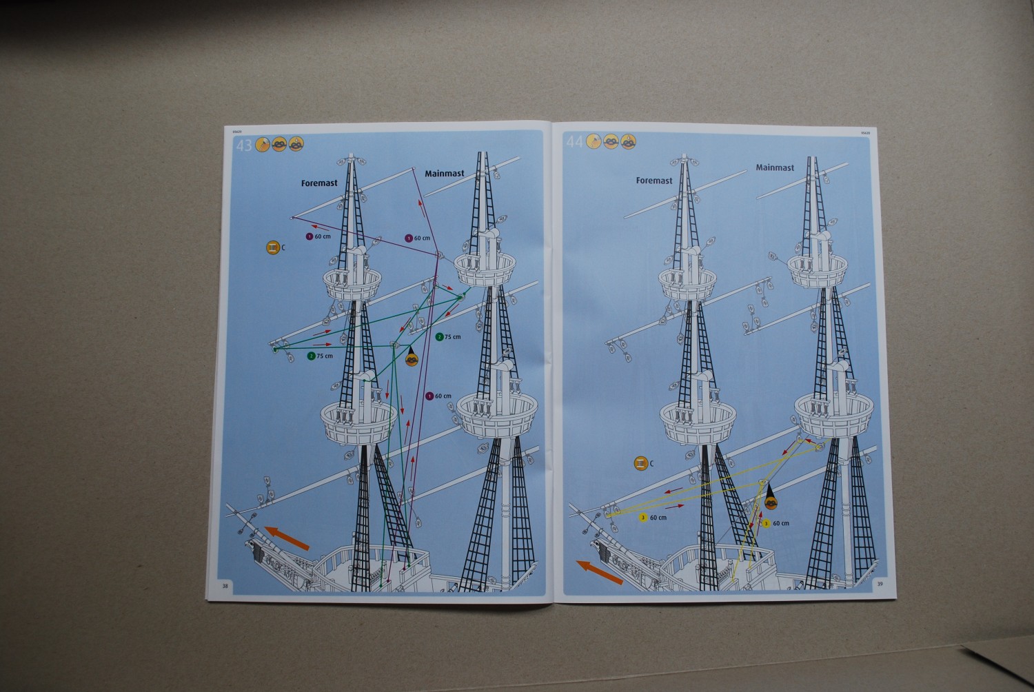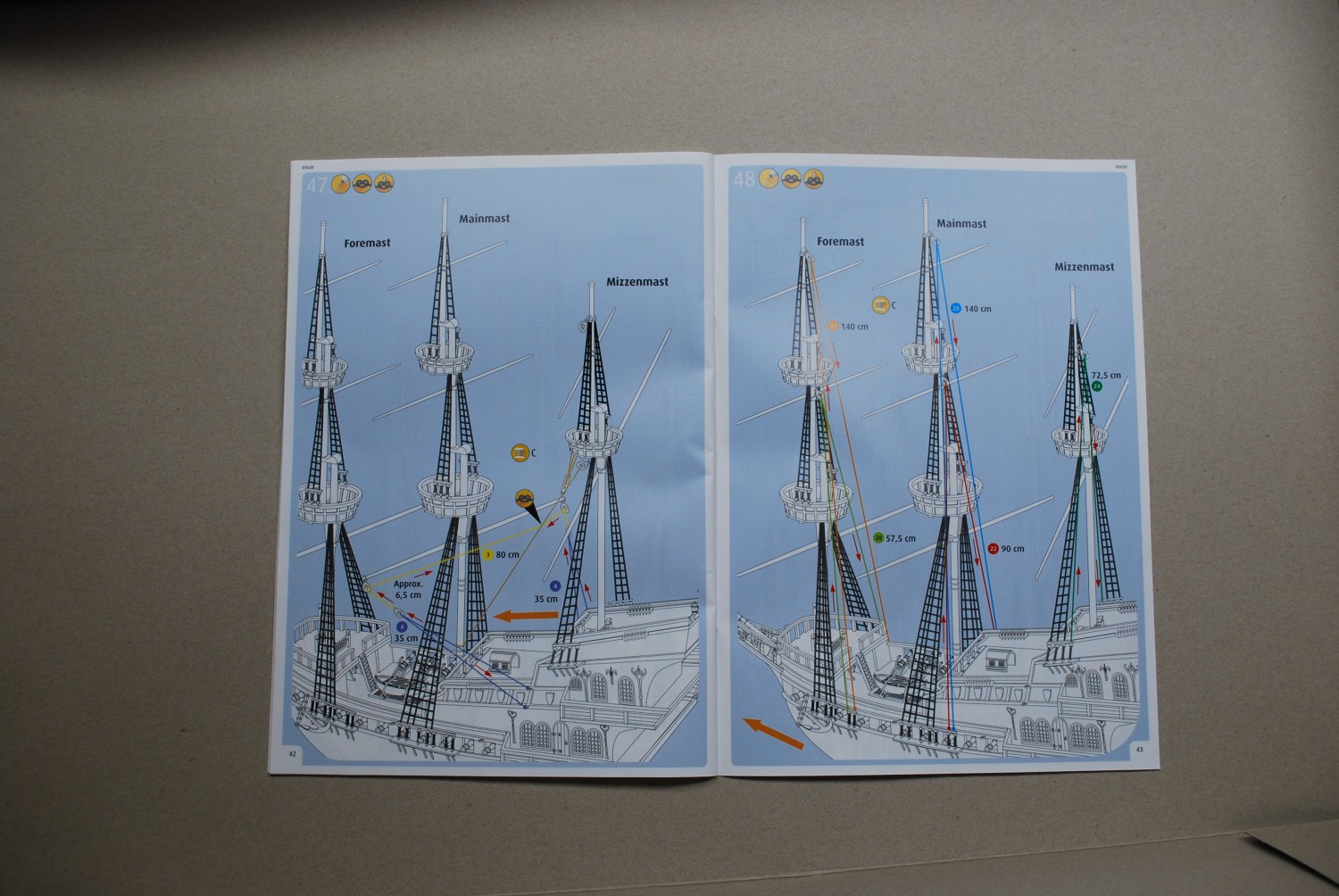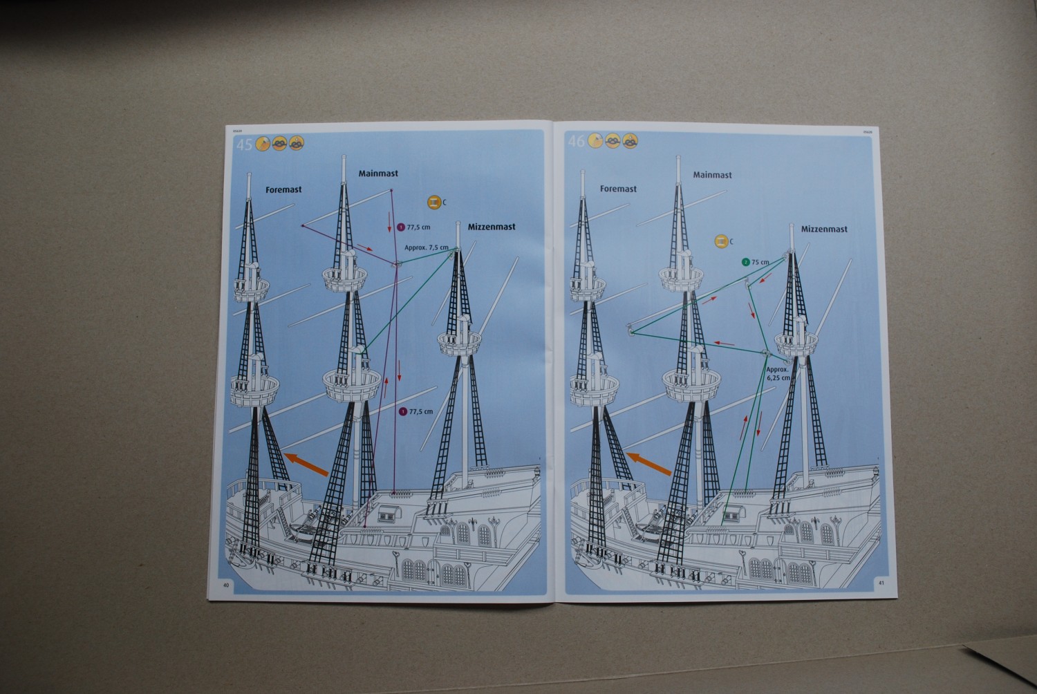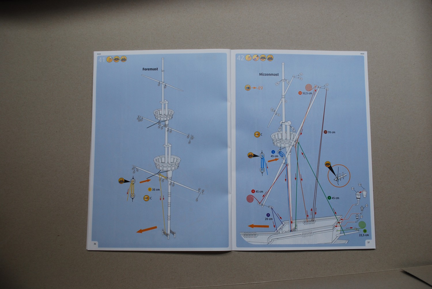 Sehr schade ist, dass an keiner Stelle die Bezeichnungen der Bauteile aufgeführt sind. So wie die Beschreibung des Schiffstyps fehlt, mangelt es auch an der korrekten Benennung der Bau- und Takelagenteile. Wenigstens in der Kopfzeile der Baustufen könnte man erwähnen, was hier gerade getakelt oder gebaut wird.