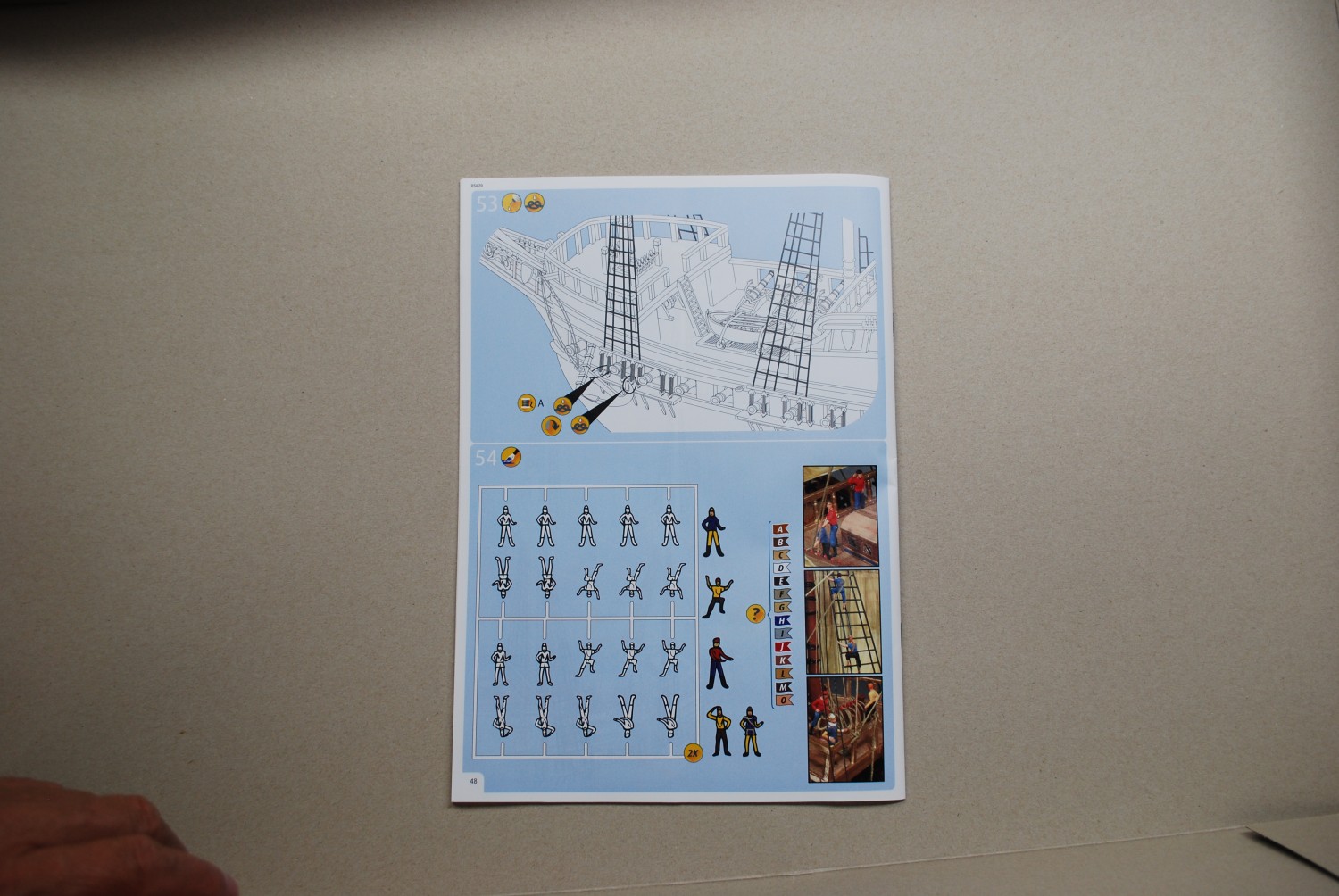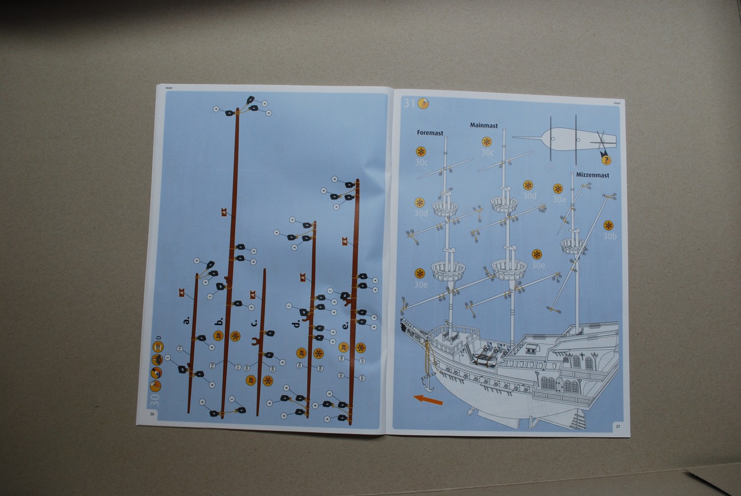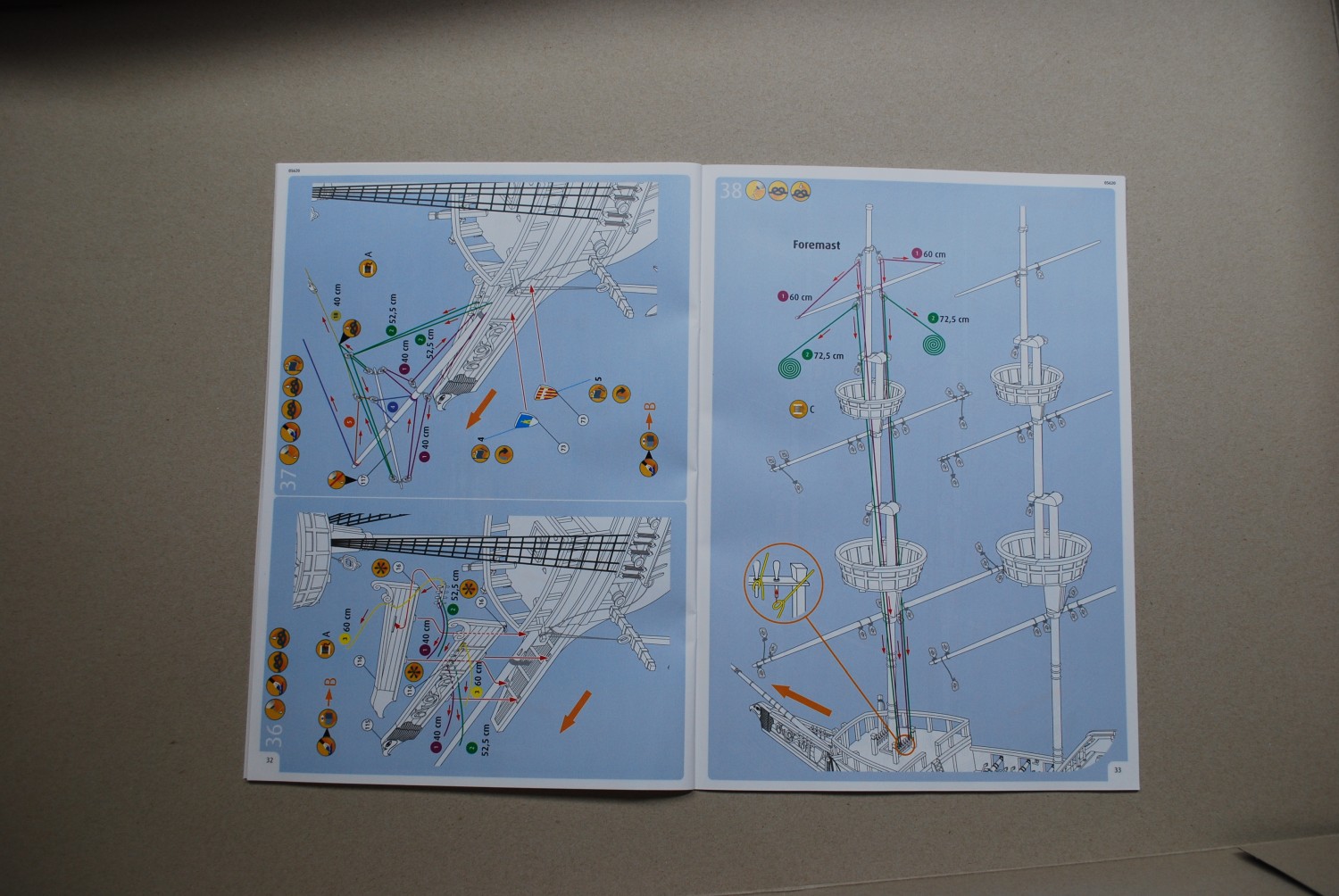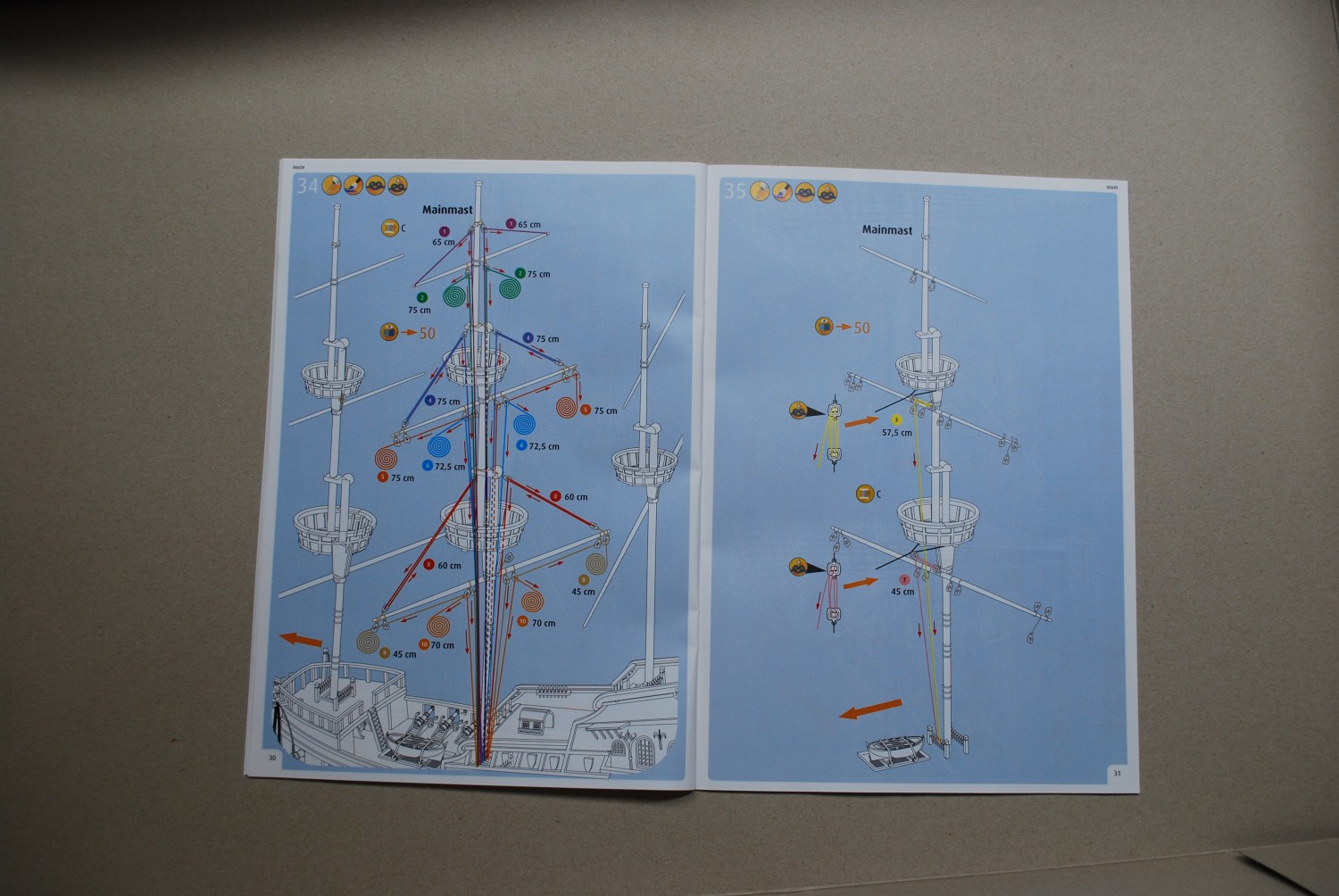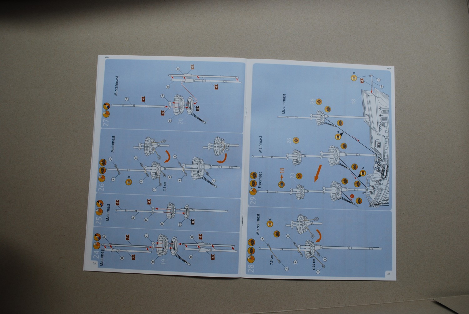 Sehr schade ist, dass an keiner Stelle die Bezeichnungen der Bauteile aufgeführt sind. So wie die Beschreibung des Schiffstyps fehlt, mangelt es auch an der korrekten Benennung der Bau- und Takelagenteile. Wenigstens in der Kopfzeile der Baustufen könnte man erwähnen, was hier gerade getakelt oder gebaut wird.