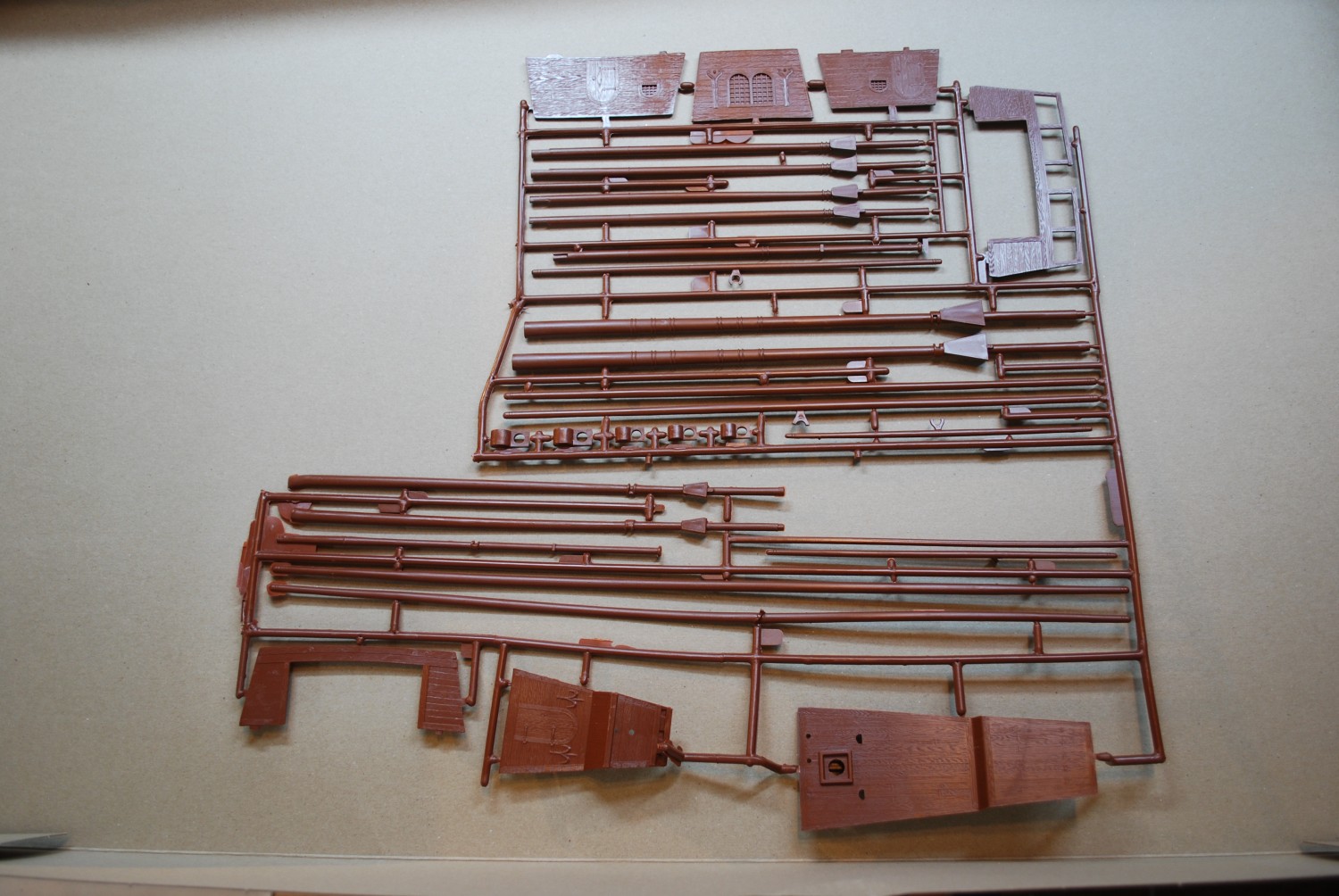 Der Bausatz hat eine Menge Potenzial, selbst aus dem Kasten gebaut wird daraus ein imposanter Zimmerschmuck. Erstaunlich ist das geringe Vorkommen von Fischhaut oder Formversatz bei dem alten Bausatz. Dennoch ist bei einigen Teilen vor dem Bemalen ein wenig Verputzen notwendig. Die Plastikteile haben vielfach eine fein erhabene Holzmaserung; eigentlich ja Quatsch, denn Schiffswände, Decks und andere Holzteile waren relativ glatt und die Maserung des Holzes an nicht bemalten Stellen zwar sichtbar, aber nicht erhaben. Diese Holzstruktur ist letztendlich nur hilfreich bei einer holzähnlichen Bemalung. An den Plankenstößen sind sogar Nagelköpfe als kleine Kringel dargestellt. Auch die kann man natürlich diskutieren, haben doch die meisten Holzschiffe, egal welcher Epoche, einen wie auch immer gearteten Schutzanstrich, der eine Nagelung nahezu unsichtbar macht. Mehrere Fensteröffnungen mit rautenförmigen Fenstergittern im Achterkastell sind leider geschlossen dargestellt. Hier bietet es sich an, die Fenster zu öffnen und mit geätztem Messinggitter aus dem Zubehörmarkt oder selbst gebauten Gittern zu versehen.