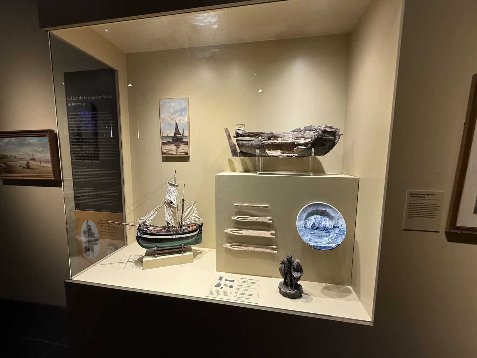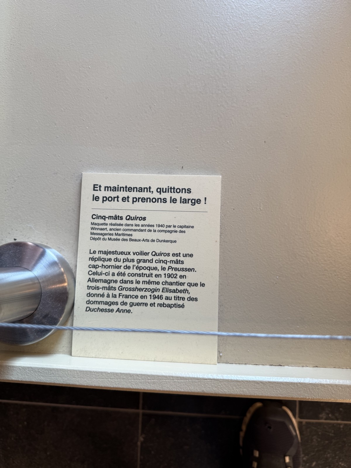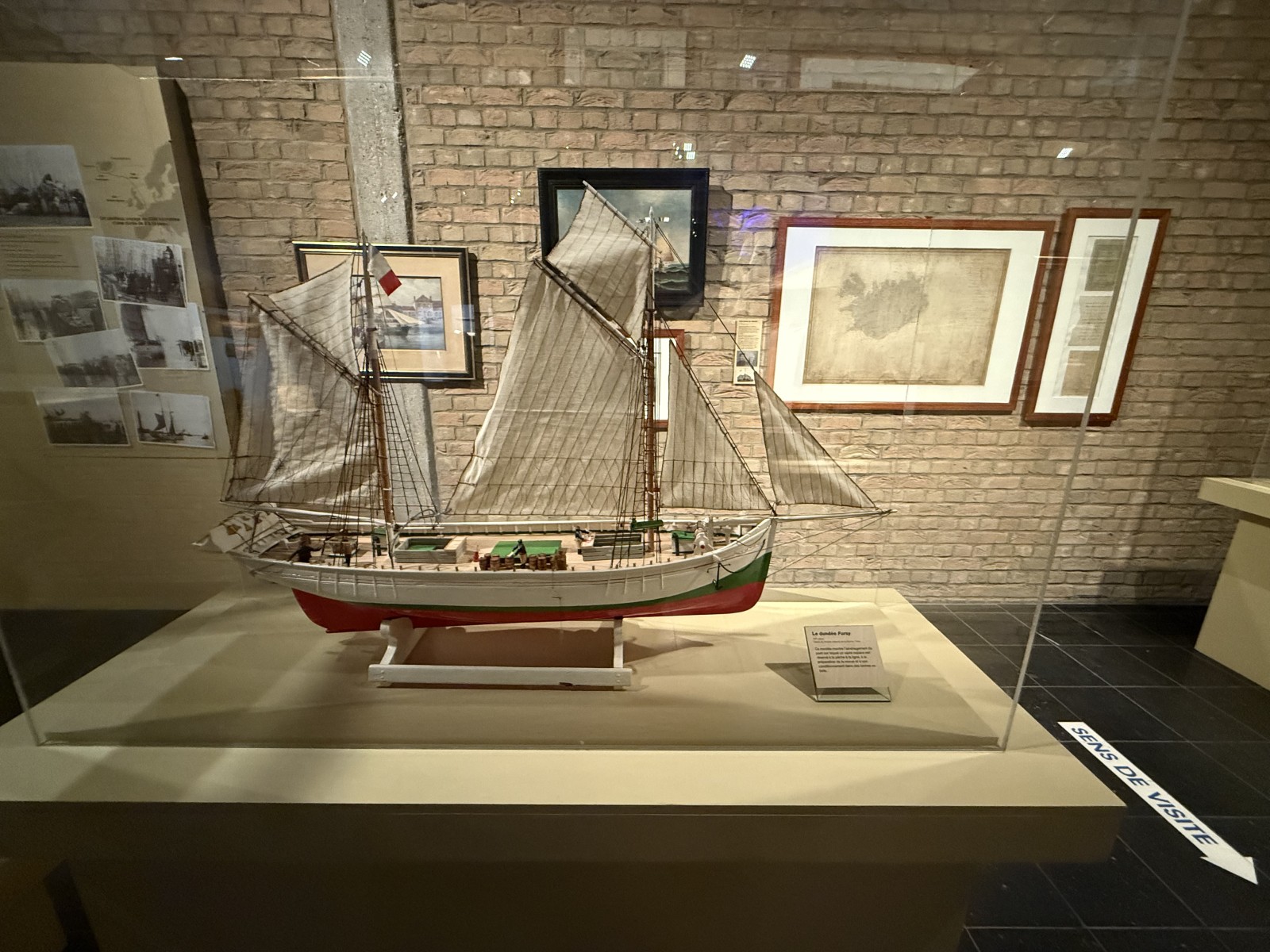 Vor dem Eingang des Museums, liegen einige Museumsschiffe am Kai. Dies sind das Vollschiff Duchesse Anne (die 1901 in Geestemünde gebaute Großherzogin Elisabeth, siehe Fotogalerie), das Feuerschiff Sandettié (1949), der Schlepper Entreprenant (1965), das Lotsenboot Pilotine n° 1 (1965) und das Binnenschiff Guilde. Aus Zeitgründen konnte ich die Schiffe leider nicht besuchen. In dem Museum finden sich über drei Stockwerke verteilt viele Modelle von Schiffen aus der Zeit des 19.-21. Jahrhunderts. Hierbei konzentriert sich das Museum im Wesentlichen auf die Handelsschifffahrt und den Fischfang. Begleitet werden die Modelle von vielen interessanten maritimen Schaustücken und Hinweistafeln.