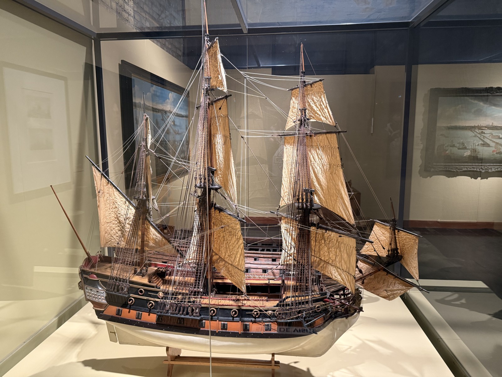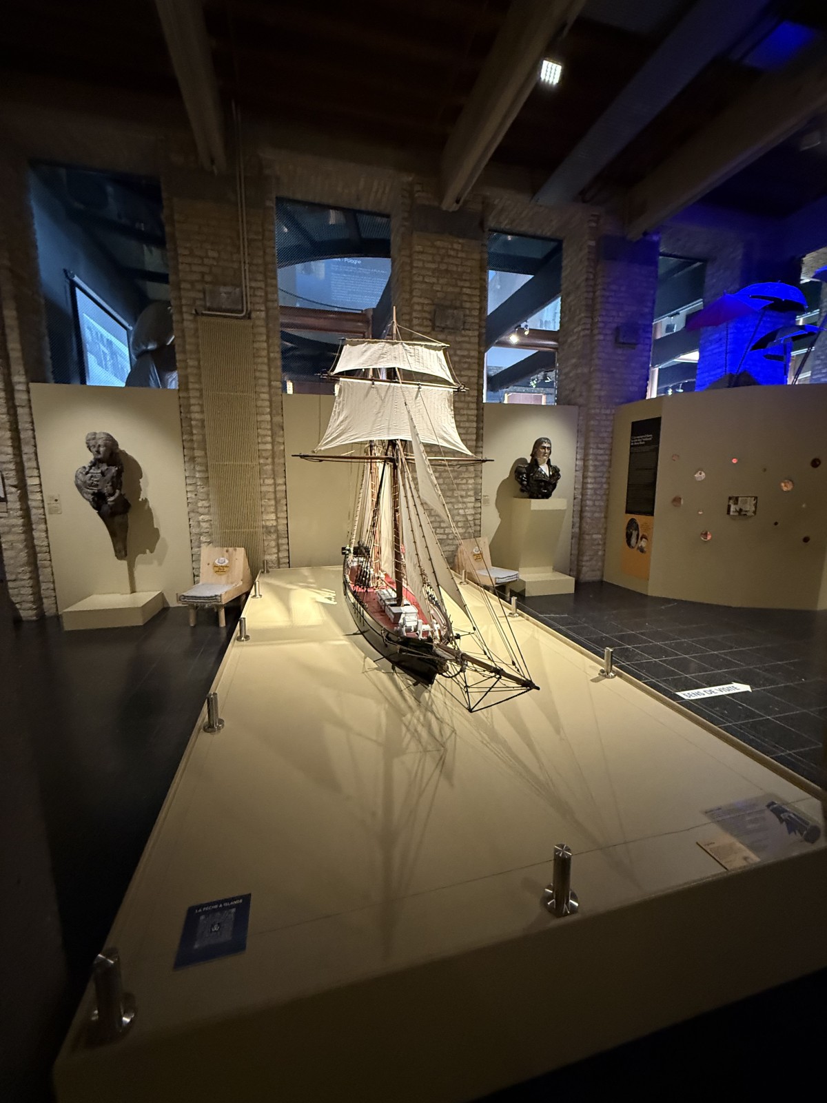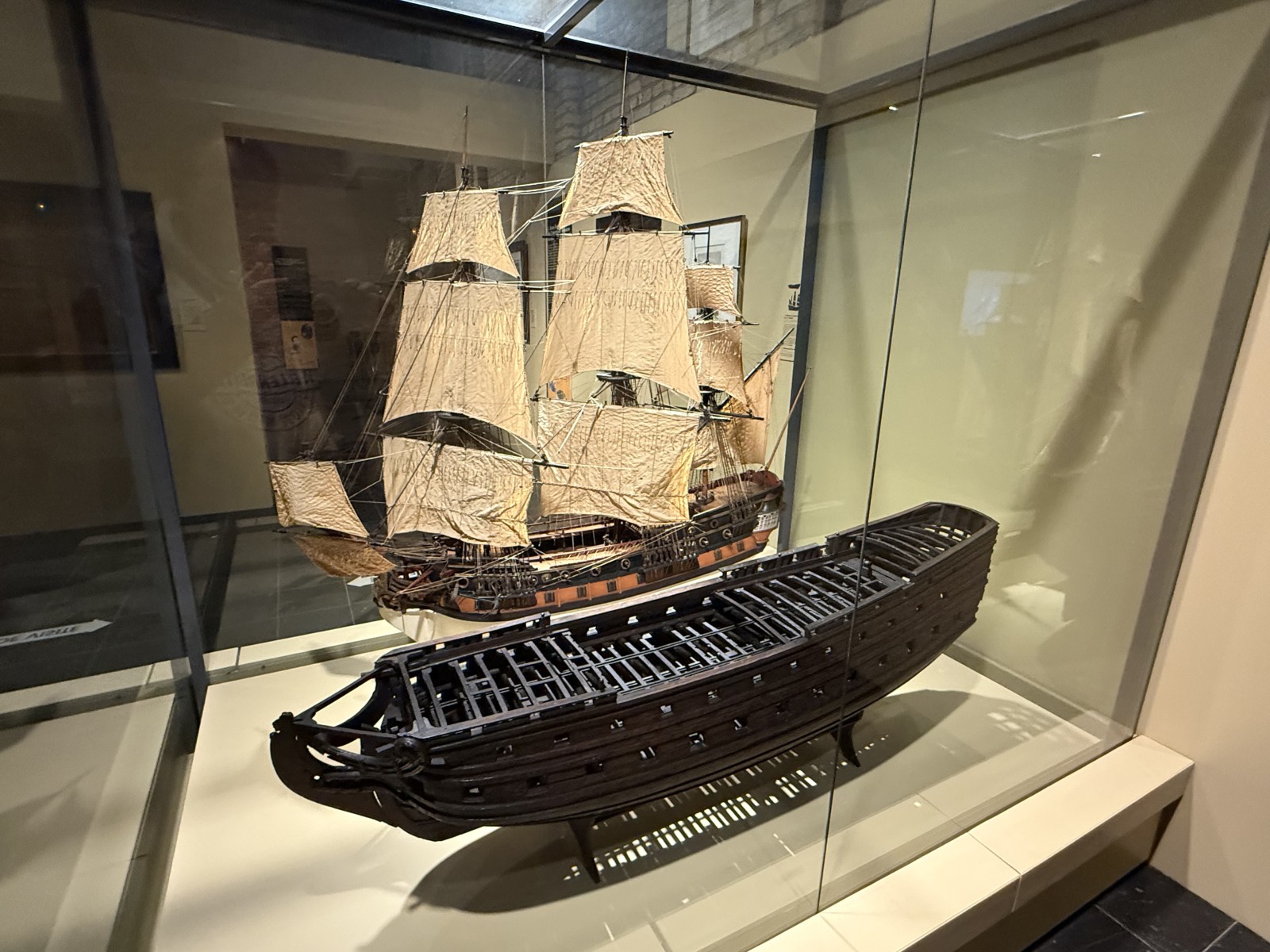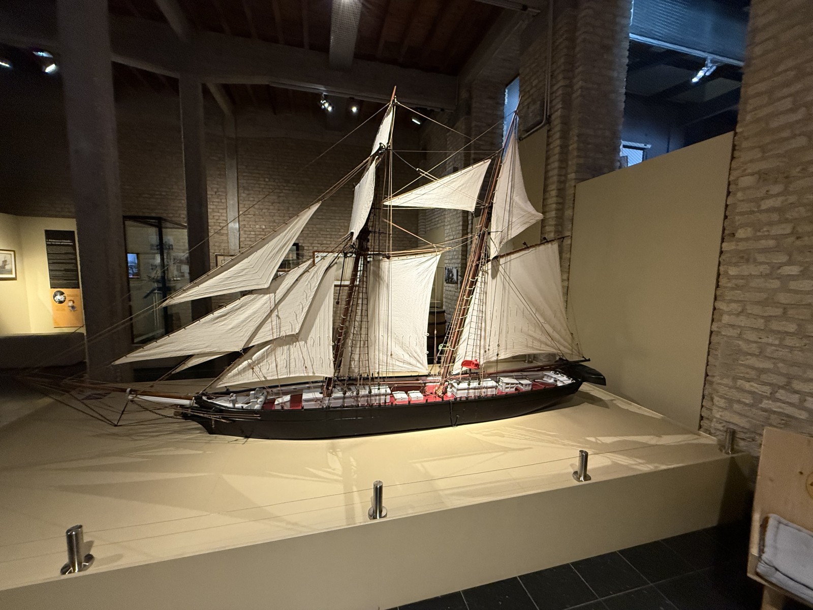 Vor dem Eingang des Museums, liegen einige Museumsschiffe am Kai. Dies sind das Vollschiff Duchesse Anne (die 1901 in Geestemünde gebaute Großherzogin Elisabeth, siehe Fotogalerie), das Feuerschiff Sandettié (1949), der Schlepper Entreprenant (1965), das Lotsenboot Pilotine n° 1 (1965) und das Binnenschiff Guilde. Aus Zeitgründen konnte ich die Schiffe leider nicht besuchen. In dem Museum finden sich über drei Stockwerke verteilt viele Modelle von Schiffen aus der Zeit des 19.-21. Jahrhunderts. Hierbei konzentriert sich das Museum im Wesentlichen auf die Handelsschifffahrt und den Fischfang. Begleitet werden die Modelle von vielen interessanten maritimen Schaustücken und Hinweistafeln.