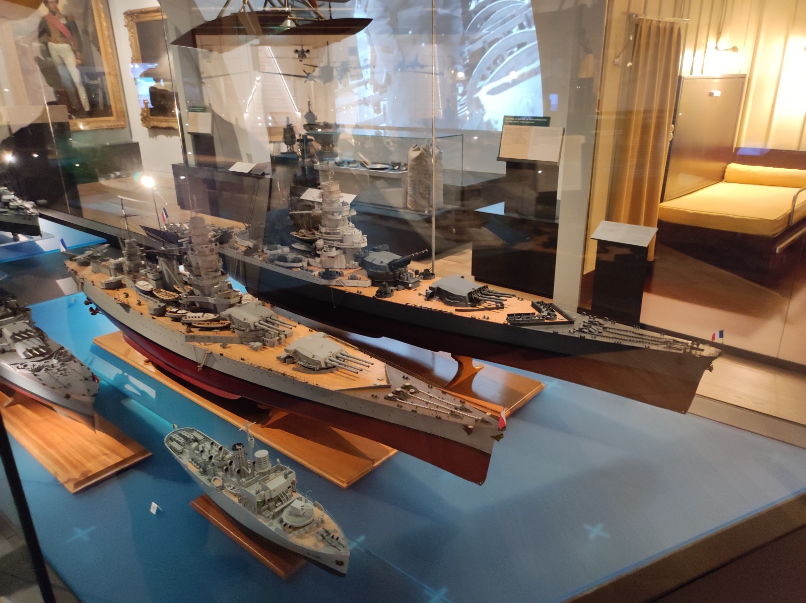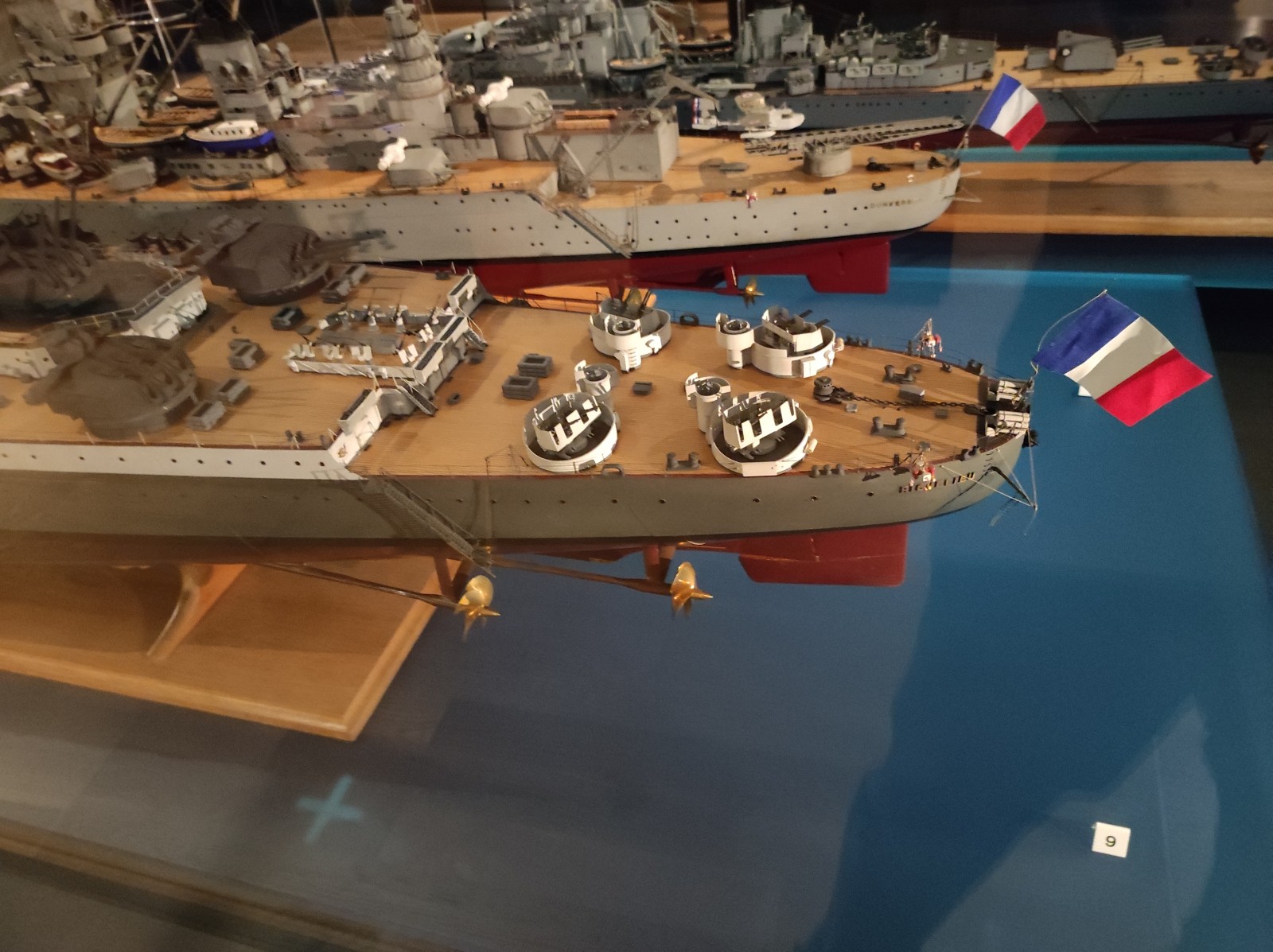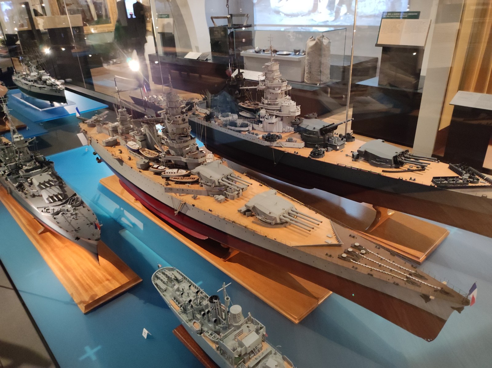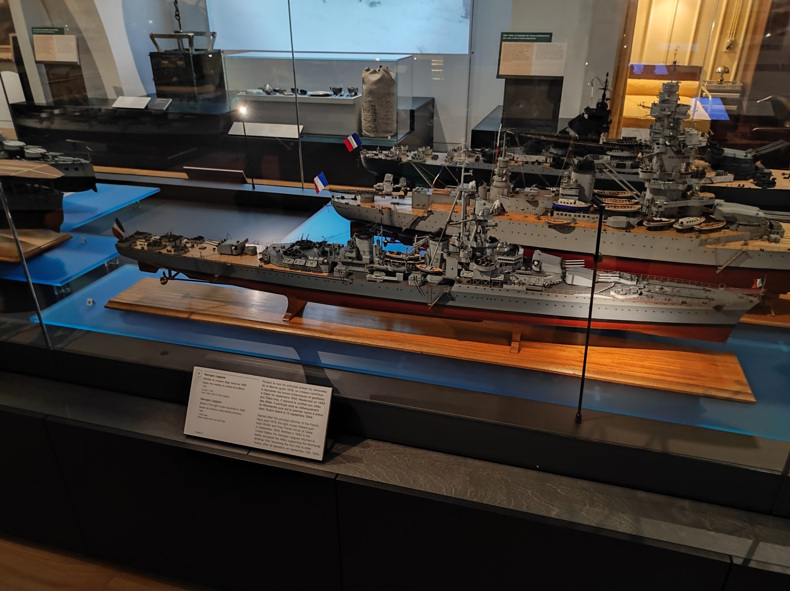 Weiter geht es mit Modellen im Musée national de la Marine de Paris aus der Zeit des Zweiten Weltkriegs, darunter der Flugzeugträger Béarn, der Leichter Kreuzer Georges Leygues, die Korvette Aconit sowie die Schlachtschiffe Lorraine, Dunkerque und Richelieu.