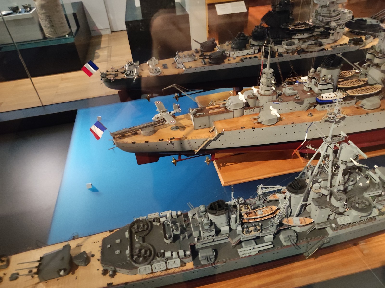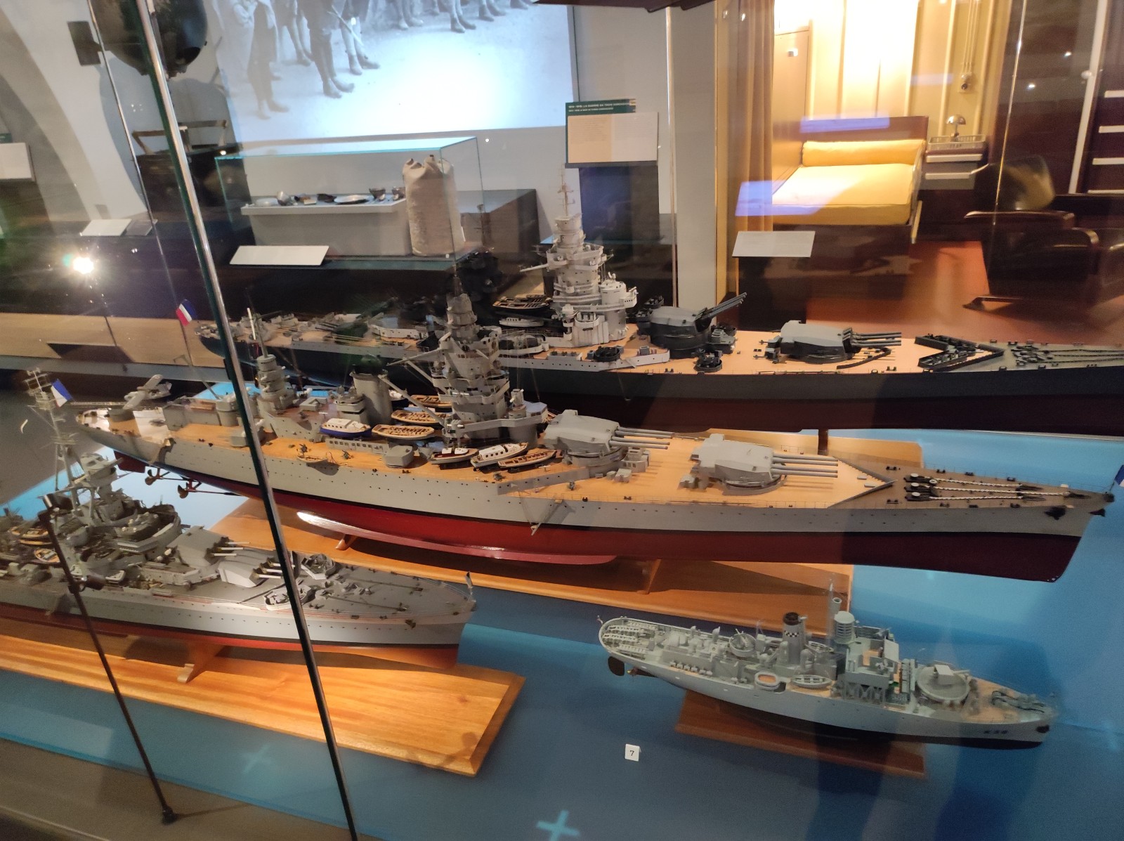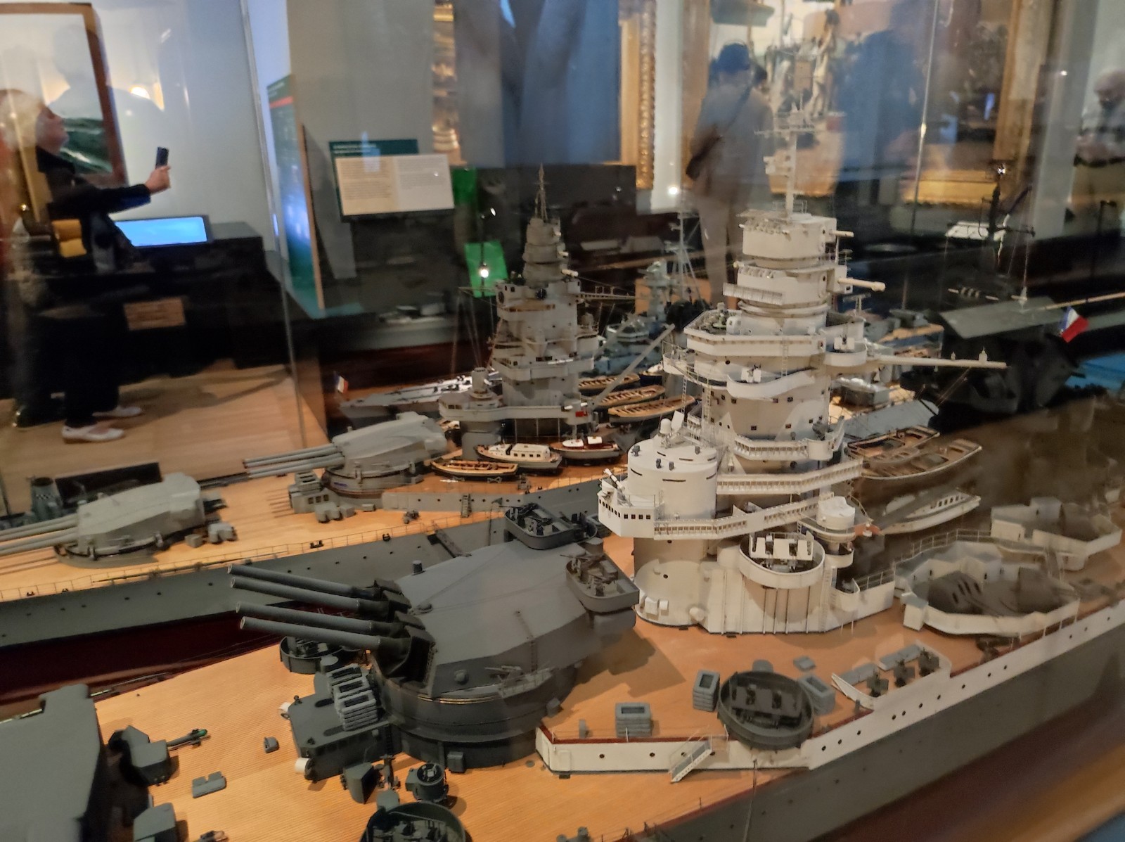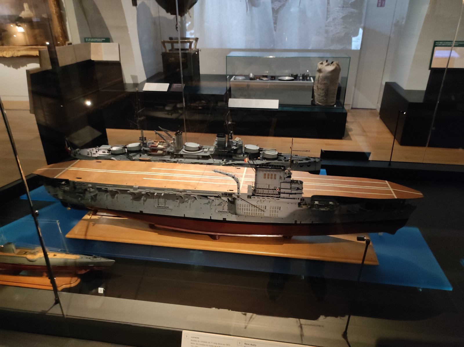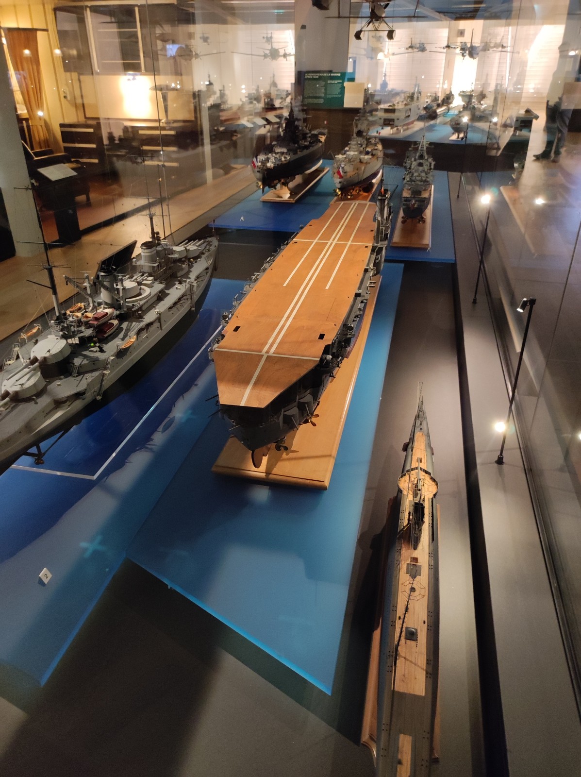 Weiter geht es mit Modellen im Musée national de la Marine de Paris aus der Zeit des Zweiten Weltkriegs, darunter der Flugzeugträger Béarn, der Leichter Kreuzer Georges Leygues, die Korvette Aconit sowie die Schlachtschiffe Lorraine, Dunkerque und Richelieu.