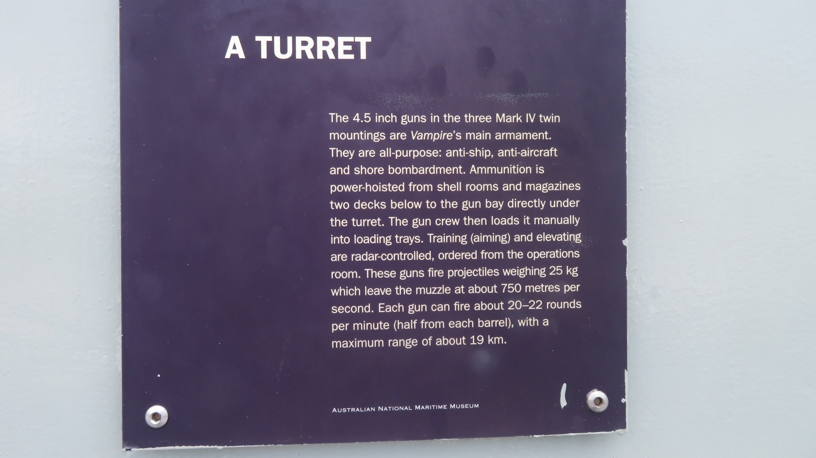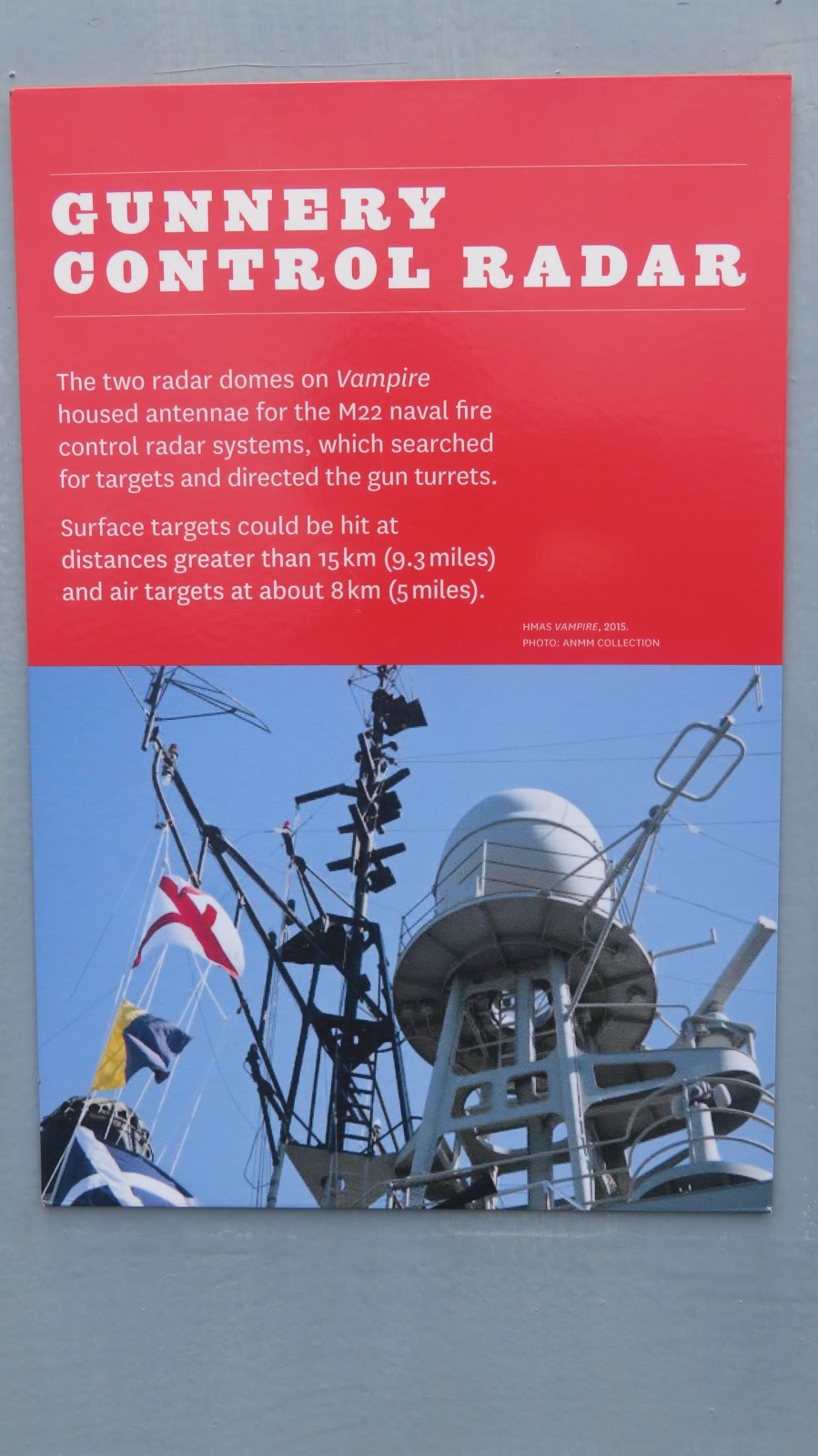 Die HMAS Vampire war der dritte der drei für die Royal Australian Navy gebauten Zerstörer der Daring-Klasse; sie wurde am 1. Juli 1952 auf Kiel gelegt, am 27. Oktober 1956 vom Stapel gelassen und am 23. Juni 1959 in Dienst gestellt. Während ihrer Dienstzeit bis August 1986 absolvierte sie zahlreiche Einsätze, unter anderem im Rahmen der Far East Strategic Reserve, begleitete Truppentransporte nach Vietnam und diente bei multinationalen Übungen. 1977 geleitete sie die königliche Yacht Britannia und wurde 1980 als Schulungsschiff umklassifiziert. Nach der Außerdienststellung blieb Vampire erhalten und wurde 1997 dem Australian National Maritime Museum in Sydney übergeben, wo sie heute als Museumsschiff ausgestellt ist und als größtes erhaltenes Kriegsschiff Australiens gilt.