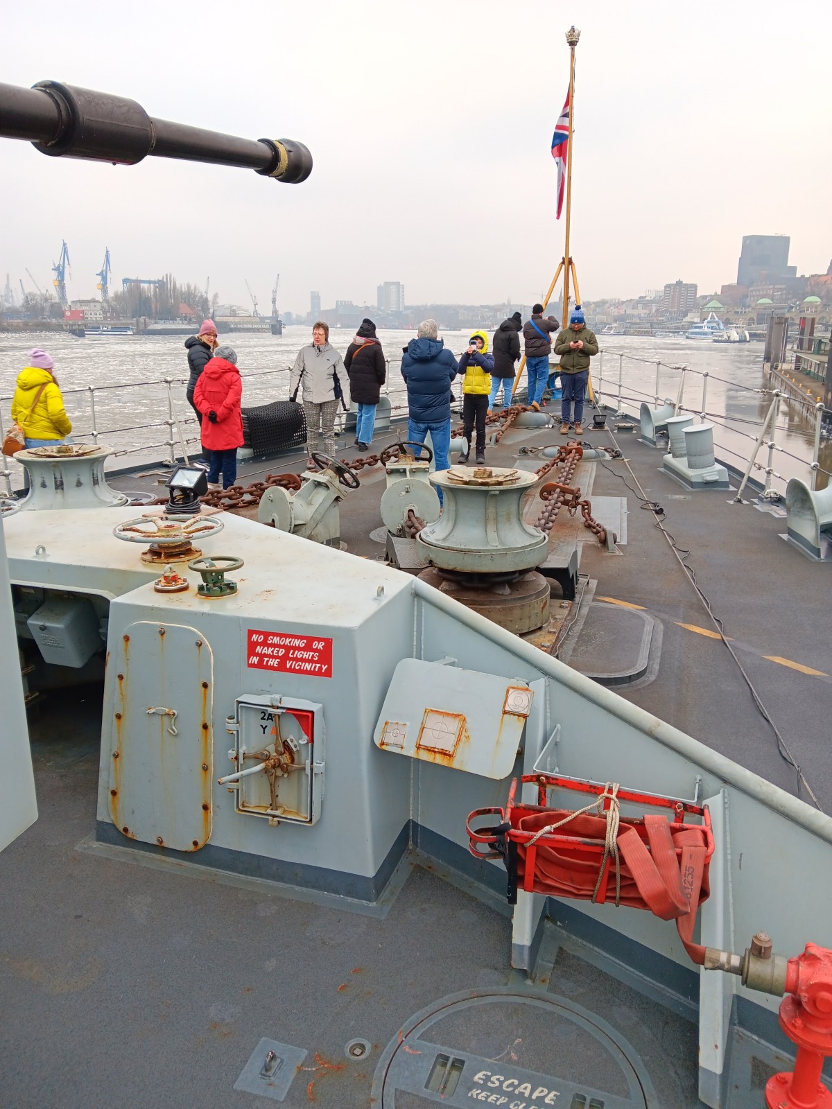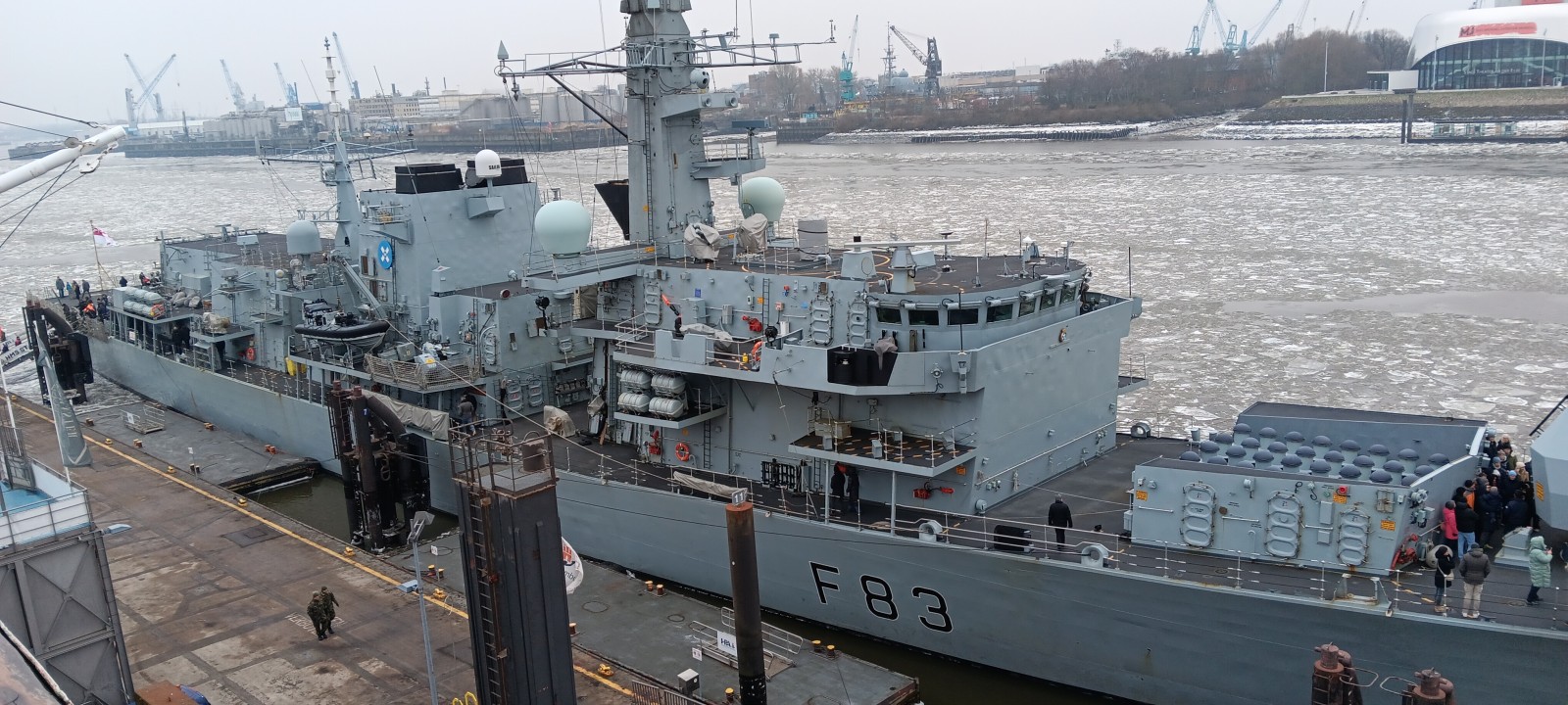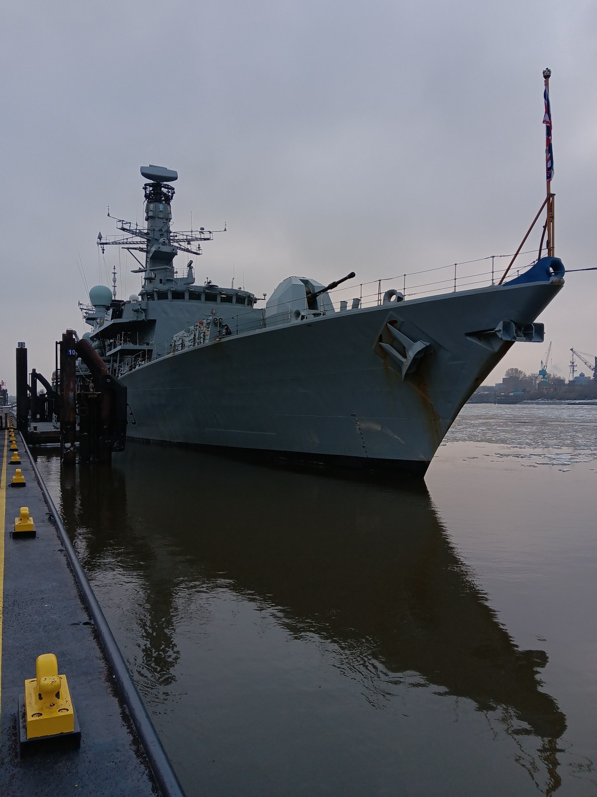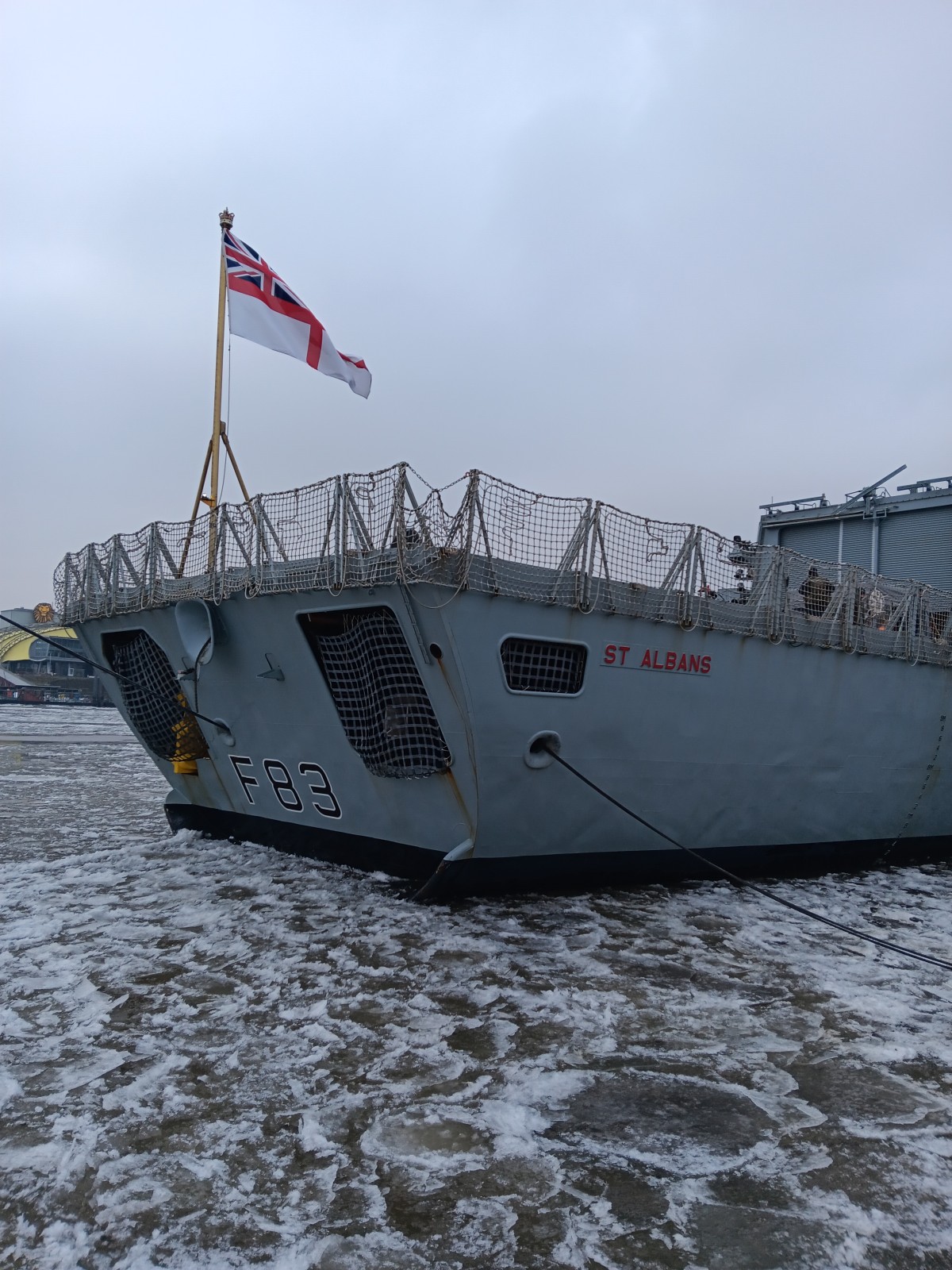 Bei Minusgraden nutzte ich die Gelegenheit, die Fregatte der Royal Navy St Albans zu besuchen. Zum „Open Ship" wurde am Samstag, den 24. Januar 2026 ab 10 Uhr eingeladen. Es konnten das Oberdeck und der Flugzeughangar besichtigt werden. Die Besatzung hatte dazu einiges an Gerät und Bewaffnung zur Demonstration aufgebaut und ausgelegt. Fragen wurden sehr gerne und sehr ausführlich beantwortet. Der Schiffsentwurf stellt für mich noch ein klassisches Kriegsschiff aus der Zeit dar, bevor das Zeitalter des Stealth-Designs anbrach, um Radarsignaturen gering zu halten. Eigentlich sollte auch das französische Küsten-Patrouillenboot FS Pluvier kommen, dessen Besuch jedoch abgesagt wurde. Bei meinem Besuch waren weder ein Bordhubschrauber noch die ursprünglich zur Bewaffnung gehörenden Harpoon-Starter bzw. die sie ersetzenden NSM-Starter vor dem vorderen Aufbau zu sehen.
