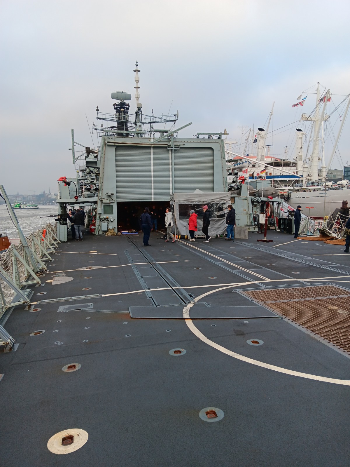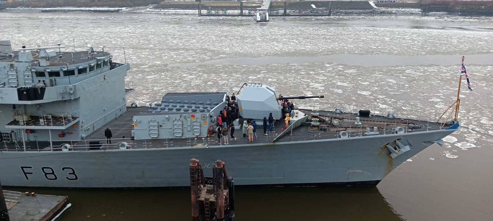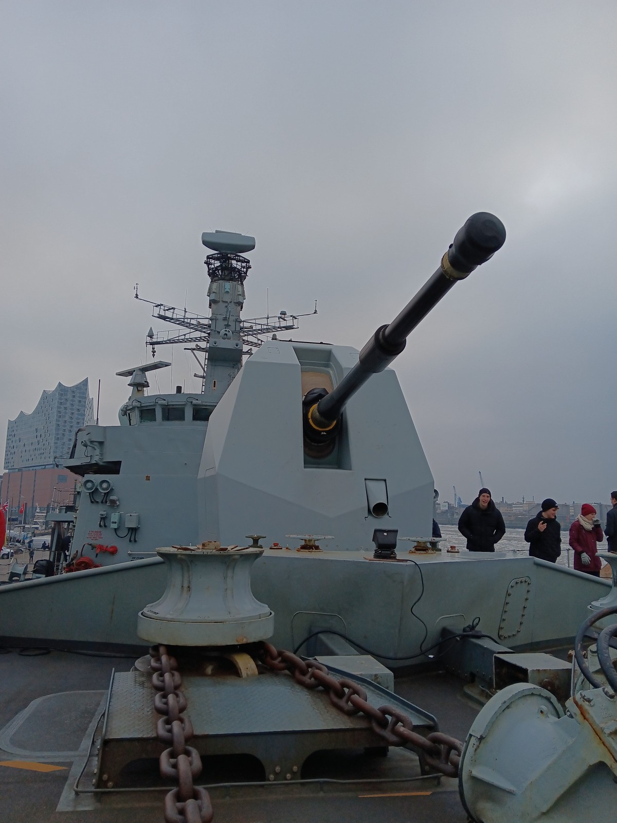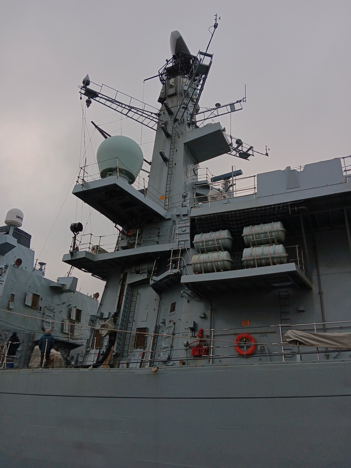 Bei Minusgraden nutzte ich die Gelegenheit, die Fregatte der Royal Navy St Albans zu besuchen. Zum „Open Ship" wurde am Samstag, den 24. Januar 2026 ab 10 Uhr eingeladen. Es konnten das Oberdeck und der Flugzeughangar besichtigt werden. Die Besatzung hatte dazu einiges an Gerät und Bewaffnung zur Demonstration aufgebaut und ausgelegt. Fragen wurden sehr gerne und sehr ausführlich beantwortet. Der Schiffsentwurf stellt für mich noch ein klassisches Kriegsschiff aus der Zeit dar, bevor das Zeitalter des Stealth-Designs anbrach, um Radarsignaturen gering zu halten. Eigentlich sollte auch das französische Küsten-Patrouillenboot FS Pluvier kommen, dessen Besuch jedoch abgesagt wurde. Bei meinem Besuch waren weder ein Bordhubschrauber noch die ursprünglich zur Bewaffnung gehörenden Harpoon-Starter bzw. die sie ersetzenden NSM-Starter vor dem vorderen Aufbau zu sehen.