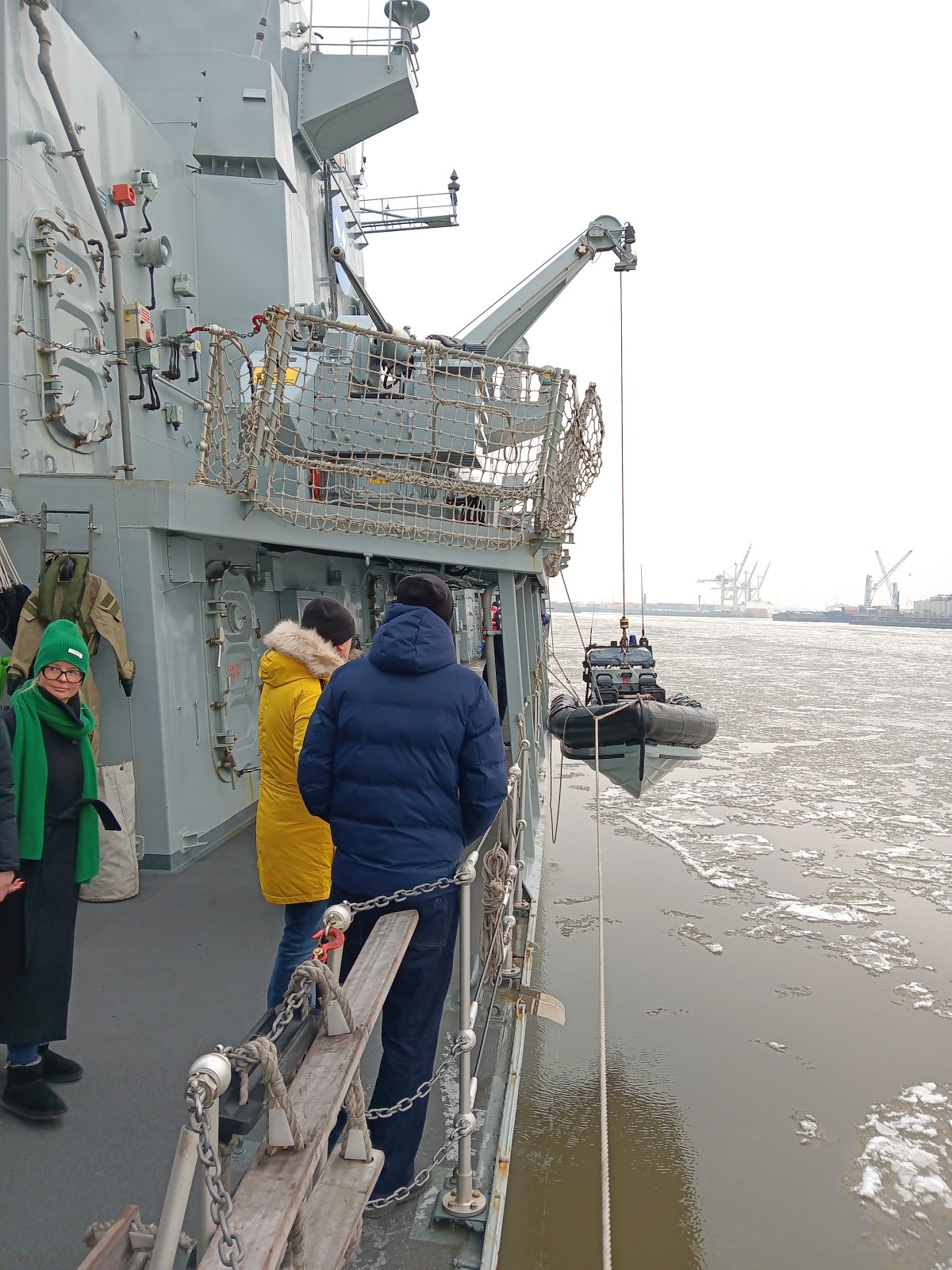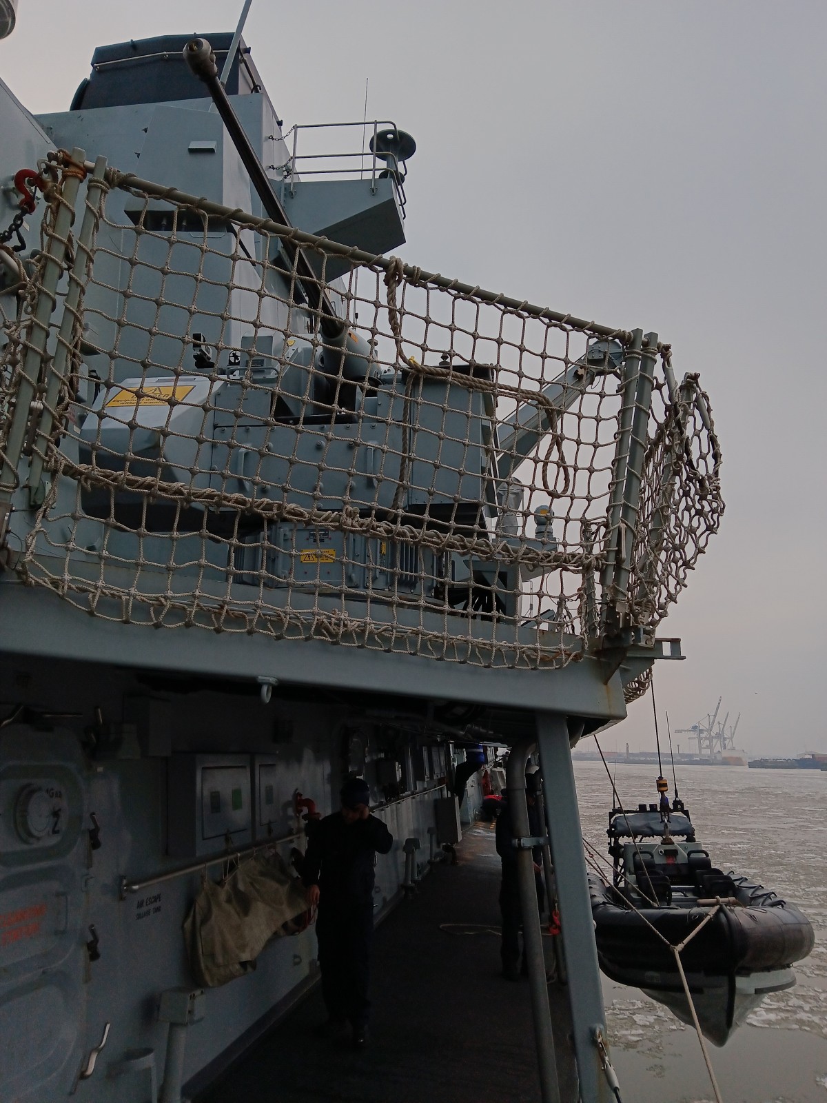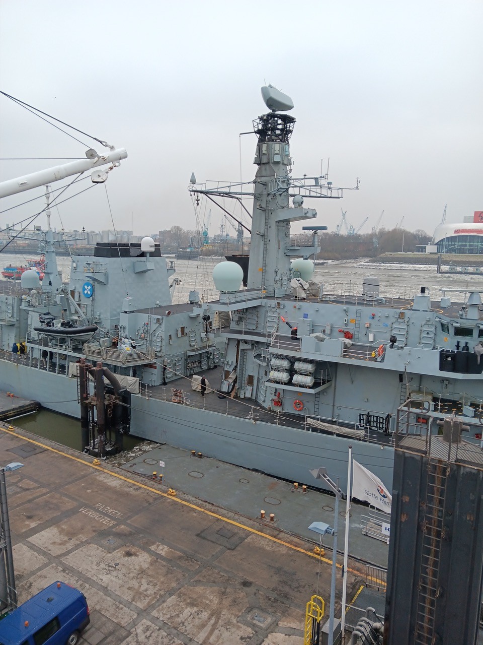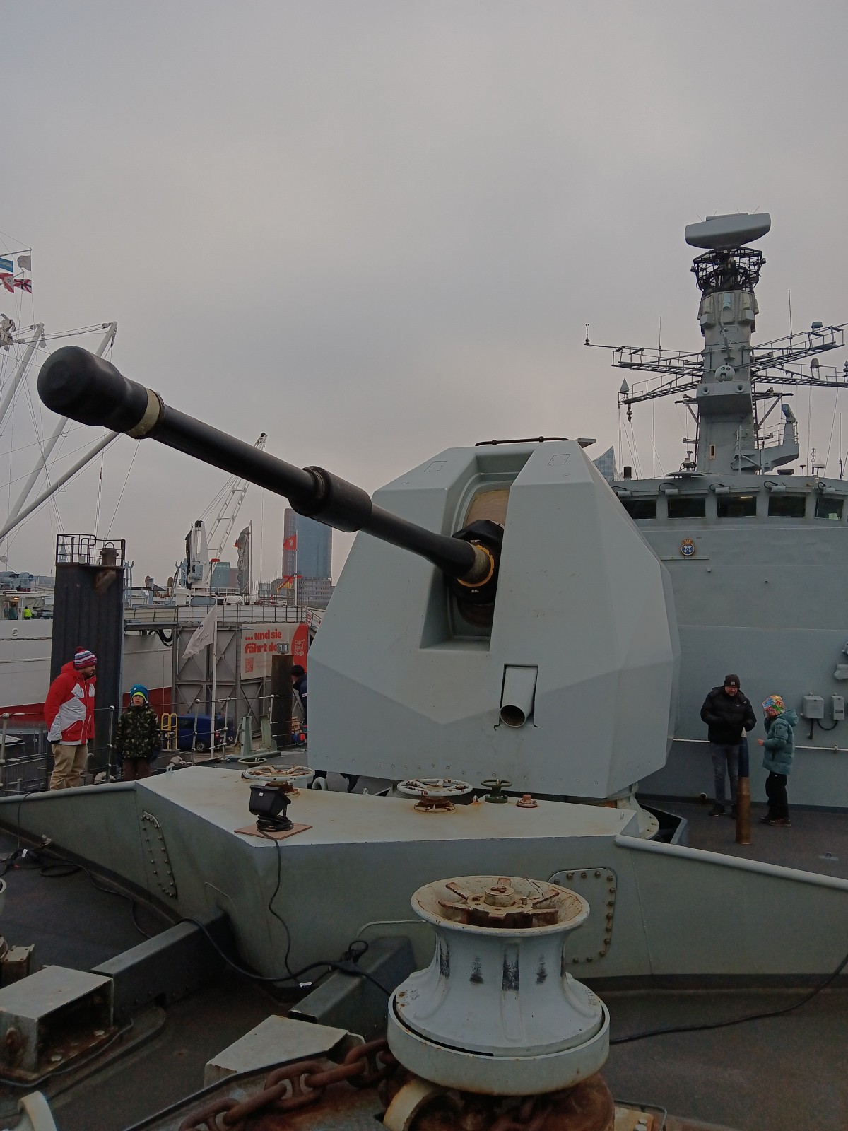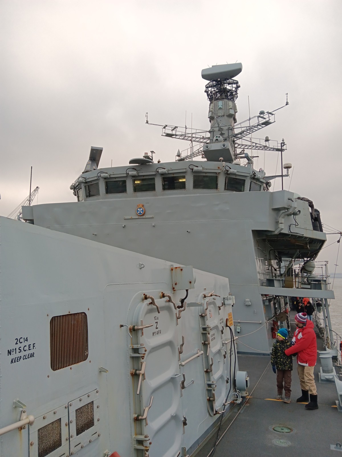 Bei Minusgraden nutzte ich die Gelegenheit, die Fregatte der Royal Navy St Albans zu besuchen. Zum „Open Ship" wurde am Samstag, den 24. Januar 2026 ab 10 Uhr eingeladen. Es konnten das Oberdeck und der Flugzeughangar besichtigt werden. Die Besatzung hatte dazu einiges an Gerät und Bewaffnung zur Demonstration aufgebaut und ausgelegt. Fragen wurden sehr gerne und sehr ausführlich beantwortet. Der Schiffsentwurf stellt für mich noch ein klassisches Kriegsschiff aus der Zeit dar, bevor das Zeitalter des Stealth-Designs anbrach, um Radarsignaturen gering zu halten. Eigentlich sollte auch das französische Küsten-Patrouillenboot FS Pluvier kommen, dessen Besuch jedoch abgesagt wurde. Bei meinem Besuch waren weder ein Bordhubschrauber noch die ursprünglich zur Bewaffnung gehörenden Harpoon-Starter bzw. die sie ersetzenden NSM-Starter vor dem vorderen Aufbau zu sehen.