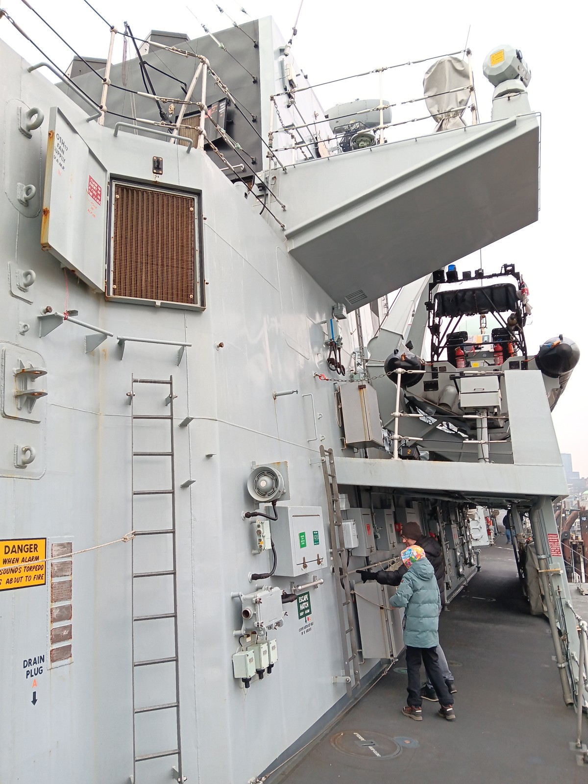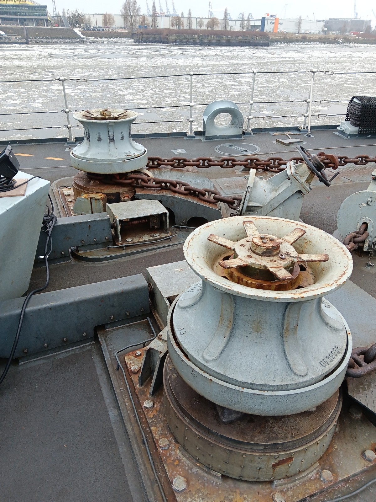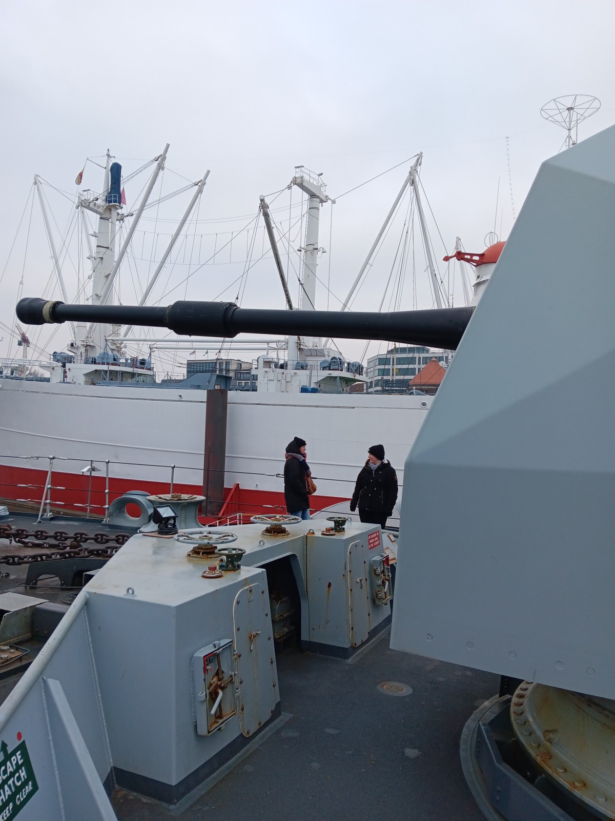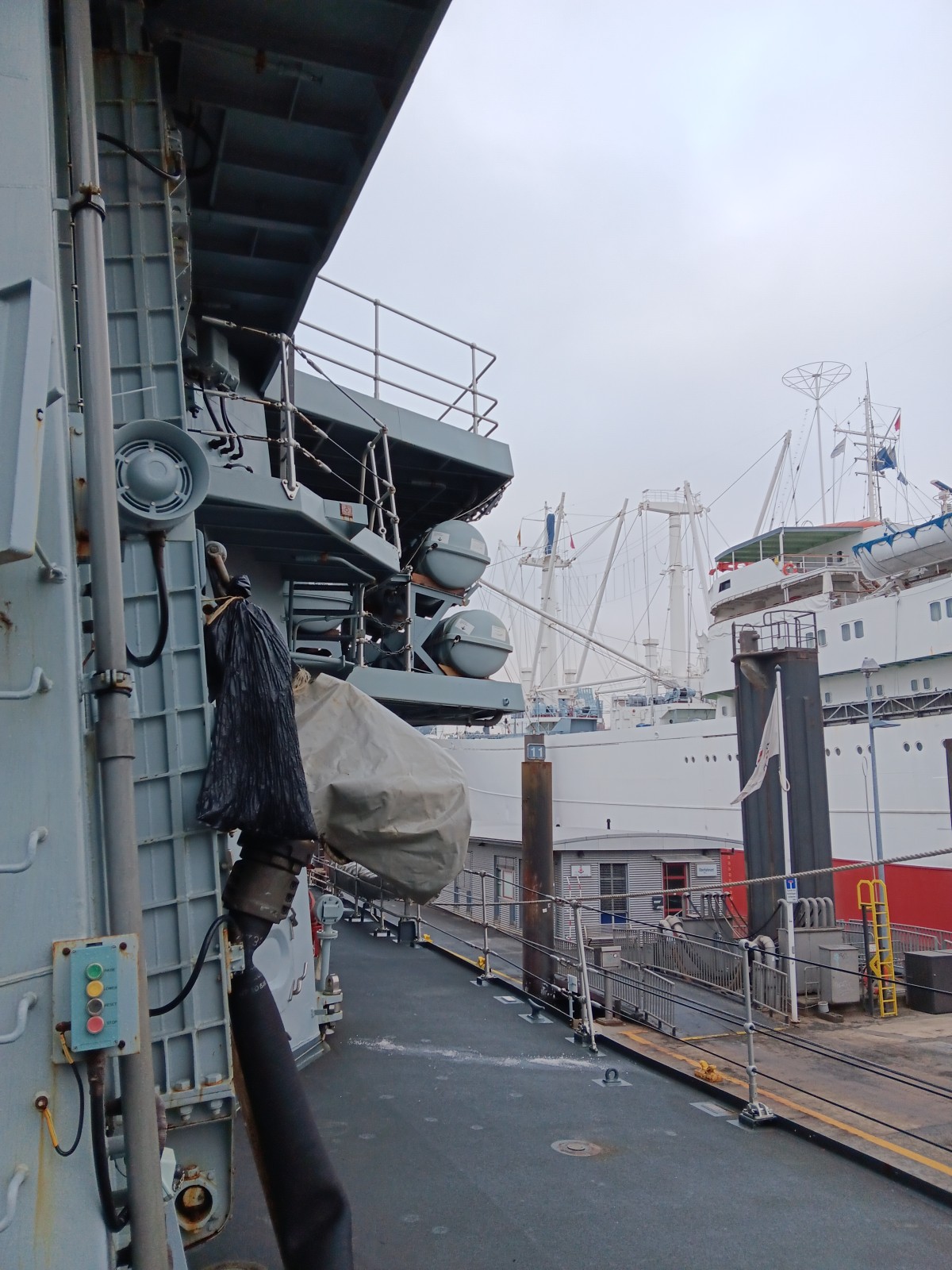 Bei Minusgraden nutzte ich die Gelegenheit, die Fregatte der Royal Navy St Albans zu besuchen. Zum „Open Ship" wurde am Samstag, den 24. Januar 2026 ab 10 Uhr eingeladen. Es konnten das Oberdeck und der Flugzeughangar besichtigt werden. Die Besatzung hatte dazu einiges an Gerät und Bewaffnung zur Demonstration aufgebaut und ausgelegt. Fragen wurden sehr gerne und sehr ausführlich beantwortet. Der Schiffsentwurf stellt für mich noch ein klassisches Kriegsschiff aus der Zeit dar, bevor das Zeitalter des Stealth-Designs anbrach, um Radarsignaturen gering zu halten. Eigentlich sollte auch das französische Küsten-Patrouillenboot FS Pluvier kommen, dessen Besuch jedoch abgesagt wurde. Bei meinem Besuch waren weder ein Bordhubschrauber noch die ursprünglich zur Bewaffnung gehörenden Harpoon-Starter bzw. die sie ersetzenden NSM-Starter vor dem vorderen Aufbau zu sehen.