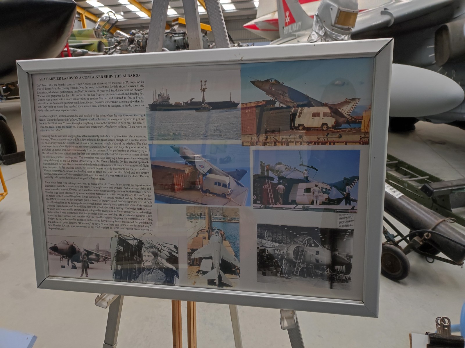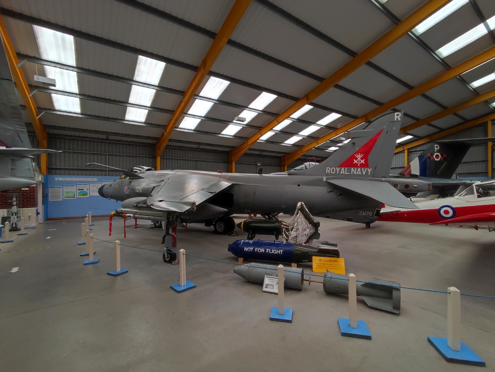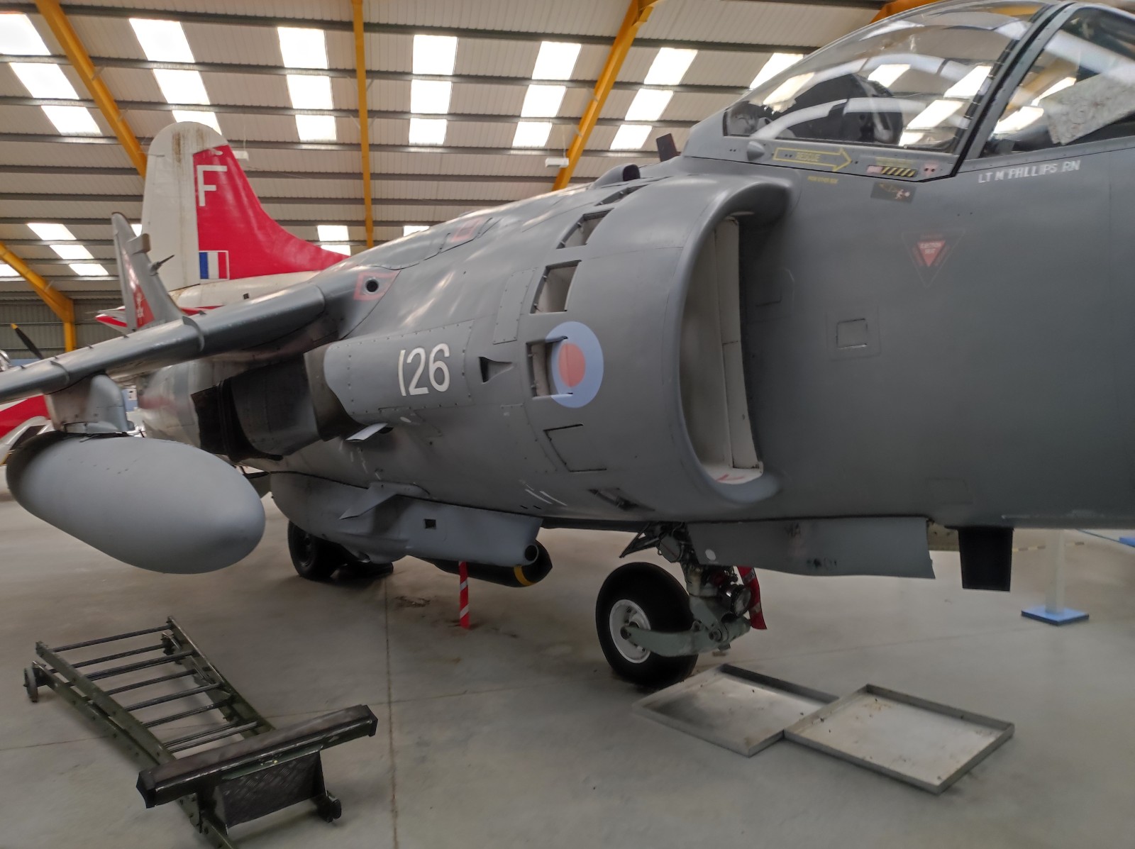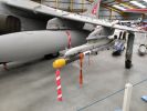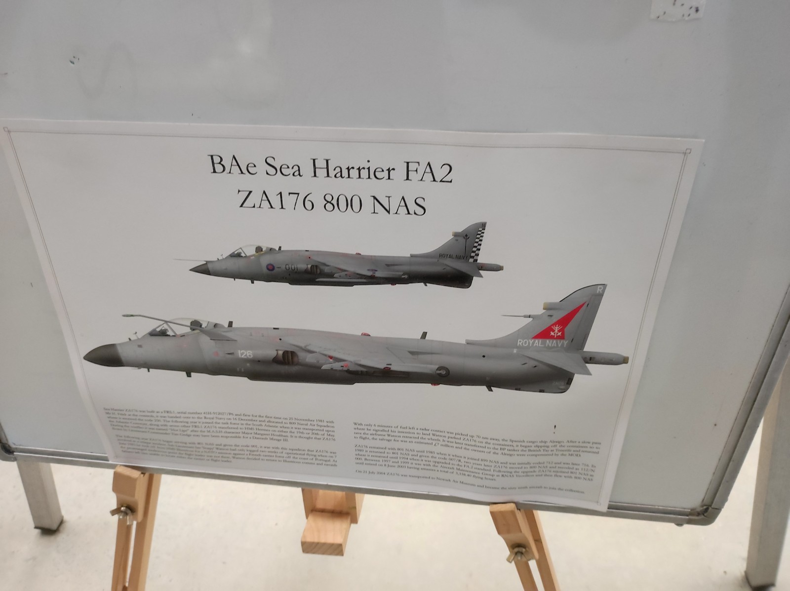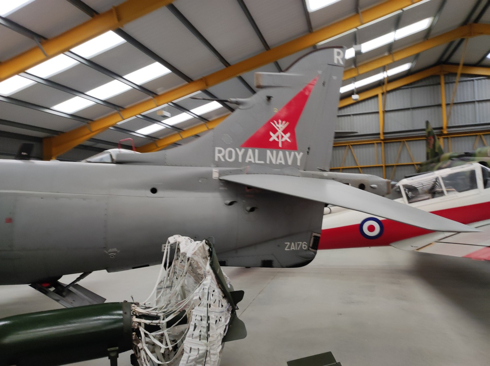 Der Sea Harrier FA.2 mit der Kennung ZA176 wurde 1981 als FRS.1 gebaut und diente Anfangs bei der 809 Naval Air Squadron (809 NAS). Sie wurde von der Atlantic Conveyor im Falklandkrieg in den Südatlantik transportiert und diente dort von dem Flugzeugträger HMS Hermes aus. Sie hat wahrscheinlich eine argentinische Mirage III abgeschossen. Nach dem Krieg kam sie zur 801 NAS. Am 7. Juli 1983 fand ihr Pilot nach einem Übungseinsatz von dem Träger HMS Illustrious nicht mehr zurück zum Träger und landete, als der Triebstoff auszugehen drohte, auf dem spanischen Containerschiff Alraigo. Das Flugzeug rutschte nach der Landung von den Containern und wurde beschädigt, konnte aber wieder hergestellt werden. Sie flog ab 1985 für die 899 NAS, 1989 wieder bei der 801 NAS und ab 1991 bei der 800 NAS. 1994 (oder 1992?) wurde sie zur FA.2-Variante umgebaut und flog danach wieder bei der 801 NAS. 1997-99 war sie in Yeovilton, flog aber dann bis 2003 wieder bei der 800 NAS. Ab 2004 ist sie im Newark Air Museum ausgestellt. Dort fotografierte ich sie im November 2023 :