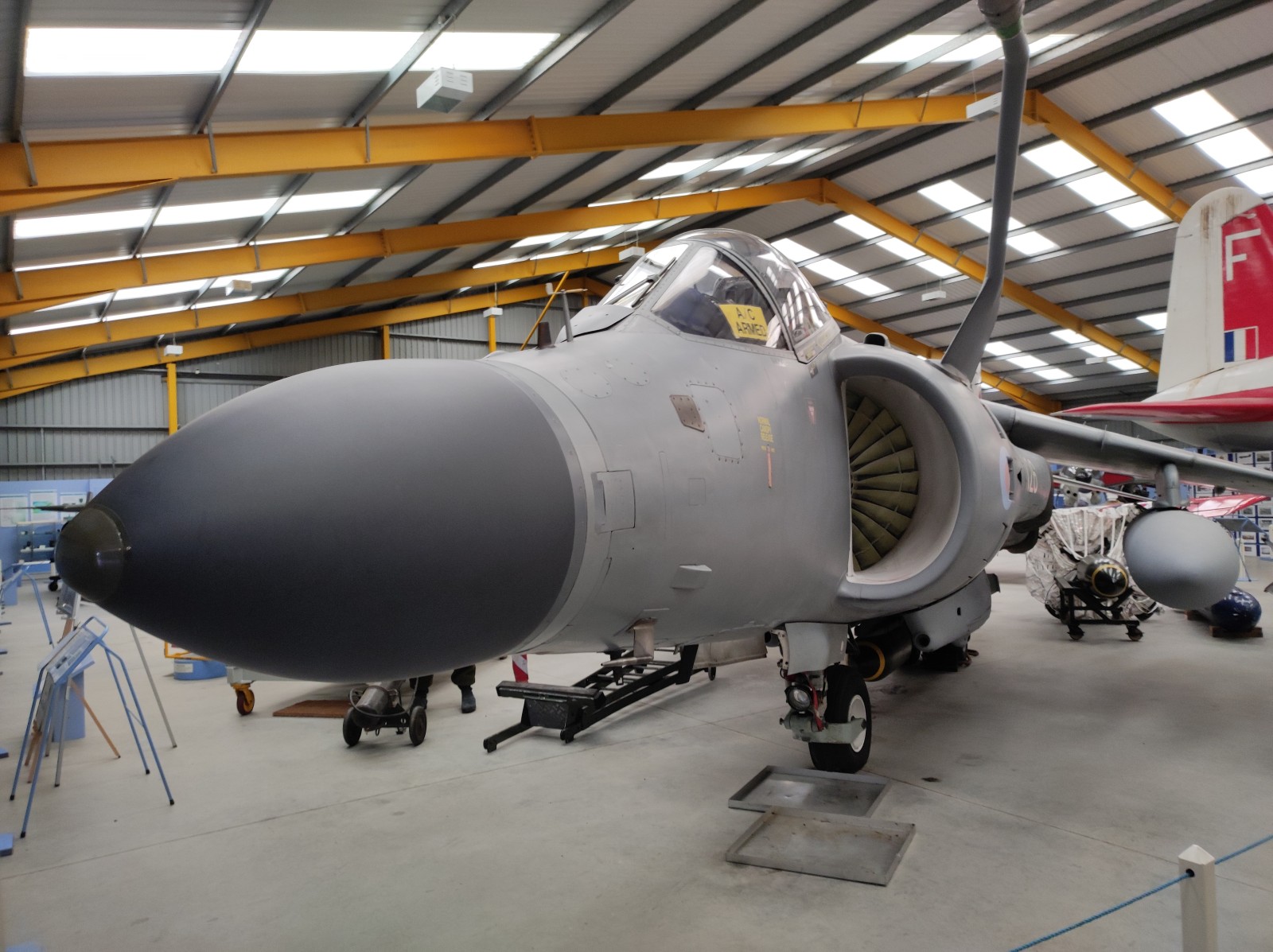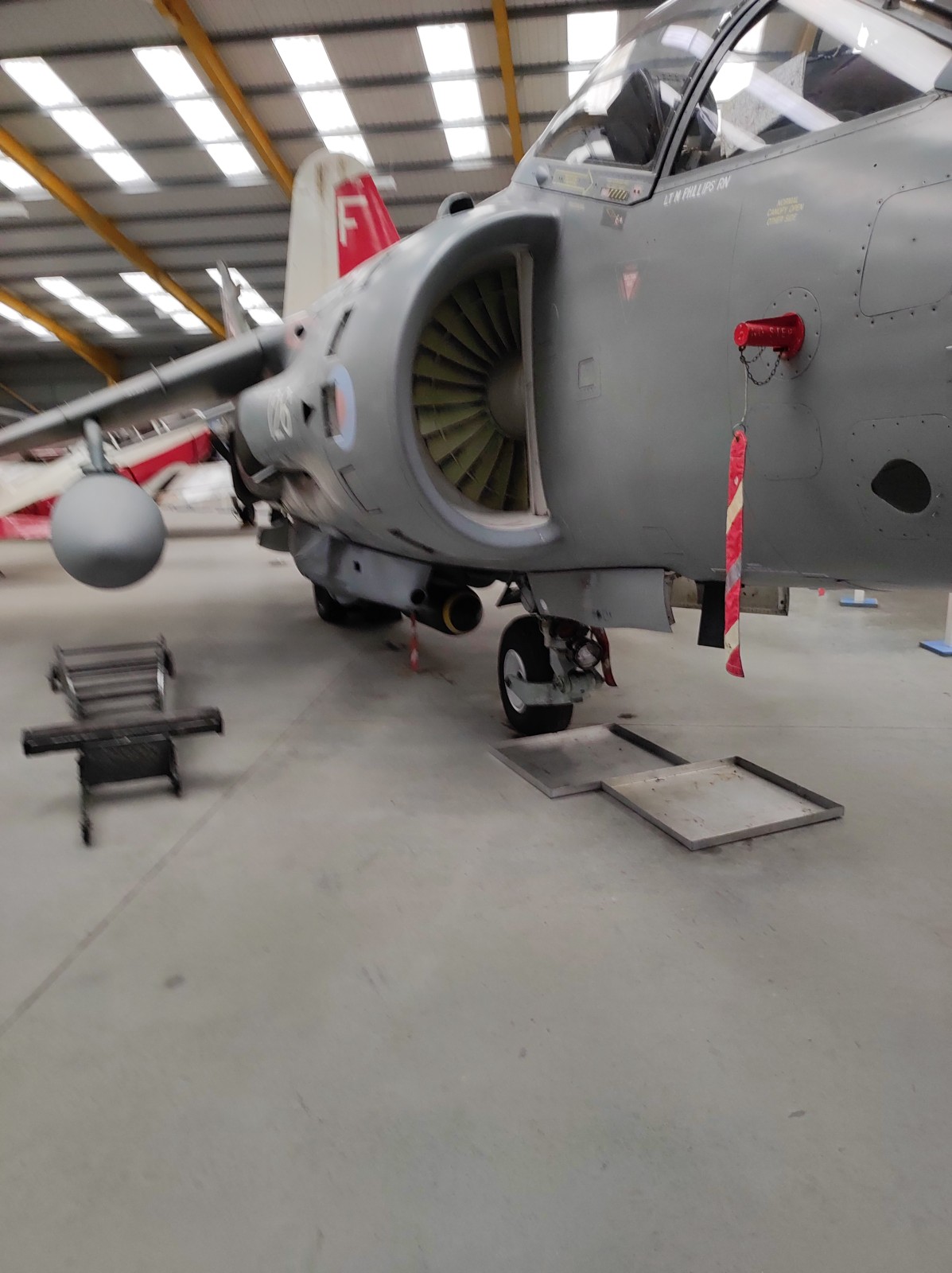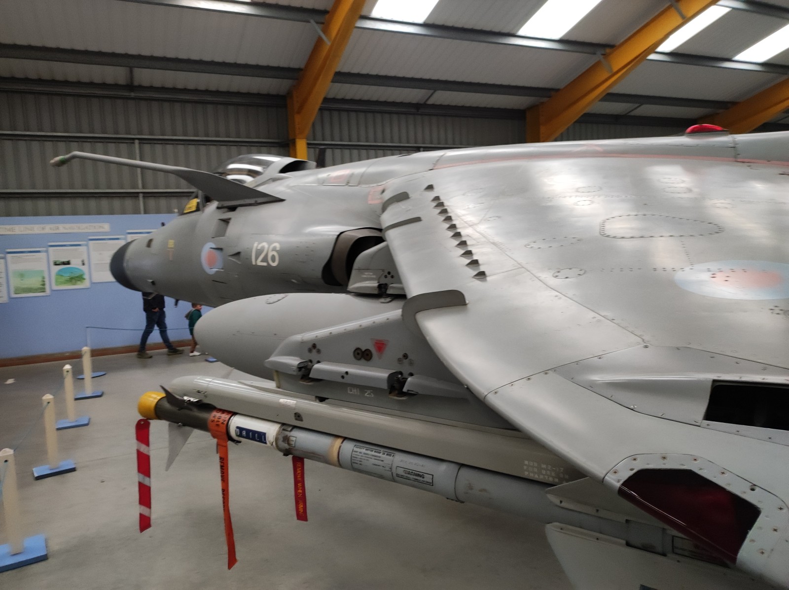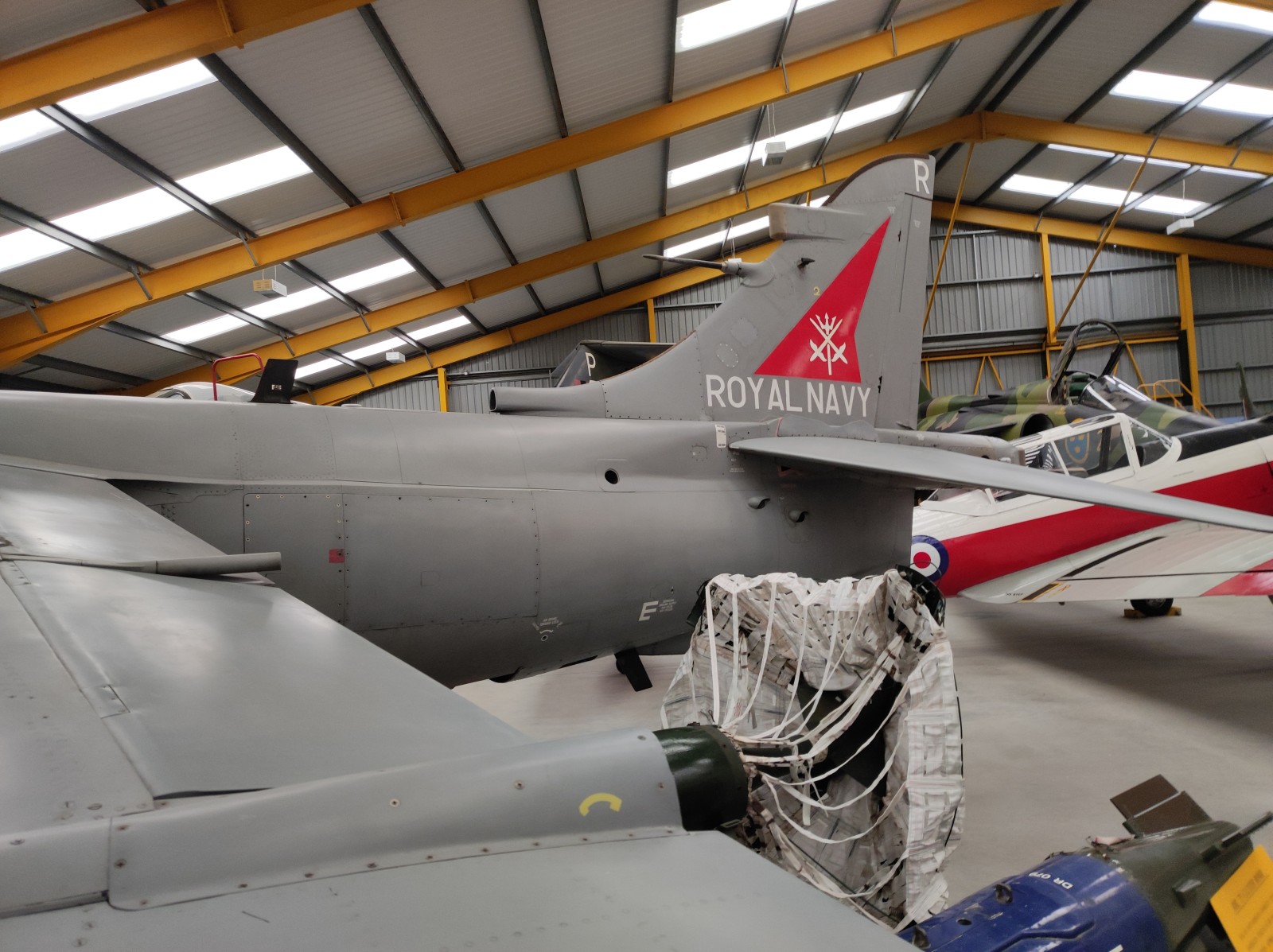 Der Sea Harrier FA.2 mit der Kennung ZA176 wurde 1981 als FRS.1 gebaut und diente Anfangs bei der 809 Naval Air Squadron (809 NAS). Sie wurde von der Atlantic Conveyor im Falklandkrieg in den Südatlantik transportiert und diente dort von dem Flugzeugträger HMS Hermes aus. Sie hat wahrscheinlich eine argentinische Mirage III abgeschossen. Nach dem Krieg kam sie zur 801 NAS. Am 7. Juli 1983 fand ihr Pilot nach einem Übungseinsatz von dem Träger HMS Illustrious nicht mehr zurück zum Träger und landete, als der Triebstoff auszugehen drohte, auf dem spanischen Containerschiff Alraigo. Das Flugzeug rutschte nach der Landung von den Containern und wurde beschädigt, konnte aber wieder hergestellt werden. Sie flog ab 1985 für die 899 NAS, 1989 wieder bei der 801 NAS und ab 1991 bei der 800 NAS. 1994 (oder 1992?) wurde sie zur FA.2-Variante umgebaut und flog danach wieder bei der 801 NAS. 1997-99 war sie in Yeovilton, flog aber dann bis 2003 wieder bei der 800 NAS. Ab 2004 ist sie im Newark Air Museum ausgestellt. Dort fotografierte ich sie im November 2023 :