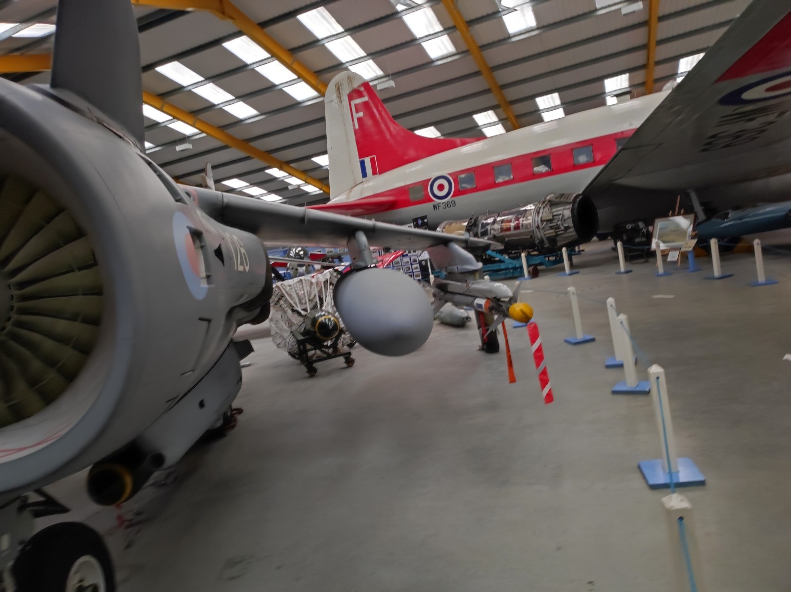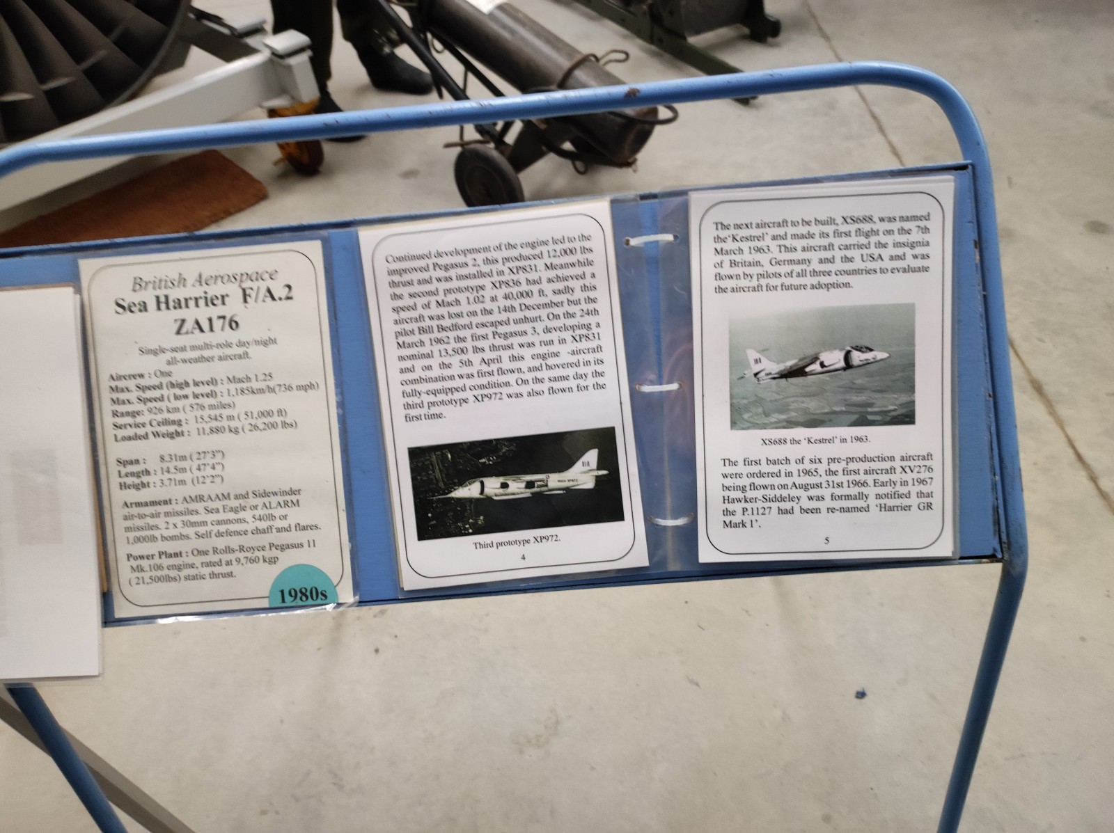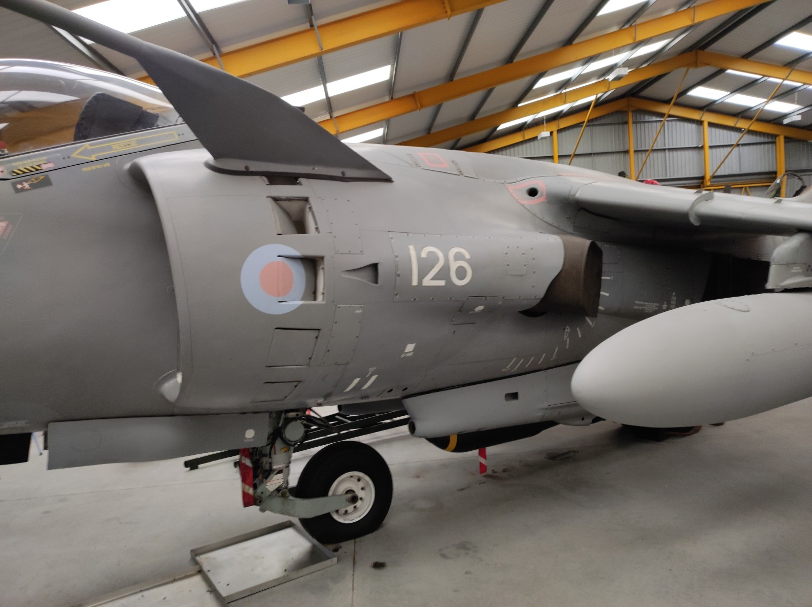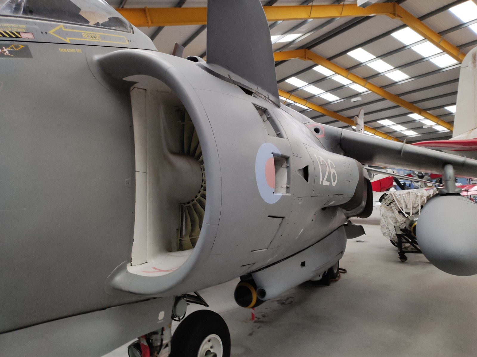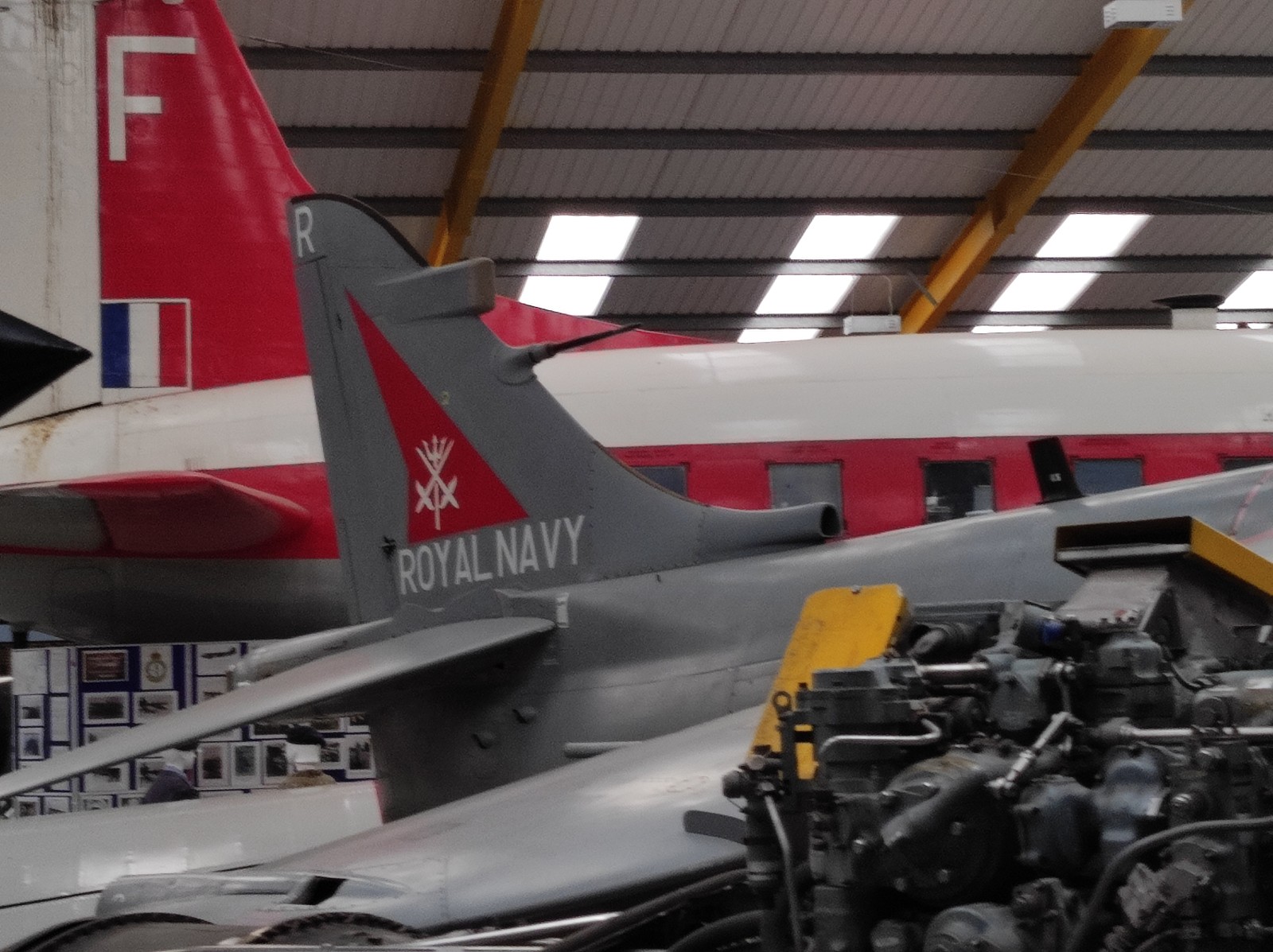 Der Sea Harrier FA.2 mit der Kennung ZA176 wurde 1981 als FRS.1 gebaut und diente Anfangs bei der 809 Naval Air Squadron (809 NAS). Sie wurde von der Atlantic Conveyor im Falklandkrieg in den Südatlantik transportiert und diente dort von dem Flugzeugträger HMS Hermes aus. Sie hat wahrscheinlich eine argentinische Mirage III abgeschossen. Nach dem Krieg kam sie zur 801 NAS. Am 7. Juli 1983 fand ihr Pilot nach einem Übungseinsatz von dem Träger HMS Illustrious nicht mehr zurück zum Träger und landete, als der Triebstoff auszugehen drohte, auf dem spanischen Containerschiff Alraigo. Das Flugzeug rutschte nach der Landung von den Containern und wurde beschädigt, konnte aber wieder hergestellt werden. Sie flog ab 1985 für die 899 NAS, 1989 wieder bei der 801 NAS und ab 1991 bei der 800 NAS. 1994 (oder 1992?) wurde sie zur FA.2-Variante umgebaut und flog danach wieder bei der 801 NAS. 1997-99 war sie in Yeovilton, flog aber dann bis 2003 wieder bei der 800 NAS. Ab 2004 ist sie im Newark Air Museum ausgestellt. Dort fotografierte ich sie im November 2023 :