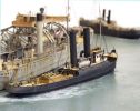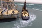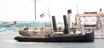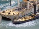 Die beiden Schlepper, die beim Einholen der Schleppleinen in Erwartung des Abwurfs der Festmacherleine dargestellt sind, wurden nach Plänen und Fotos selbst gebaut und bestehen aus holzgeschnitzten Rümpfen, Styrolschanzkleidern, Messing und sogar "Butterpapier". Beide Schlepper waren an sich schon beachtliche Forschungs- und Bauprojekte. Der Bau der beiden sehr unterschiedlichen Schlepper wird hier auf Modelwarships im Detail beschrieben.