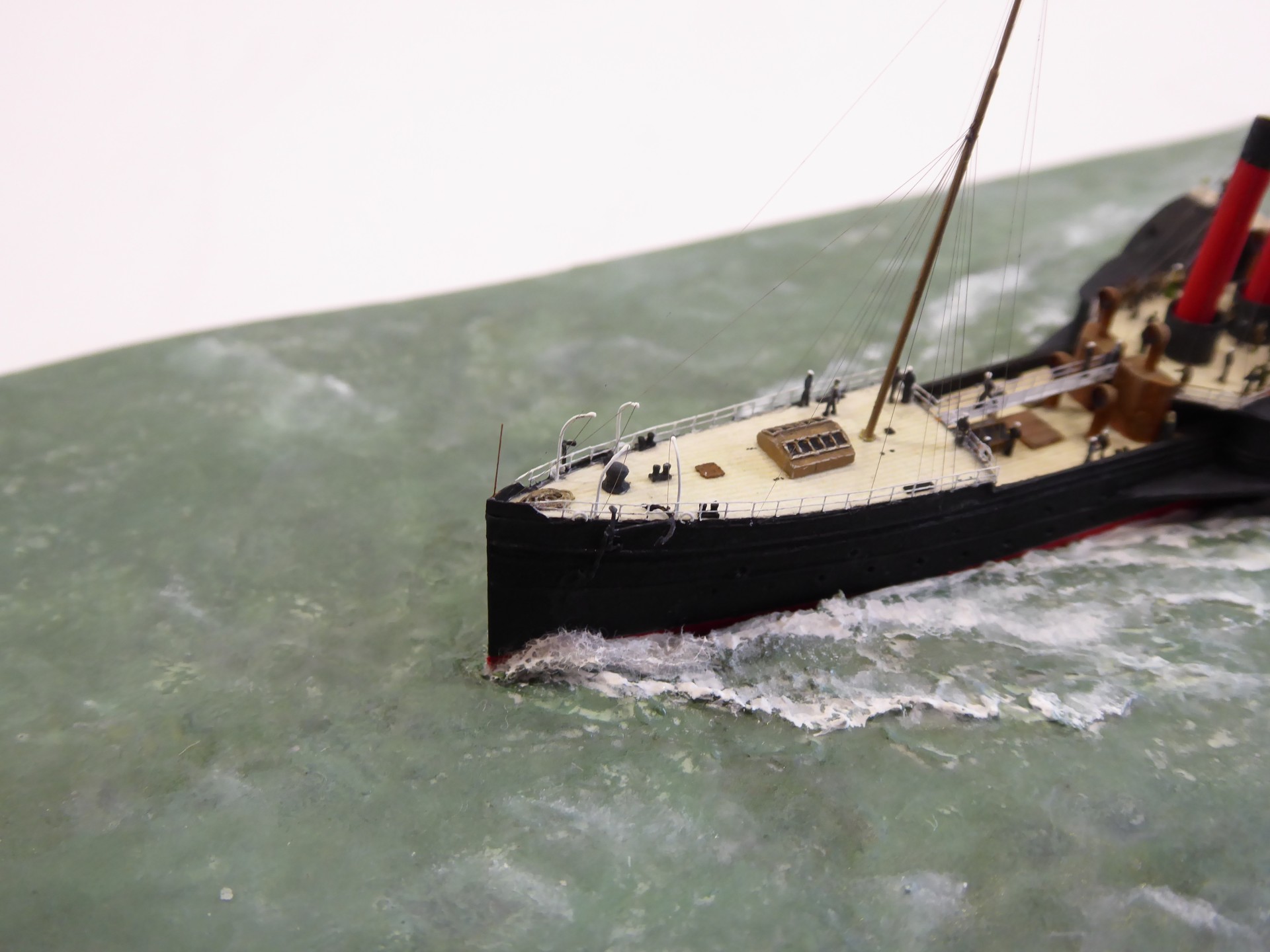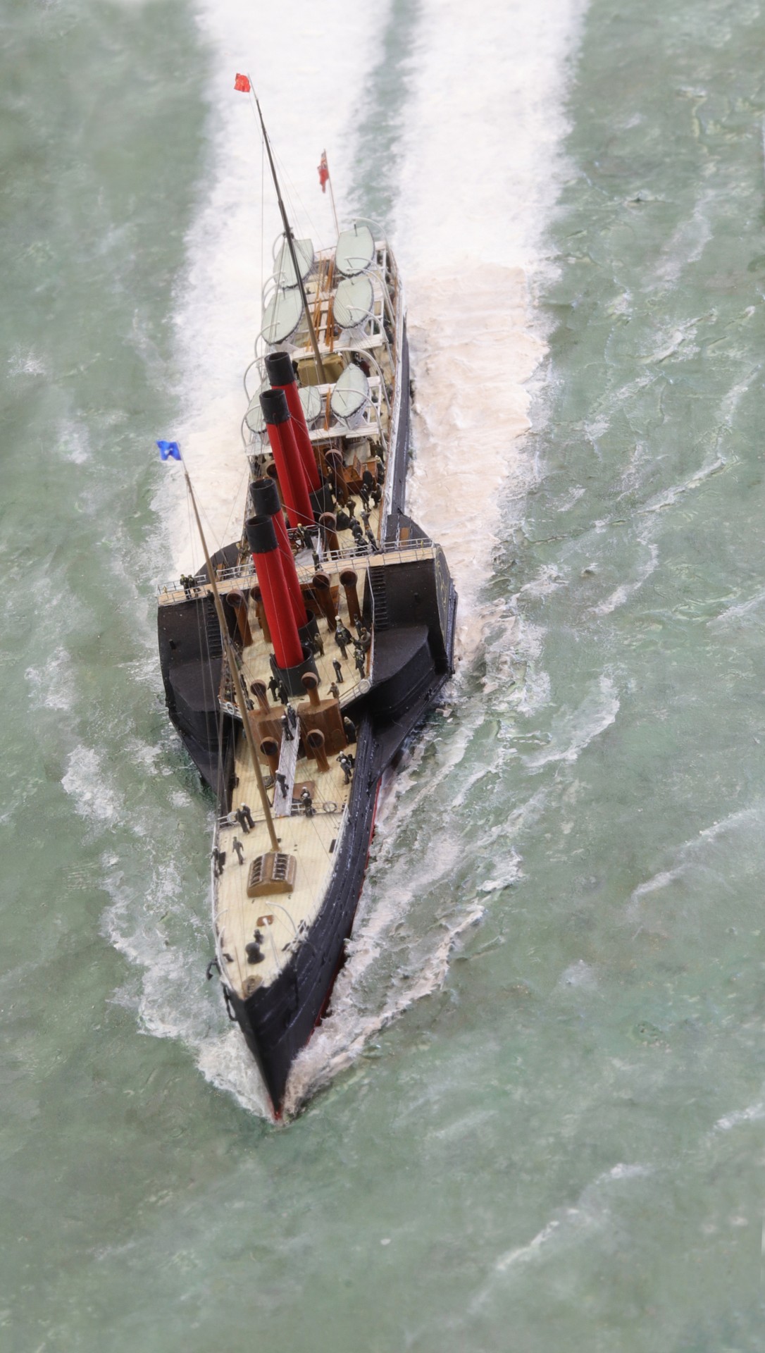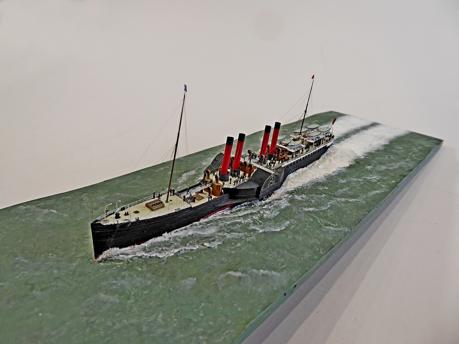 Das Modell wurde vollständig in Eigenarbeit auf einem aus Holz geschnitzten Rumpf aufgebaut, mit einer Aufbautenstruktur aus Polystyrol, Messing und Edelstahl. Die Holzbeplankung besteht aus einzelnen Messingquadraten, die jeweils separat angebracht wurden; sie wurden aus Ladderstock-Ätzteilen ausgeschnitten. Die vier Schornsteine und Lüfterhauben wurden aus Aluminiumrohren gefertigt, deren obere Kanten aufgebohrt und ausgeschliffen wurden, um eine nahezu maßstäblich dünne Wandstärke zu erzielen.