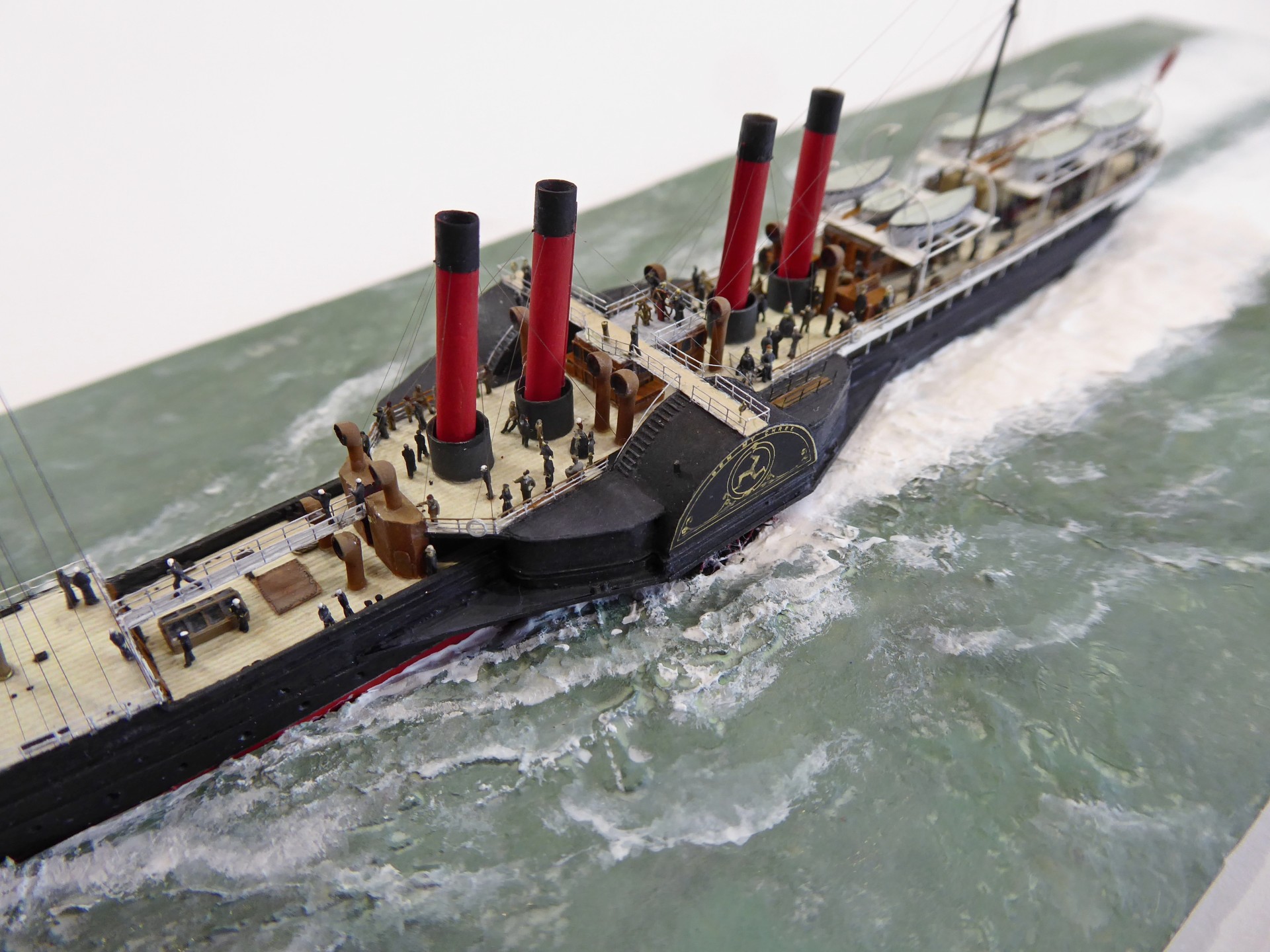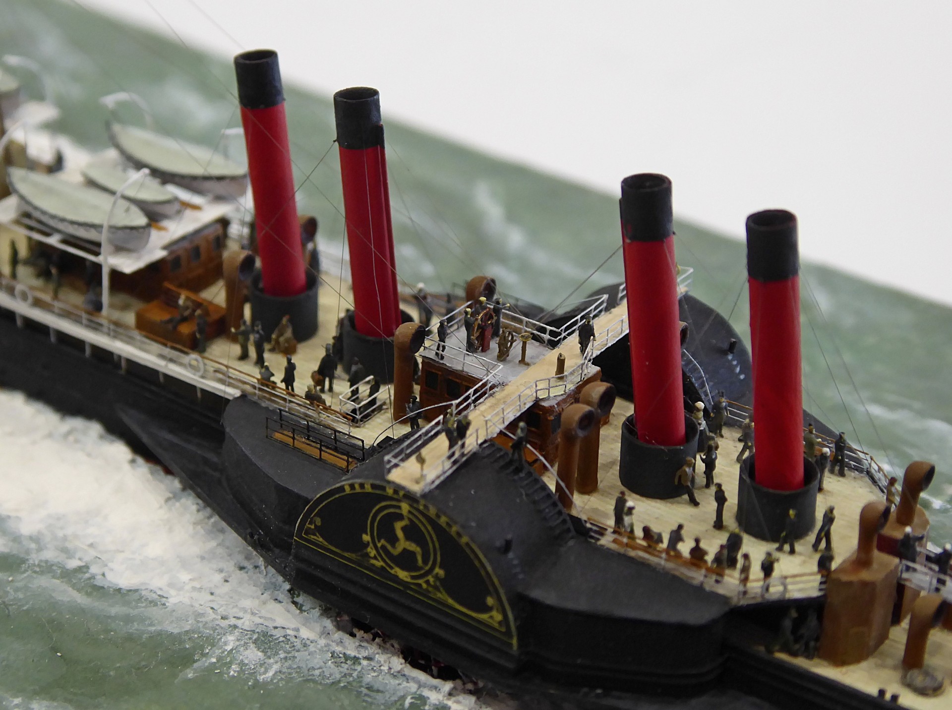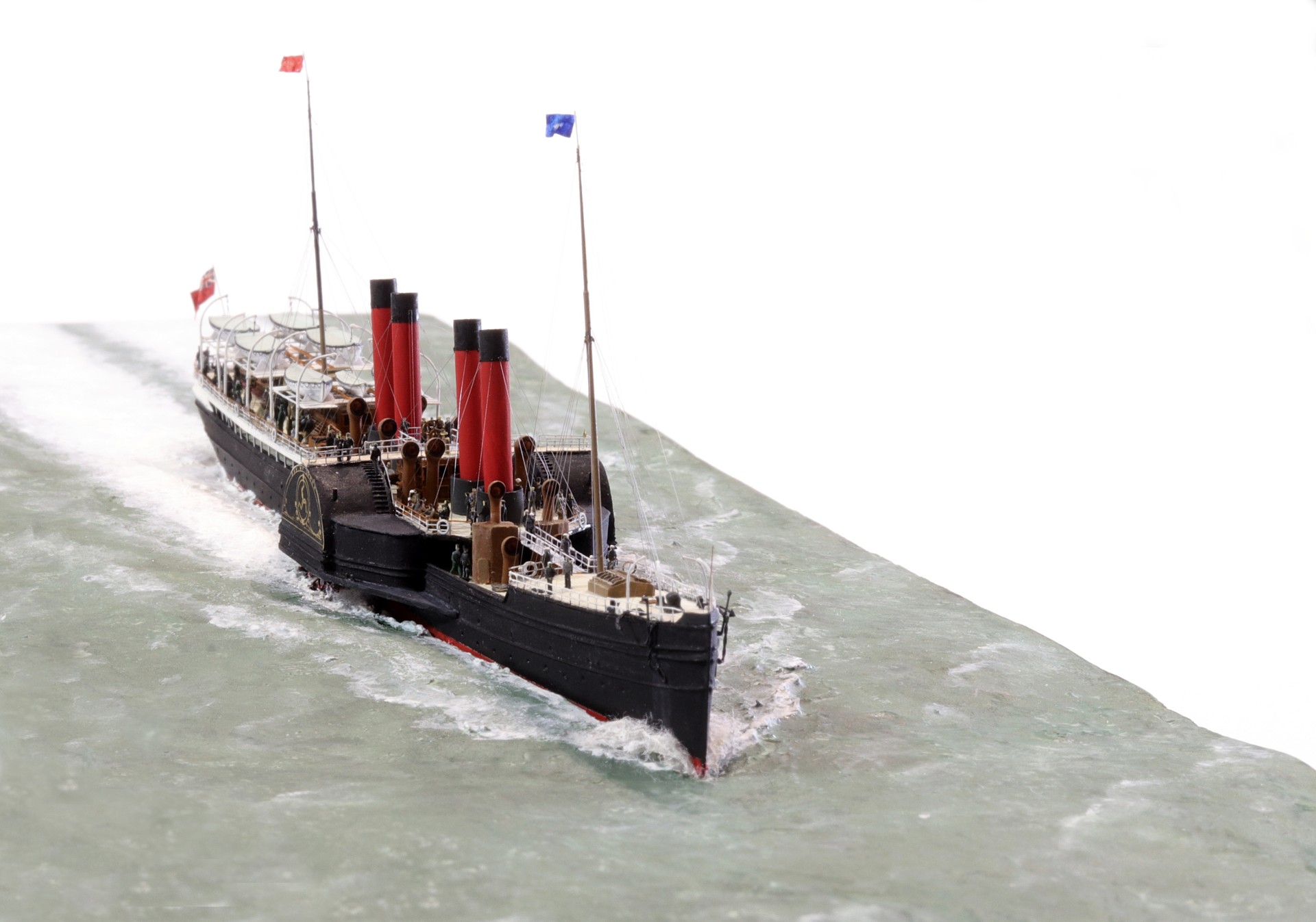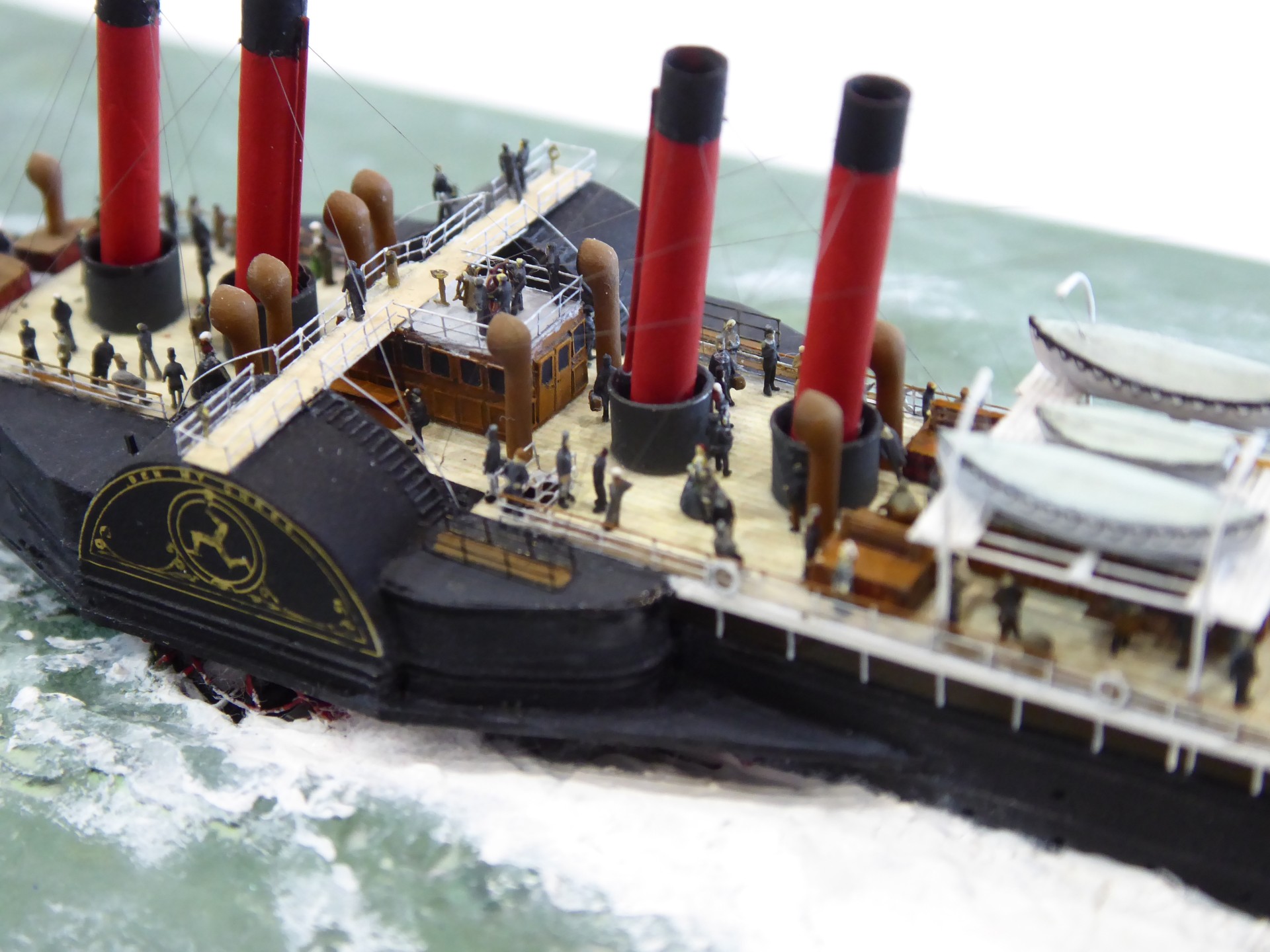 Das Logo und die Verzierungen an den Schaufelkästen sowie die Heckornamente und der Schiffsname wurden speziell für mich gezeichnet und mehrfach (!) als Decals auf einem A4-Bogen gedruckt, sodass zahlreiche Ersatzteile in unterschiedlichen Größen mit Abstufungen von jeweils ±0,1 mm zur Verfügung standen. Die einzigartigen Beiboote wurden eigens entworfen und von einem Freund in Frankreich in 3D gedruckt. Passagiere und Besatzung sind 1/700-3D-gedruckte Zivilfiguren der deutschen Firma Modellbauray.com.