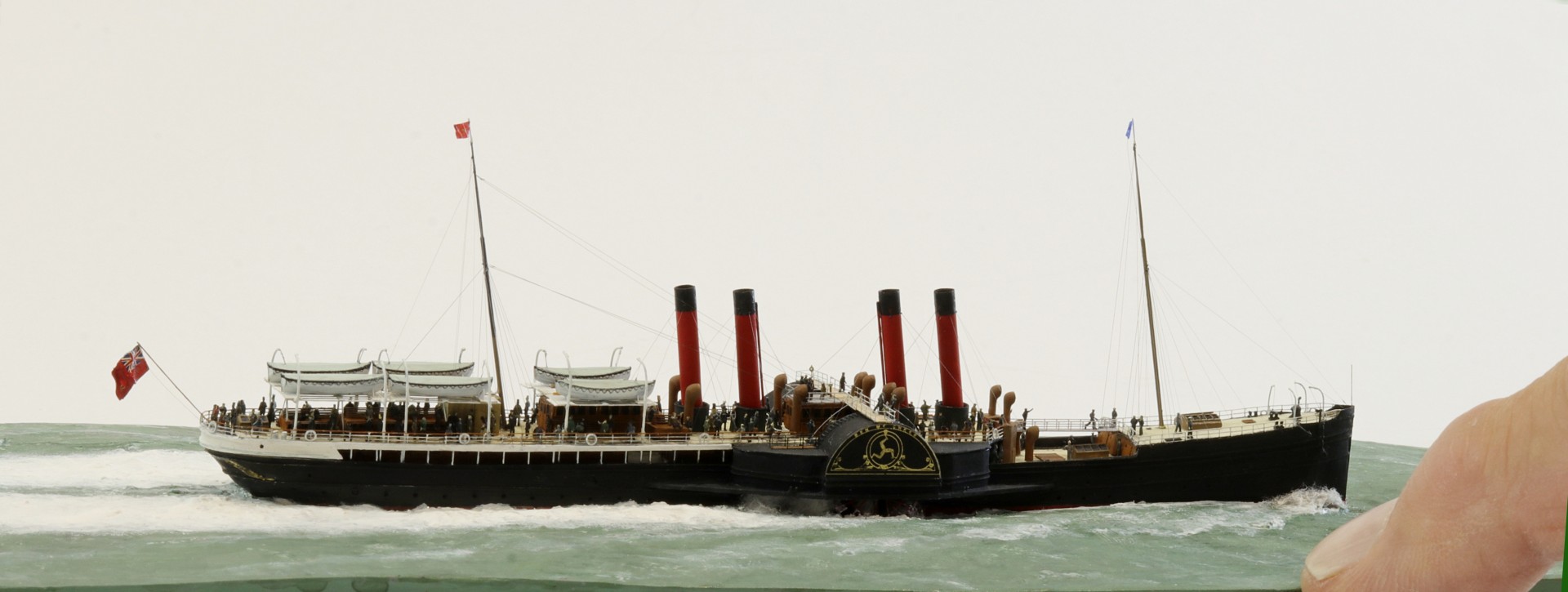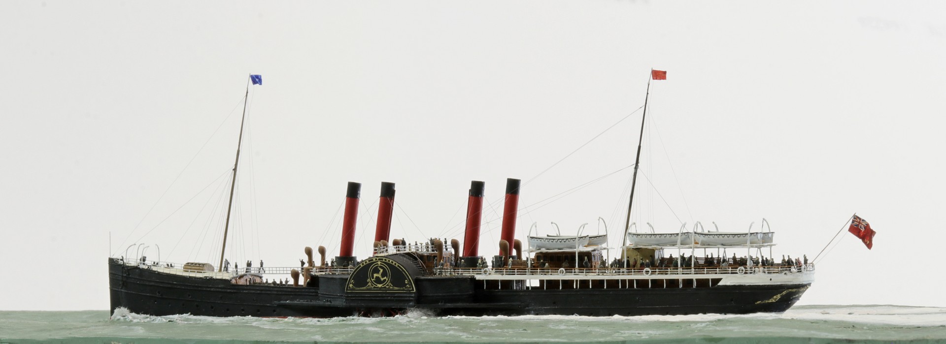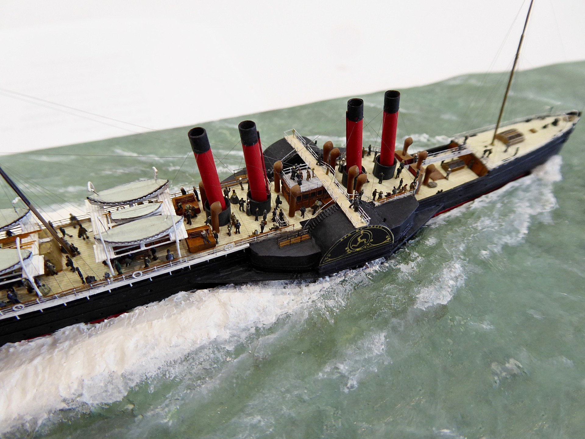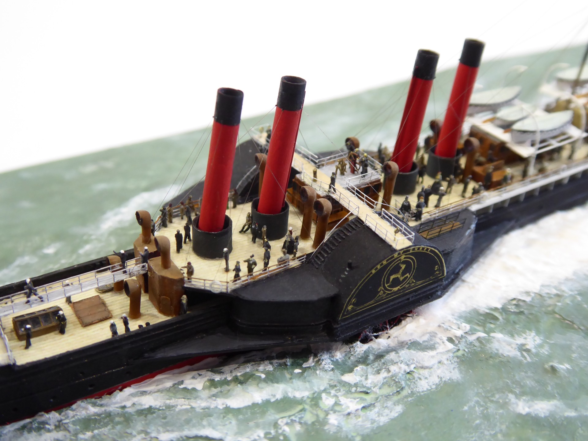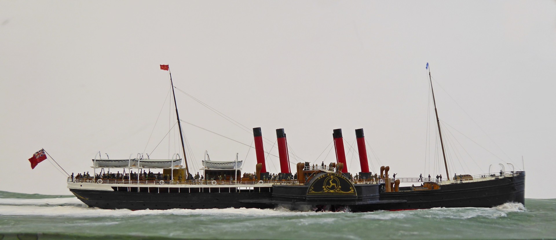 Das Logo und die Verzierungen an den Schaufelkästen sowie die Heckornamente und der Schiffsname wurden speziell für mich gezeichnet und mehrfach (!) als Decals auf einem A4-Bogen gedruckt, sodass zahlreiche Ersatzteile in unterschiedlichen Größen mit Abstufungen von jeweils ±0,1 mm zur Verfügung standen. Die einzigartigen Beiboote wurden eigens entworfen und von einem Freund in Frankreich in 3D gedruckt. Passagiere und Besatzung sind 1/700-3D-gedruckte Zivilfiguren der deutschen Firma Modellbauray.com.