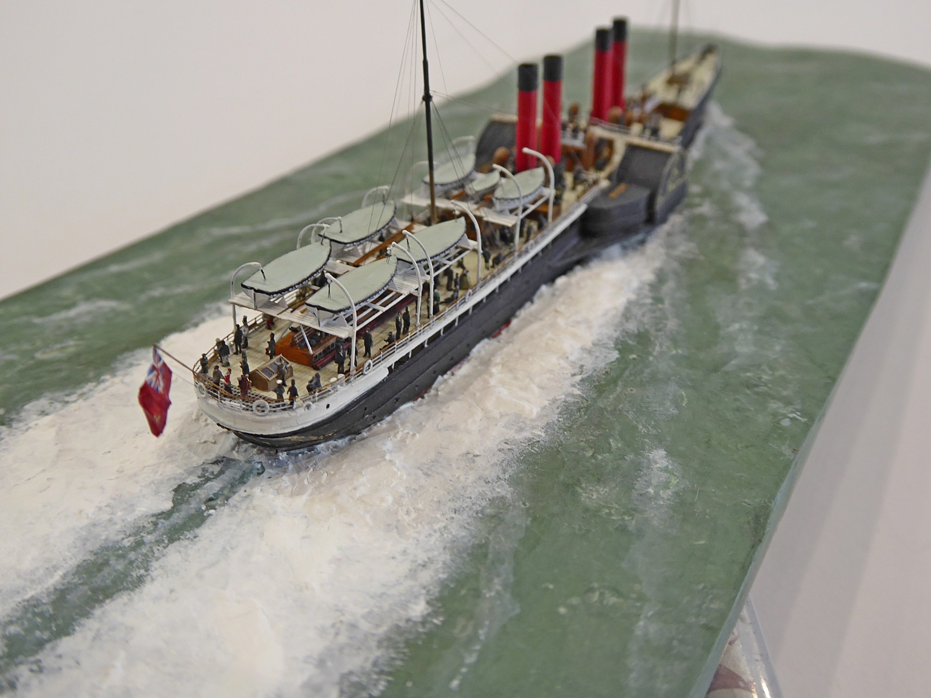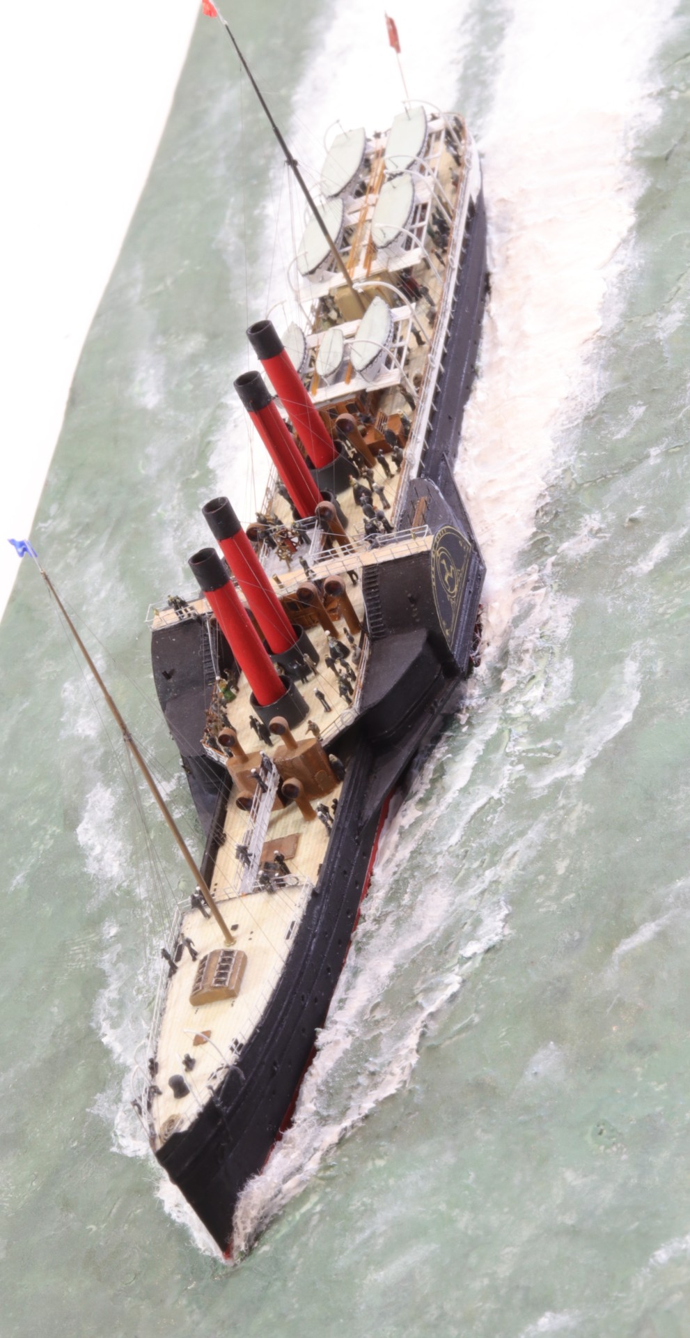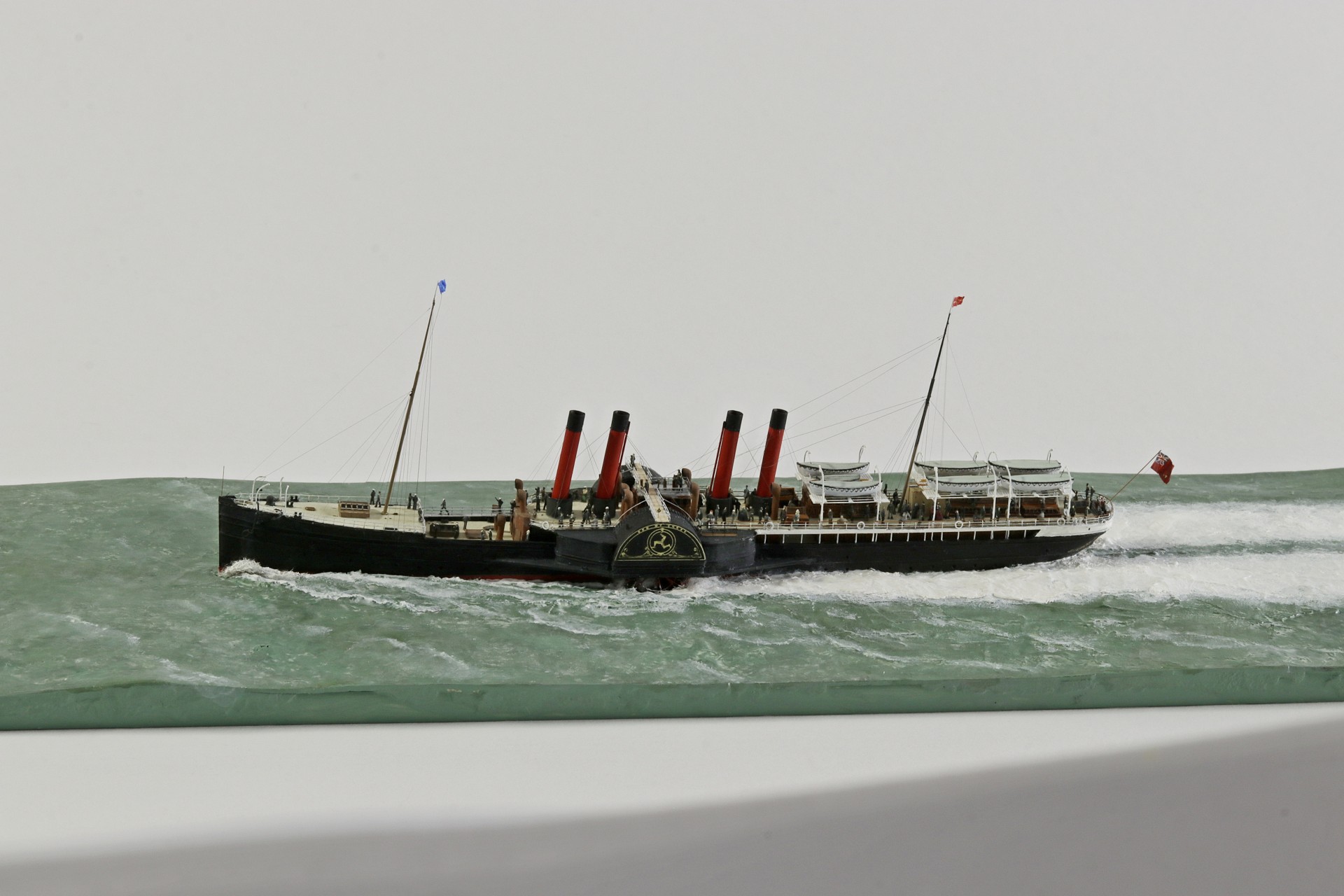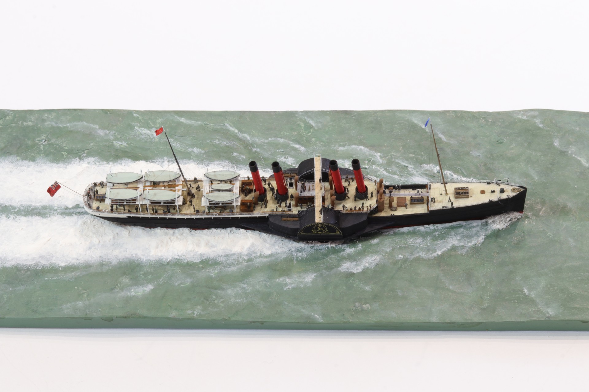 Das Logo und die Verzierungen an den Schaufelkästen sowie die Heckornamente und der Schiffsname wurden speziell für mich gezeichnet und mehrfach (!) als Decals auf einem A4-Bogen gedruckt, sodass zahlreiche Ersatzteile in unterschiedlichen Größen mit Abstufungen von jeweils ±0,1 mm zur Verfügung standen. Die einzigartigen Beiboote wurden eigens entworfen und von einem Freund in Frankreich in 3D gedruckt. Passagiere und Besatzung sind 1/700-3D-gedruckte Zivilfiguren der deutschen Firma Modellbauray.com.