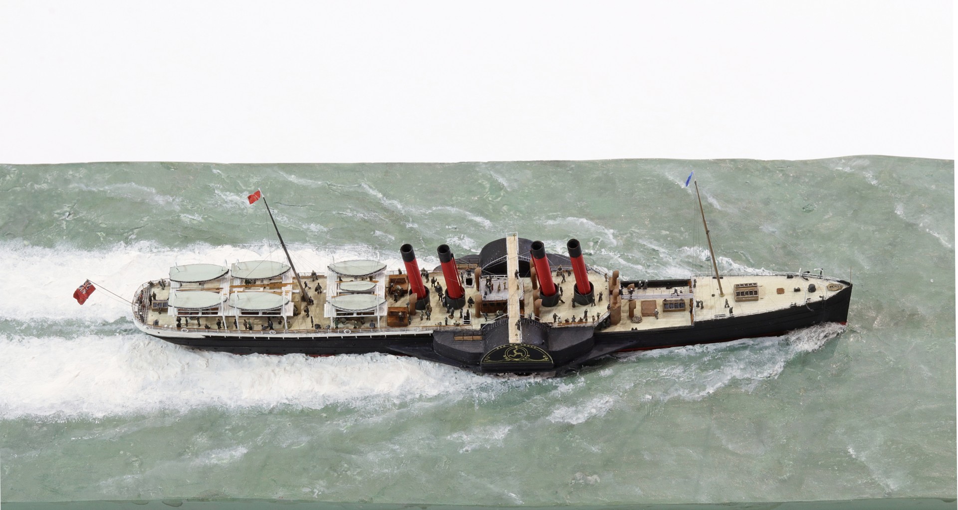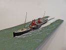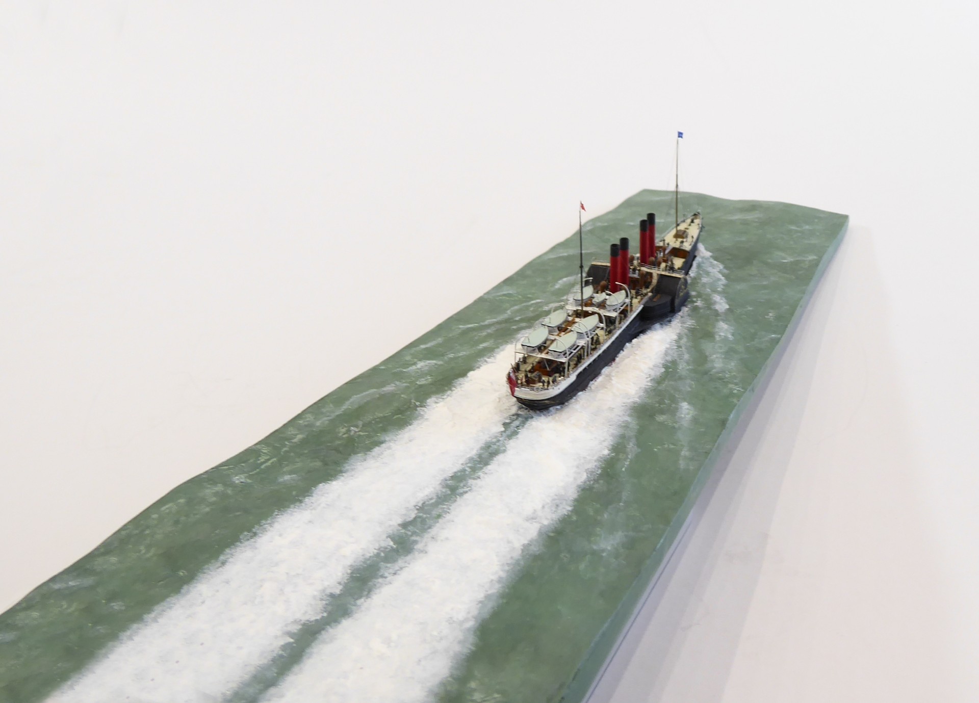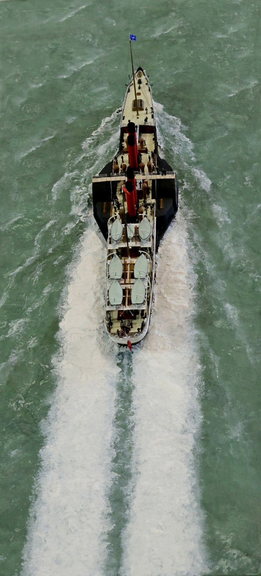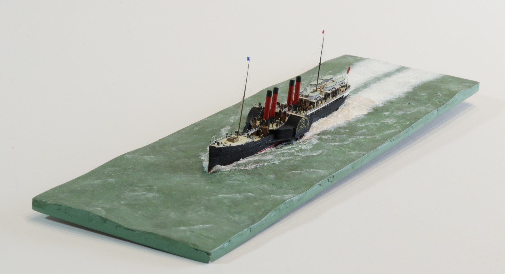 Das Logo und die Verzierungen an den Schaufelkästen sowie die Heckornamente und der Schiffsname wurden speziell für mich gezeichnet und mehrfach (!) als Decals auf einem A4-Bogen gedruckt, sodass zahlreiche Ersatzteile in unterschiedlichen Größen mit Abstufungen von jeweils ±0,1 mm zur Verfügung standen. Die einzigartigen Beiboote wurden eigens entworfen und von einem Freund in Frankreich in 3D gedruckt. Passagiere und Besatzung sind 1/700-3D-gedruckte Zivilfiguren der deutschen Firma Modellbauray.com.