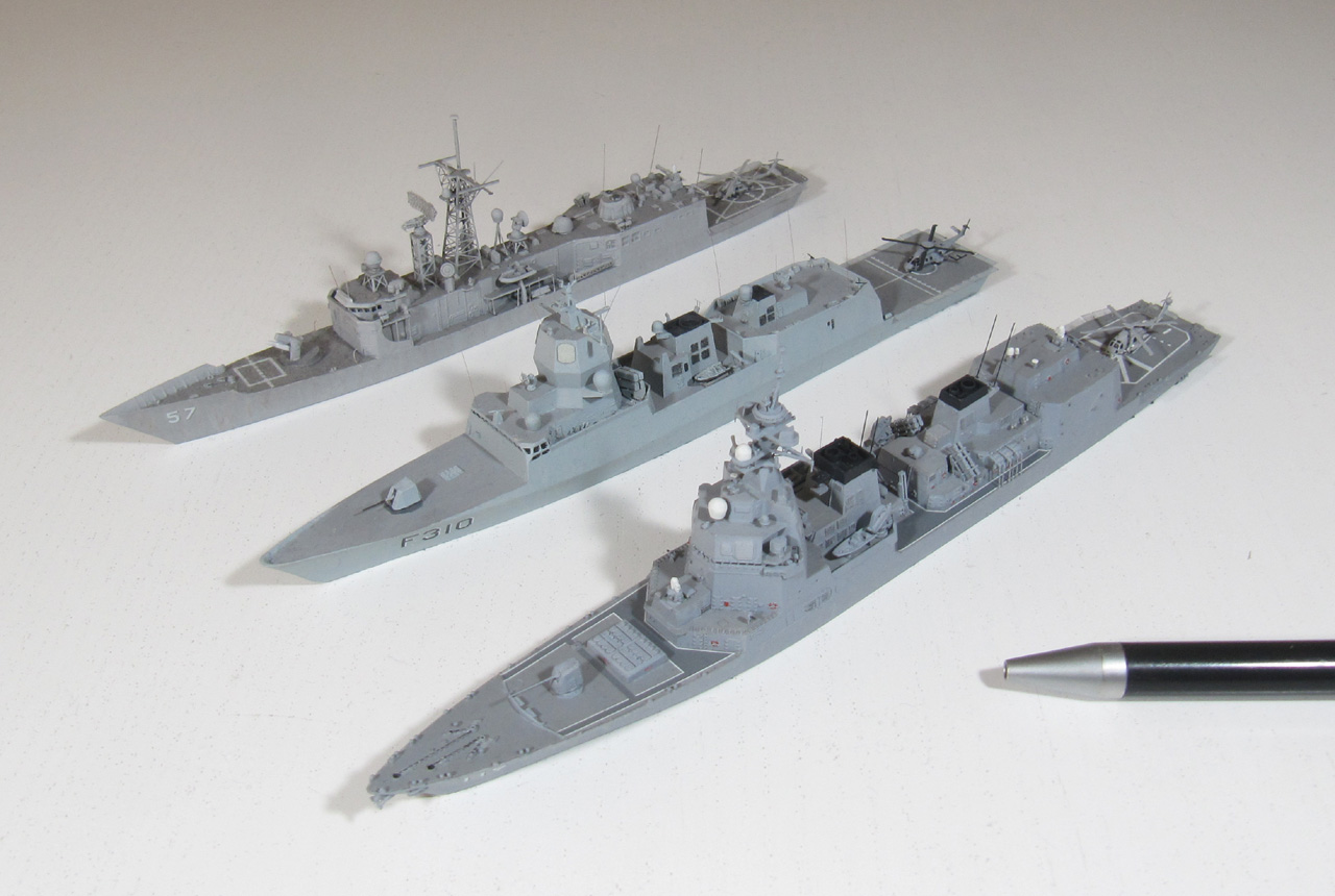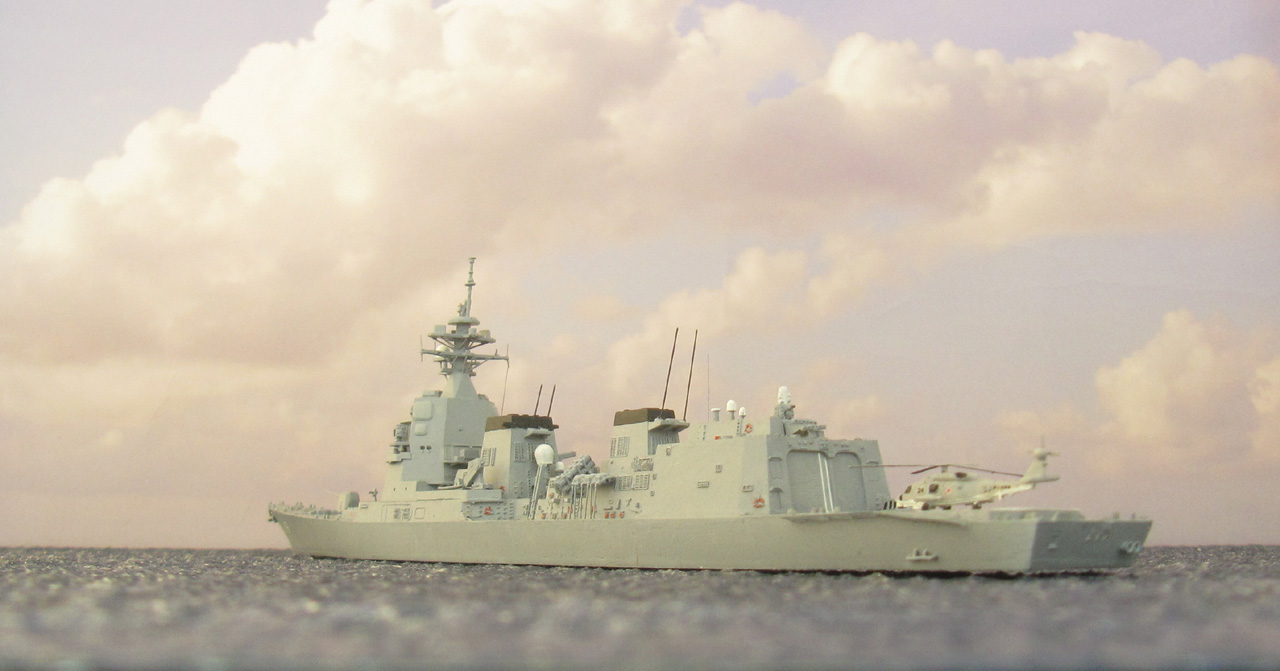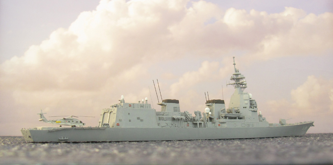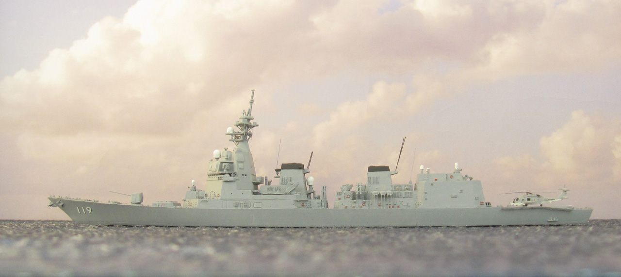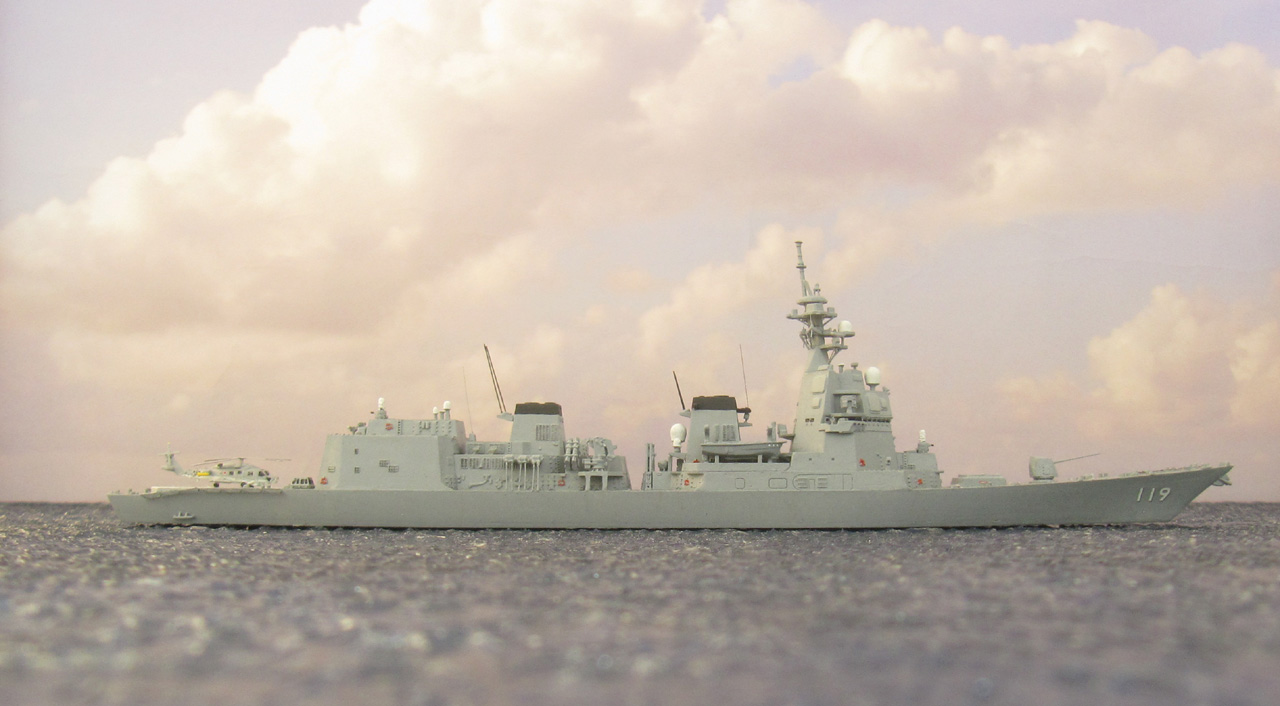 Für die Bemalung verwendete ich Acrylfarben von Vallejo Model Color. Für die Seiten benutzte ich 155 (990) Silbergrau, für die Decks 158 (870) Mittelgrau. Die FCS-3A-Radarantennen bemalte ich mit 154 (989) Signalgrau, viele der anderen Antennen mit 4 (820) Cremeweiß, die Schornsteinoberseiten mit 167 (995) Anthrazitgrau, den SH-60K mit 154 (989) Signalgrau und 4 (820) Cremeweiß und die Rettungsringe und einige andere Ausrütungsgegenstände an den Aufbauwänden mit 28 (909) Verkehrsrot. Die Abziehbilder sind aus dem Bausatz.