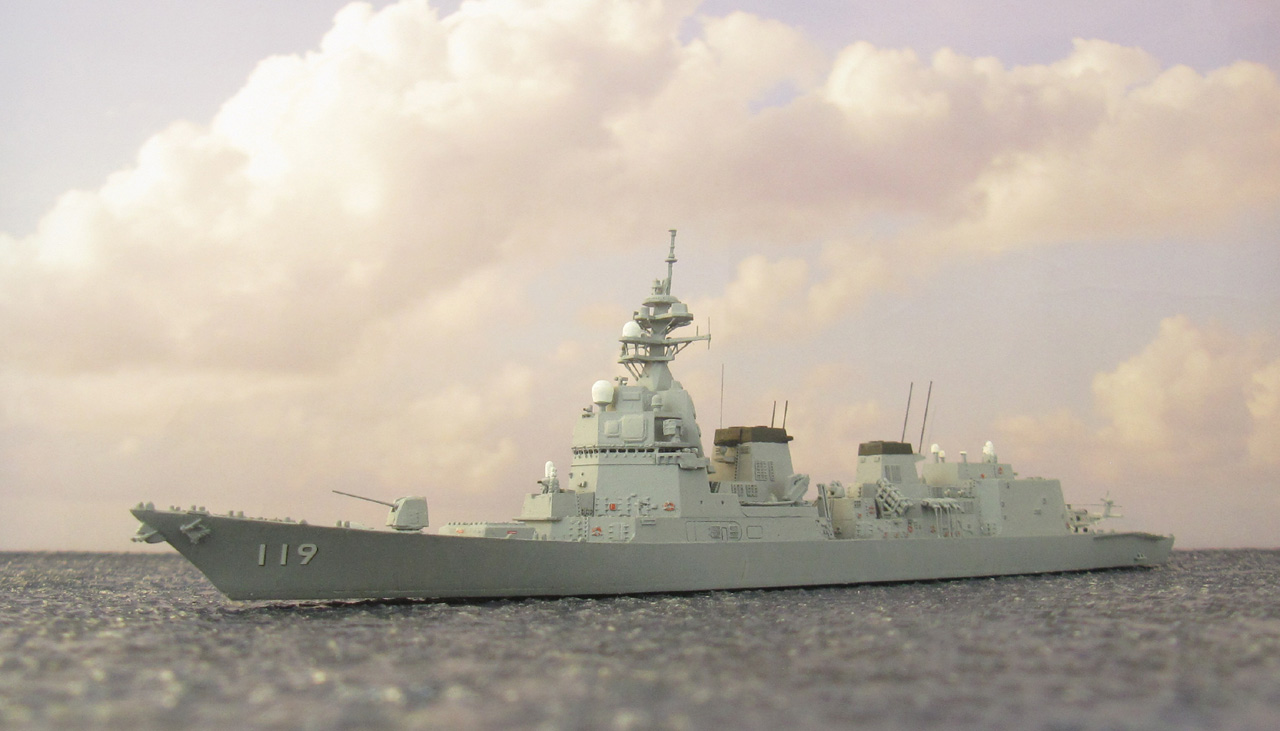 Das Modell des japanischen Zerstörers Asahi baute ich ich aus dem Bausatz von Pit-Road (Bausatzbesprechung). Das Deckelbild zeigt Asahi im Zustand bei der Fertigstellung ohne die OPS-48-Radarantennen (Teile G12) oberhalb der achteren Antennen des FCS-3A-Radars. Ich entschied mich für den Bauzustand zwischen 2020 und 2022, als sie komplett ausgerüstet war.