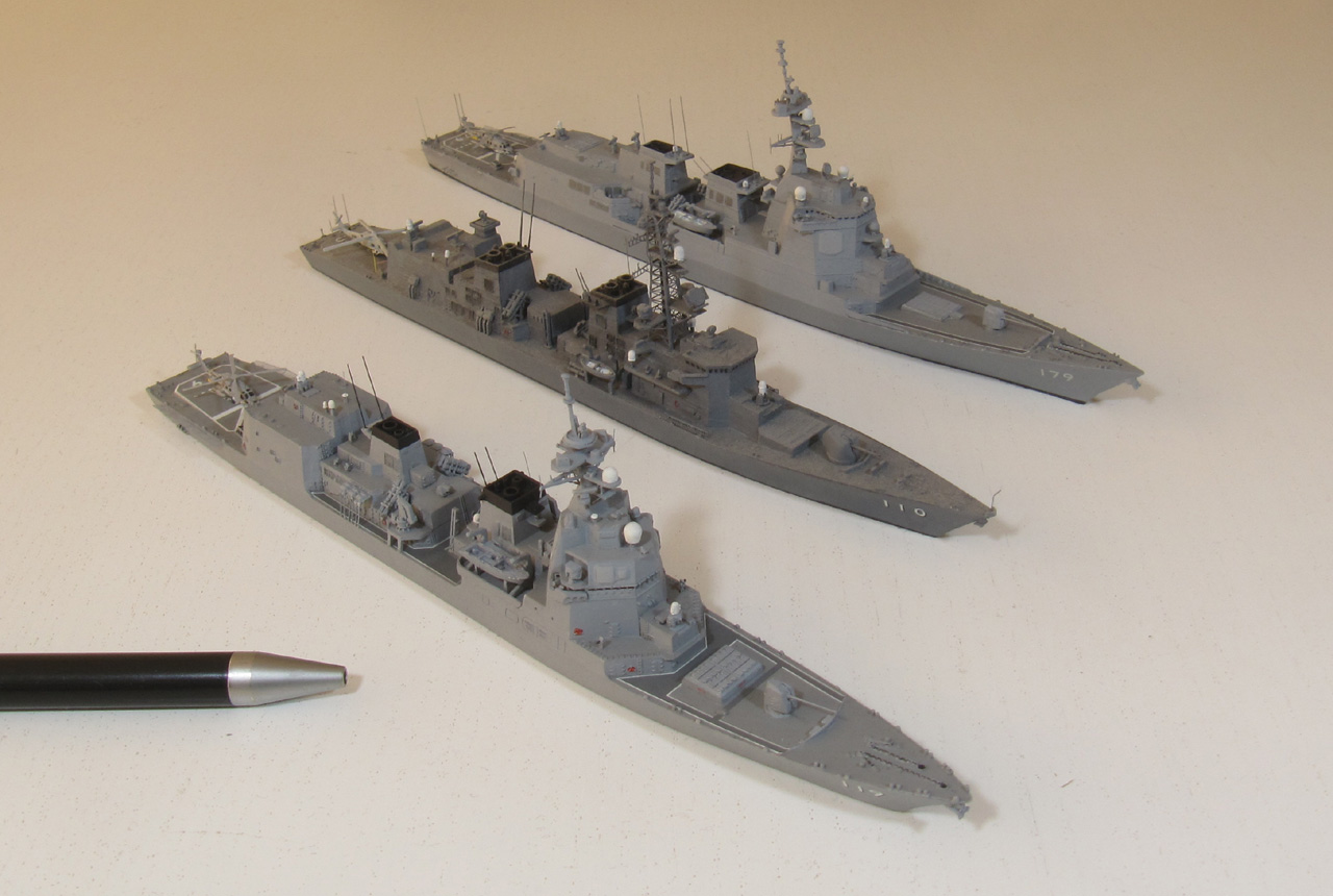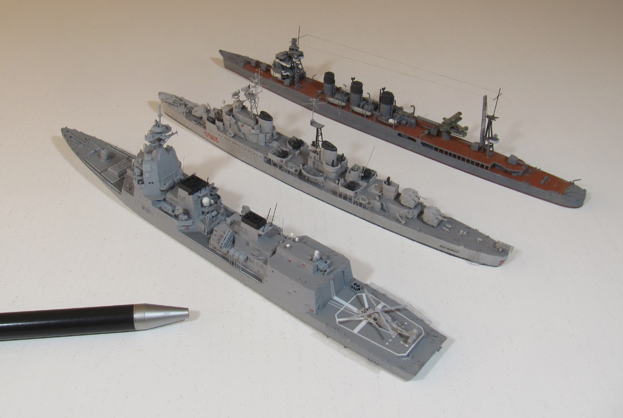 Links die Asahi mit zwei weiteren heutigen japanischen Schiffen, einem Zerstörer der Vorgängerklassen, der Takanami (2003), sowie einem der größeren Lenkwaffenzerstörer, der Maya (2020). In der Mitte mit zwei Fregatten mit ähnlichen Aufgaben, der norwegischen KNM Fridtjof Nansen (2006) und USS Reuben James (1986). Rechts mit zwei älteren Schiffen, dem italienischen Zerstörer San Marco (1956) sowie dem japanischen Leichter Kreuzer Abukuma (1925).