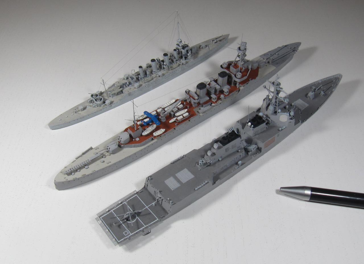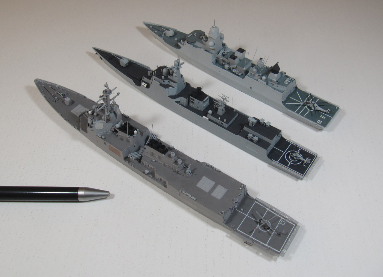 Für die Bemalung nutzte ich Acrylfarben von Vallejo Model Color: 154 (989) Signalgrau für die vertikalen Teile des Anstrichs, 159 (991) Staubgrau für die Decks (also wie ich auch Schiffe der US Navy bemalen würde), 167 (995) Anthrazitgrau für die Schornsteinkappen, 152 (883) Hellgrau für die SPY-1-Radarantennen und 158 (870) Mittelgrau für den Super Lynx-Hubschrauber. Die Tore der Beiboothangar sind etwas schwierig darzustellen. Ich bemalte sie mit einer 1/1-Mischung aus 136 (818) Rotes Leder und 153 (907) Hellblaugrau. Die Abziehbilder nahm ich aus dem Bausatz.