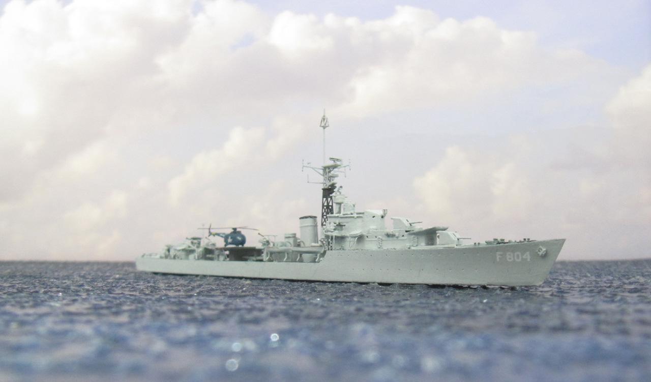 Ich benutzte folgende Acrylfarben von Vallejo Model Color für die Bemalung: 153 (907) Hellblaugrau mit 4 (820) Cremeweiß im Verhältnis 1:1 gemischt für die vertikalen Flächen, 157 (904) Dunkelblaugrau für die Decks, 110 (986) Achatgrau für einen Teil des Brückendecks, 167 (995) Anthrazitgrau für Teil des Masts und einige andere Teile und 57 (963) Enzianblau Hell mit 167 (995) Anthrazitgrau im Verhältnis 4:1 gemischt für den Sikorsky H04S-3. Letztere erhielt noch einige gelbe Warnflächen, für die ich 15 (953 Signalgelb) verwendete. Dem Bausatz liegen die Kennnummern der Piet Hein als Fregatte (F804 statt D805) nicht bei, auch für den Hubschrauber gibt es keine Abziehbilder. Ich zeichnete diese (wofür mir Maarten Schönfeld eine passende Schriftart zur Verfügung stellte. Vielen Dank!) und ließ sie bei Tailormadedecals drucken.
