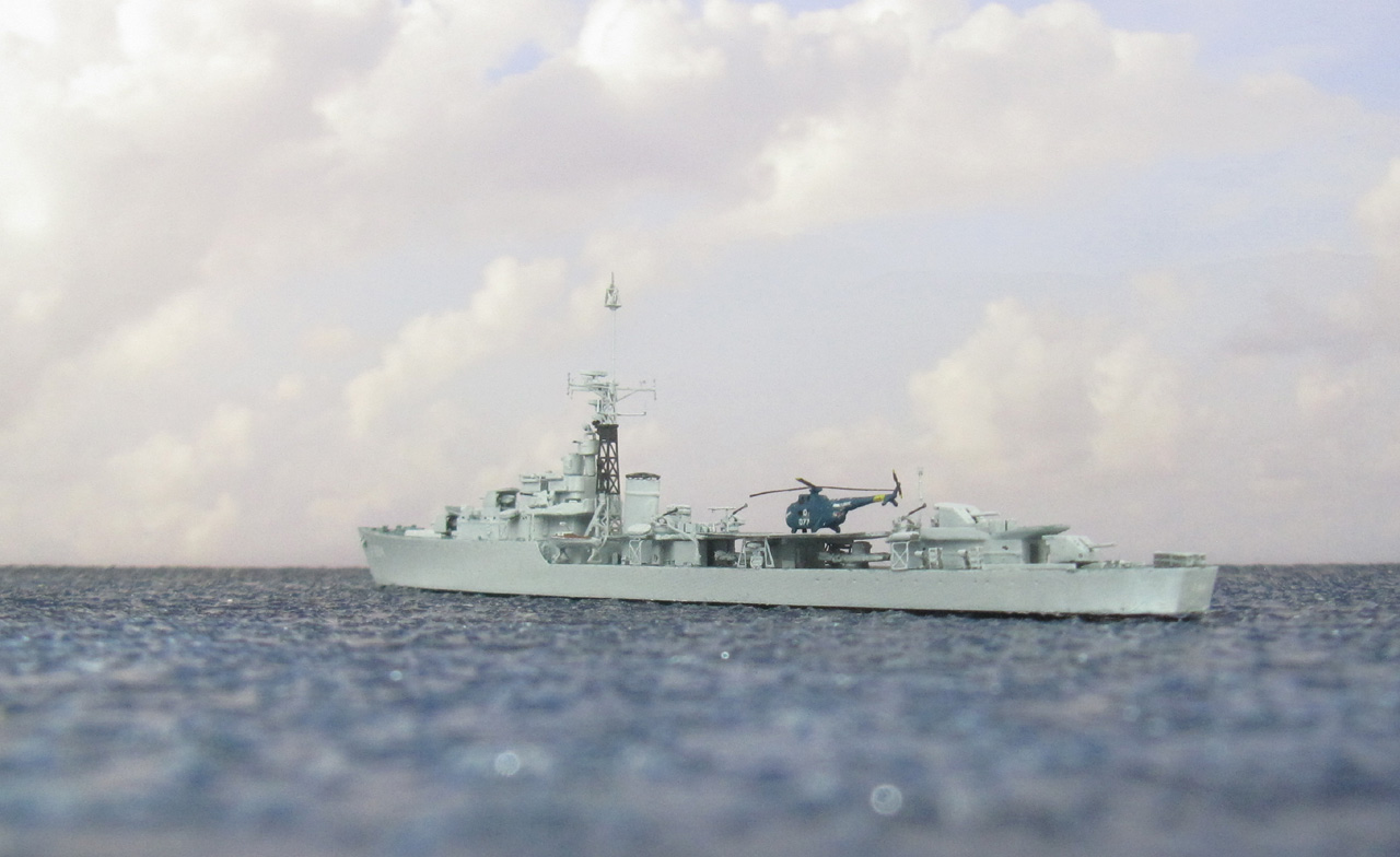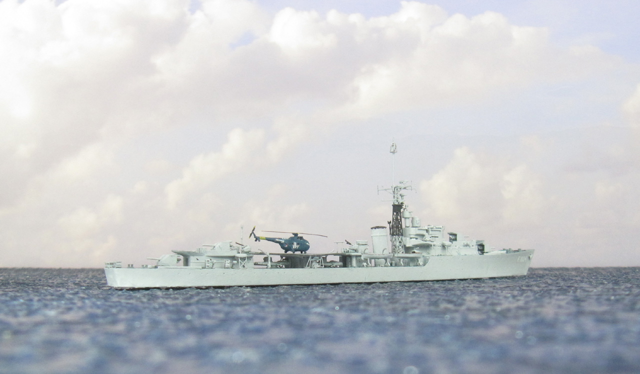 Die niederländische Fregatte Hr. Ms. Piet Hein habe ich aus dem Bausatz von Starling Models gebaut. Starling Models bietet zwei Varianten der Piet Hein an: als Zerstörer und nach dem Umbau zur Fregatte. Letzterer Bausatz wird als "HNLMS Piet Hein Helicopter Carrier" bezeichnet (siehe Bausatzbesprechung). Mein Modell stellt den Bauzustand zwischen 1958 und 1961 dar, genauer den, als eine Sikorsky H04S-3 auf ihr landete.