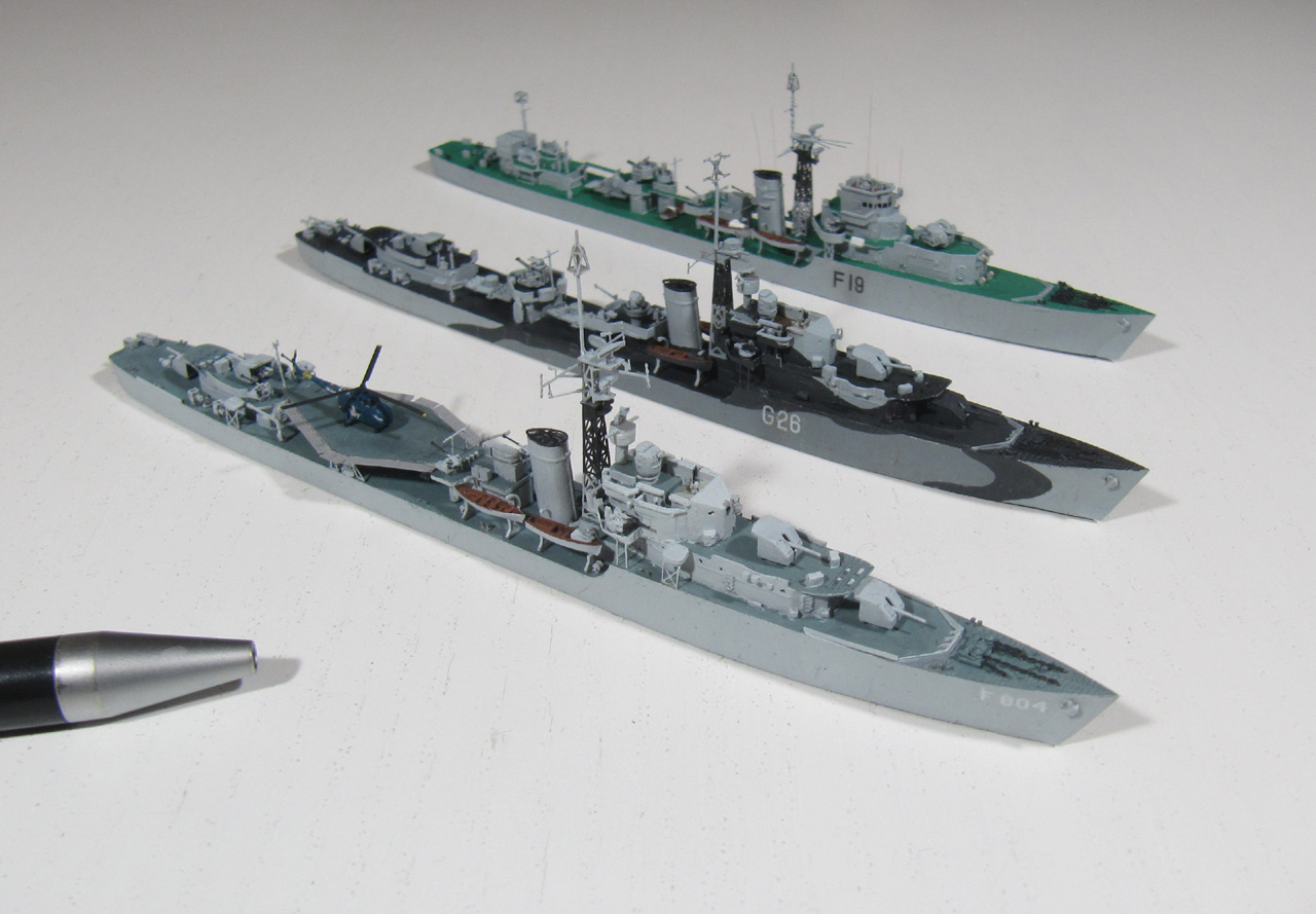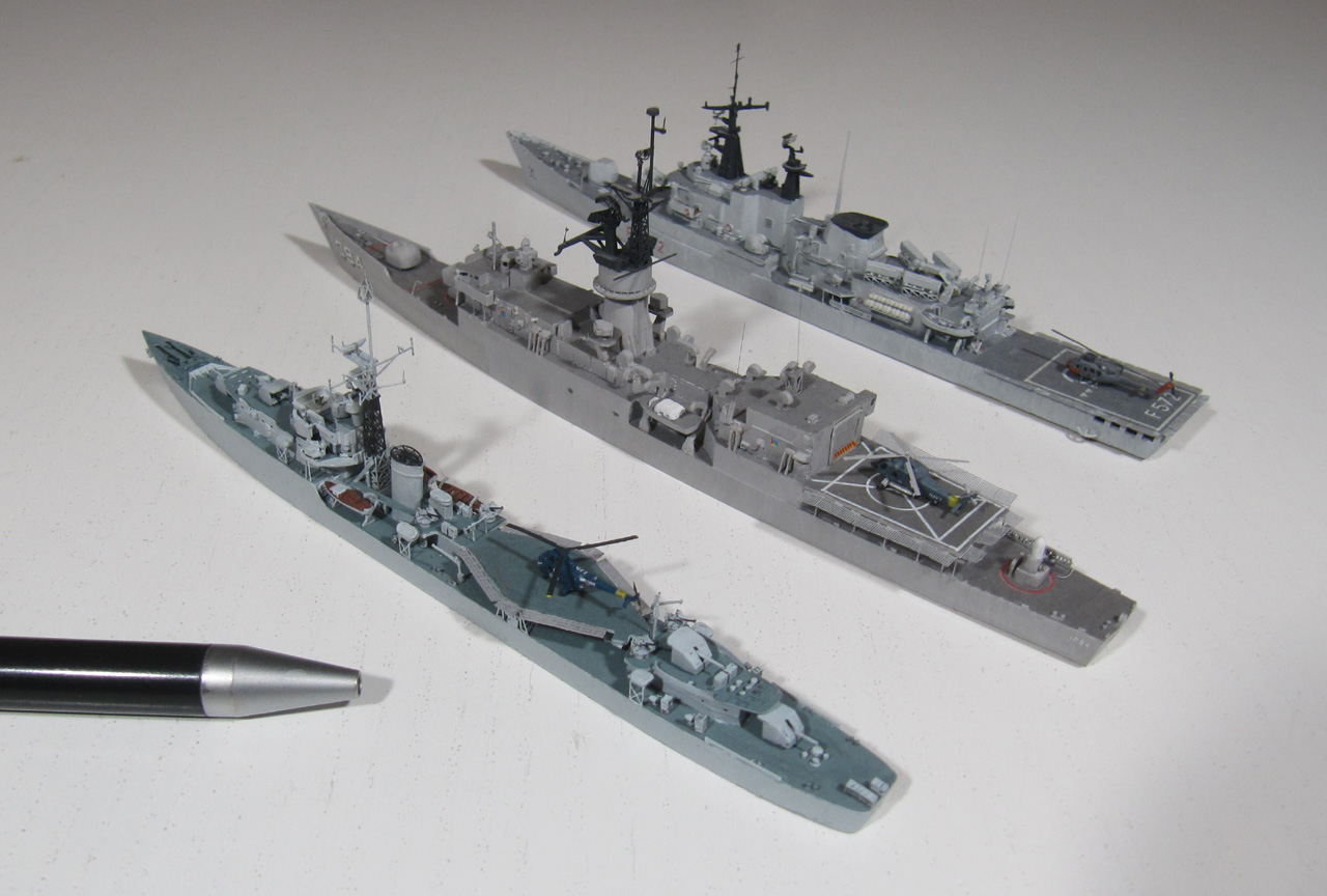 Hier Piet Hein mit zwei späteren Fregatten mit unterschiedlichen Anordnungen der Hubschrauberdecks: USS Pharris (1974) und der italienischen MMI Libeccio (1983):