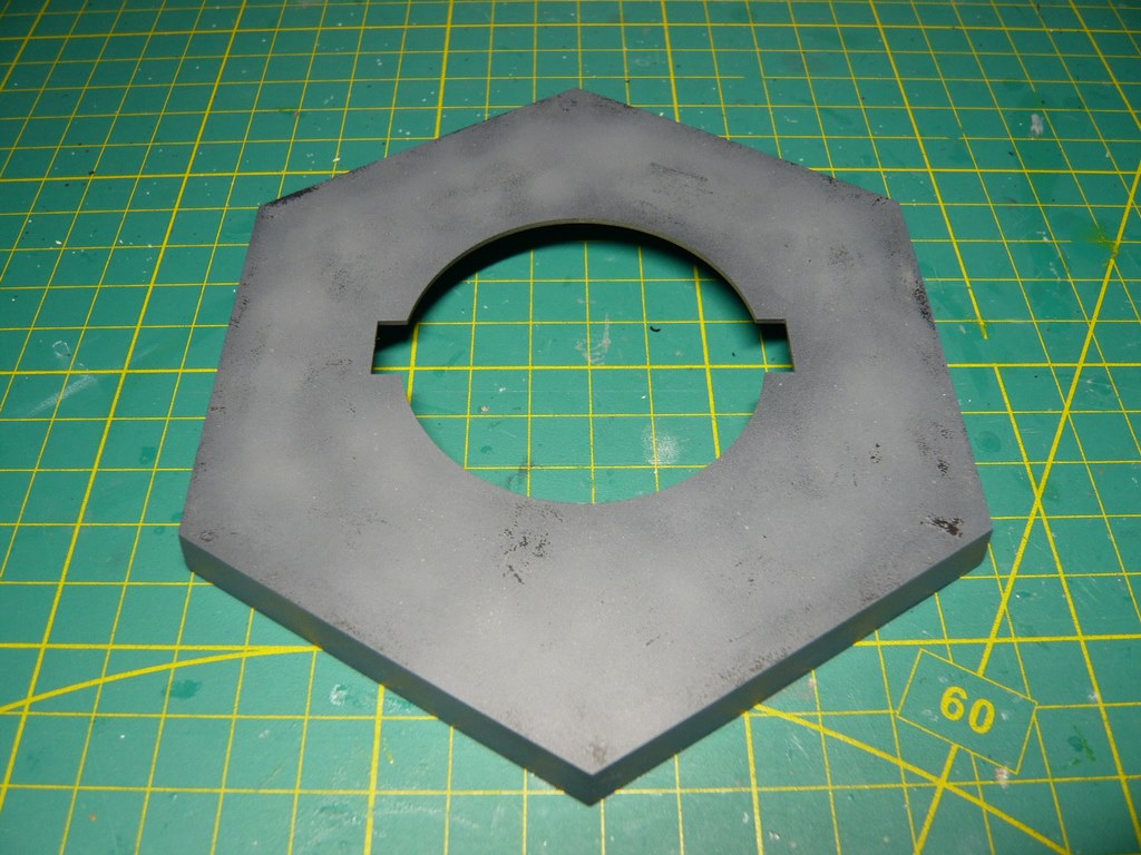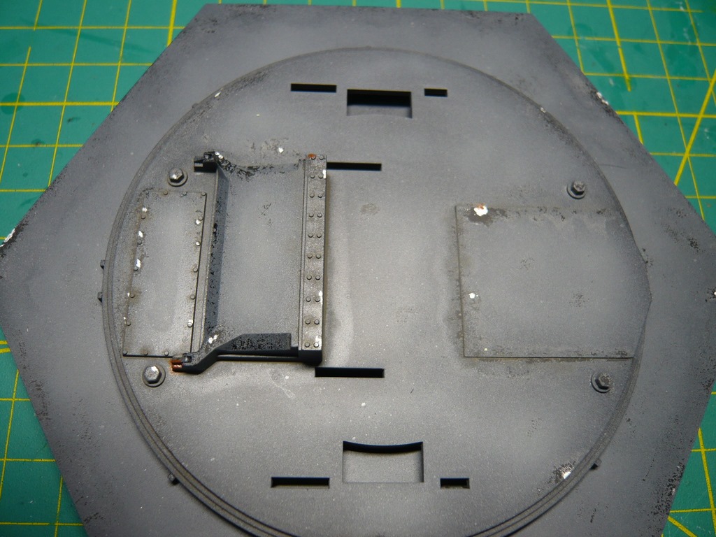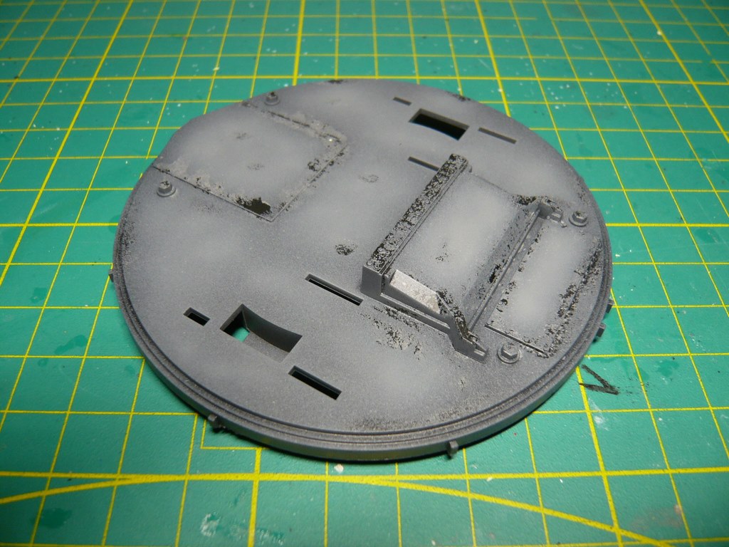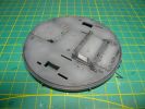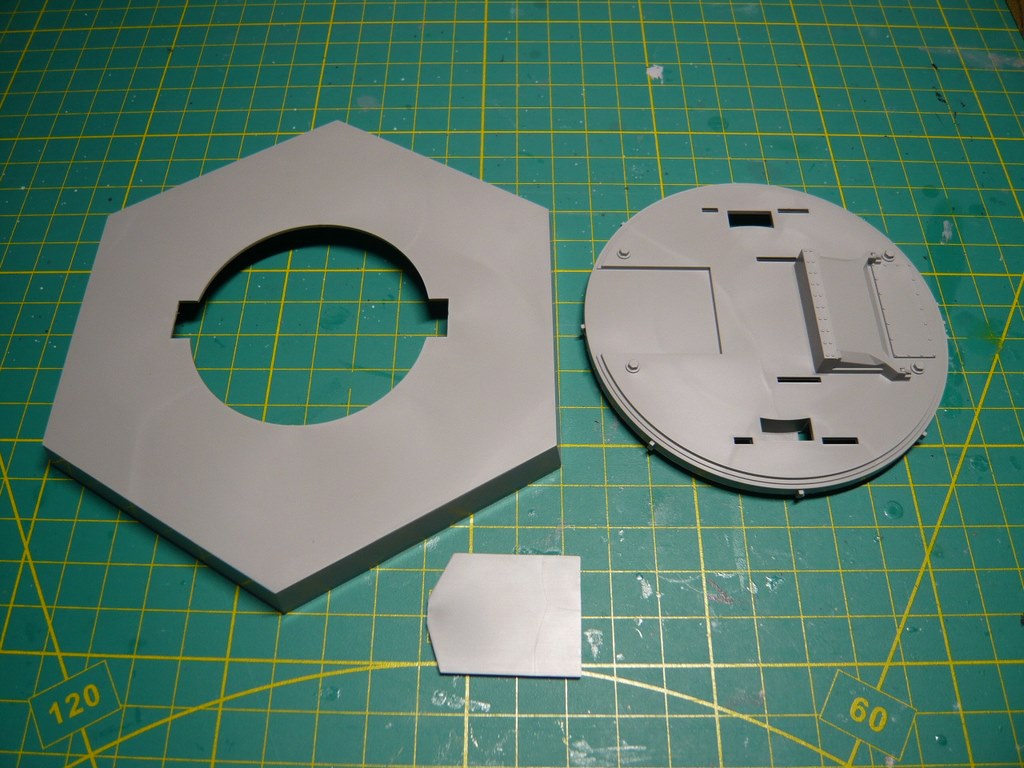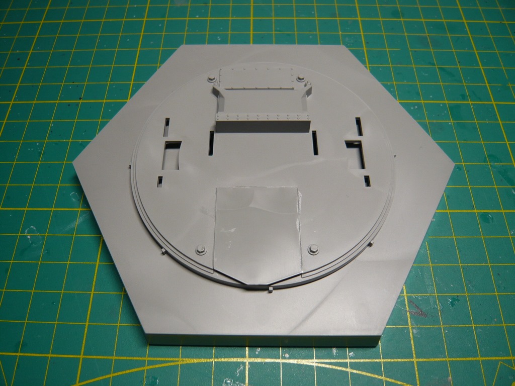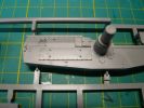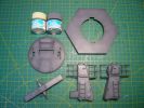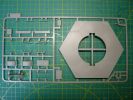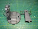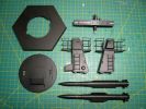 Zu Beginn wird der Raketenträger zusammengesetzt. Das harte Plastik erleichtert das Entfernen der Angüsse, und die Passgenauigkeit ist sehr gut; lediglich die Verbindungsnähte erfordern etwas Nacharbeit. Der Sockel besteht aus drei Teilen, die nicht verklebt werden und dadurch drehbar bleiben. Anschließend folgen die seitlichen Stützen, bei denen auch die ersten Ätzteile für den „Fußboden“ zum Einsatz kommen.