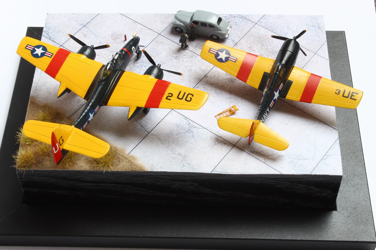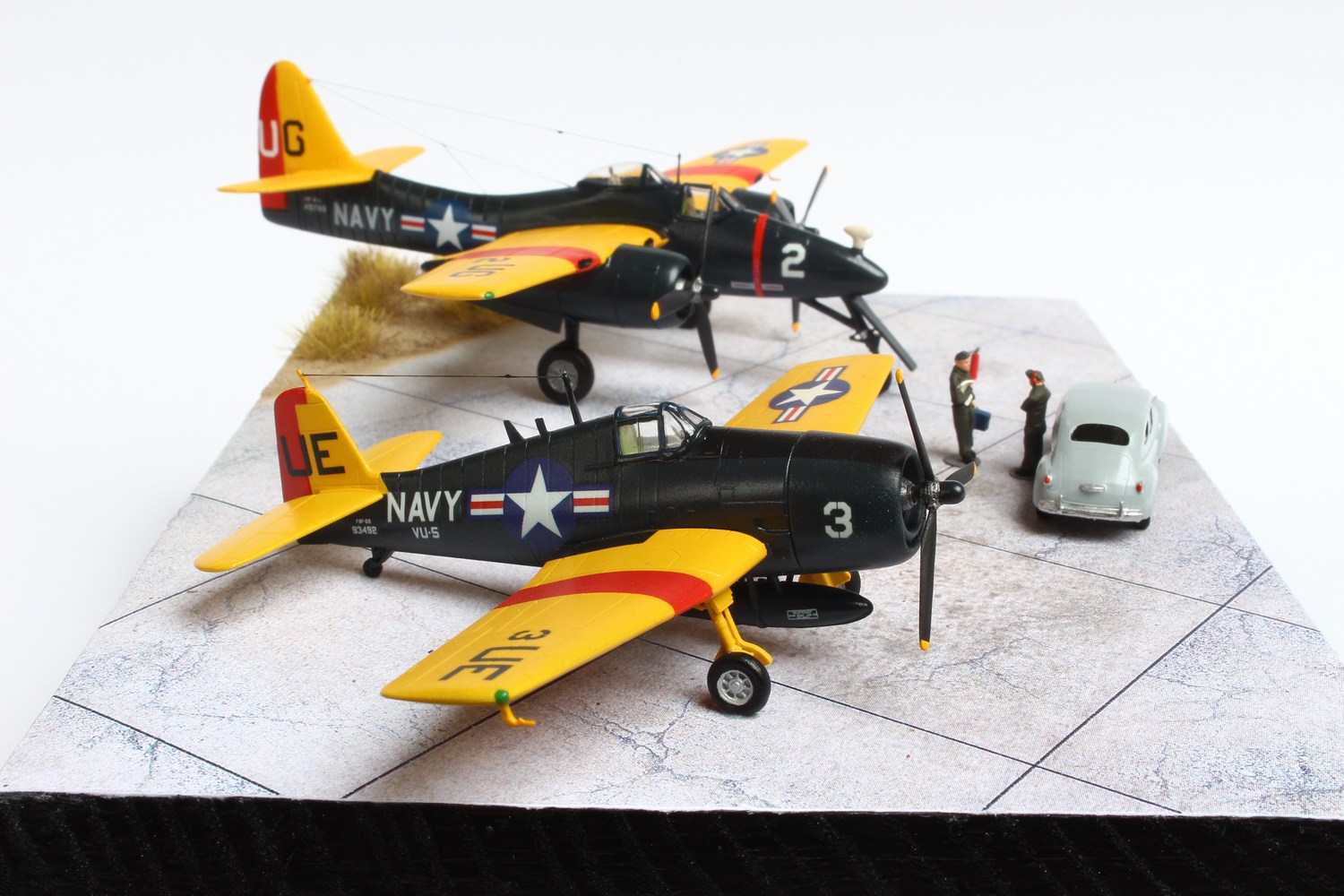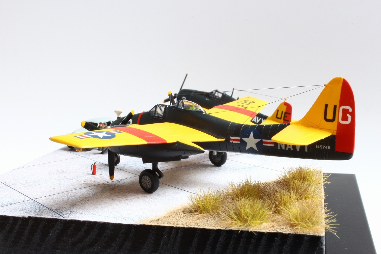 Der „glossy sea blue“-Anstrich der frühen US Navy-Jahre, besonders zu Zeiten des Korea-Krieges, wurde für die Drohnenleitflugzeuge mit einem auffälligen gelb-roten Anstrich ergänzt. Das sieht man nicht alle Tage! Und erst recht nicht bei einer Tigercat! In der -2D-Version musste „nur“ noch das hintere Cockpit nebst Haube der F8F Bearcat ergänzt werden. Jedoch: Die Tigercat besteht aus vollmassiv gegossenem Resin und trägt ein Bugfahrwerk! Tailsitter vorprogrammiert! All meine Bemühungen, Gewicht hinter der Mittelachse im Rumpf mittels Fräser herauszunehmen, quasi hohl zu machen, bei gleicher Methode den vorderen Rumpfbereich und sogar die Motorzellen mit winzigen „Liquid Gravity“-Bleikügelchen zu füllen, schlugen fehl! Stand die Maschinen vor der Montage des Höhenleitwerks noch wunderbar sicher auf dem Bugfahrwerk, war es nach der Montage der beiden Leitwerkflächen vorbei! Bei solch einem minimalen Gewicht! Hier hatte ich ein „déjà vu“, das gleiche passierte mir vor Jahren schon einmal bei meinem Bau der Grumman C1-A Trader. Fräsen bis der Arzt kommt, hinten leeren, vorne verbleien – und doch war’s nix! Nun gut, in diesem Fall zog dieser Umstand ein Verkleben auf der Sockelplatte nach sich. Zur Sicherheit habe ich das Vorderrad der Tigercat noch mit einem 0,3er Messingdraht gestiftet, den ich im Massivholzsockel einklebte.