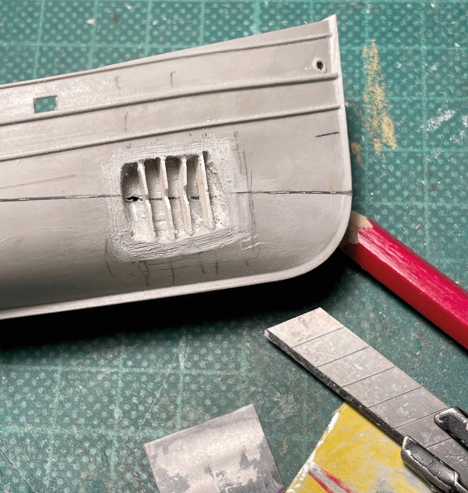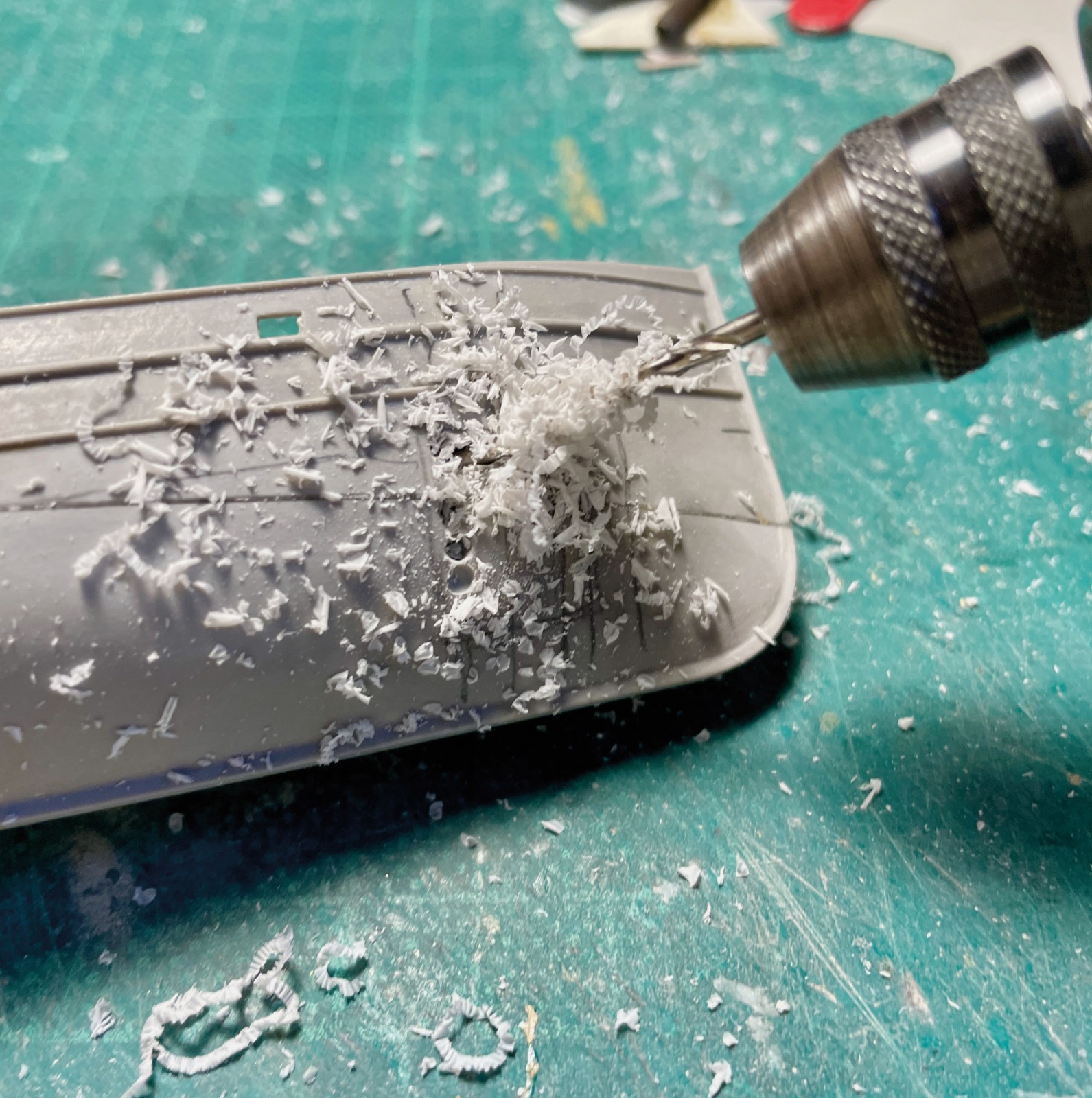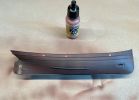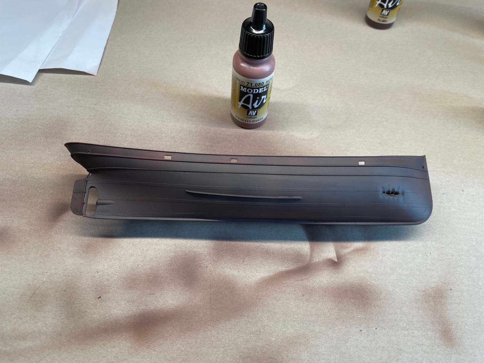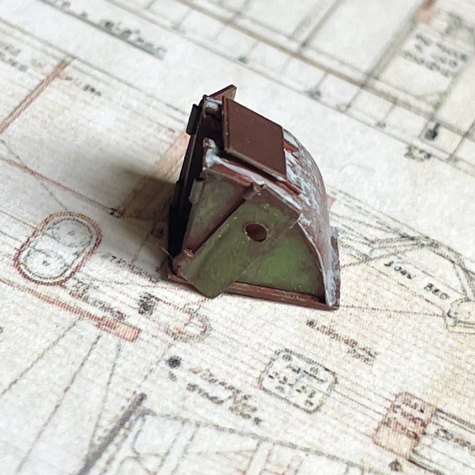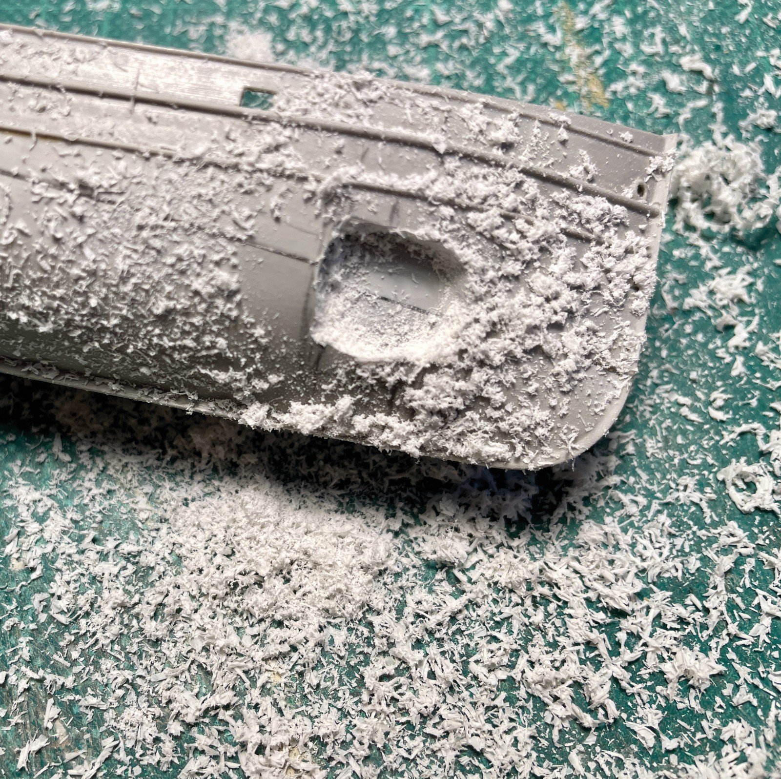 Ein kleines, eigenes Modell stellte der Abgang in den vorderen Bugbereich dar. Er sollte fragil und zerbrechlich wirken, die Türen offen und teilweise aus den Angeln gerissen. Anfänglich war da eine Enttäuschung, als sich das sehr dünne Plastik durch den Klebstoff zu verformen begann. Irgendwie brauchte ich Abstand nach der scheinbar vergeblichen Mühe und ließ es liegen. Lackierte es dann irgendwann, den Rest einer Farbe versprühend und es fing mir an zu gefallen. Was anfänglich ziemlich verhunzt - darum keine Fotos - ausgesehen hat trat nun, überraschend realistisch nach Blech aussehend in Erscheinung und ich arbeitete geduldig weiter Schicht um Schicht.