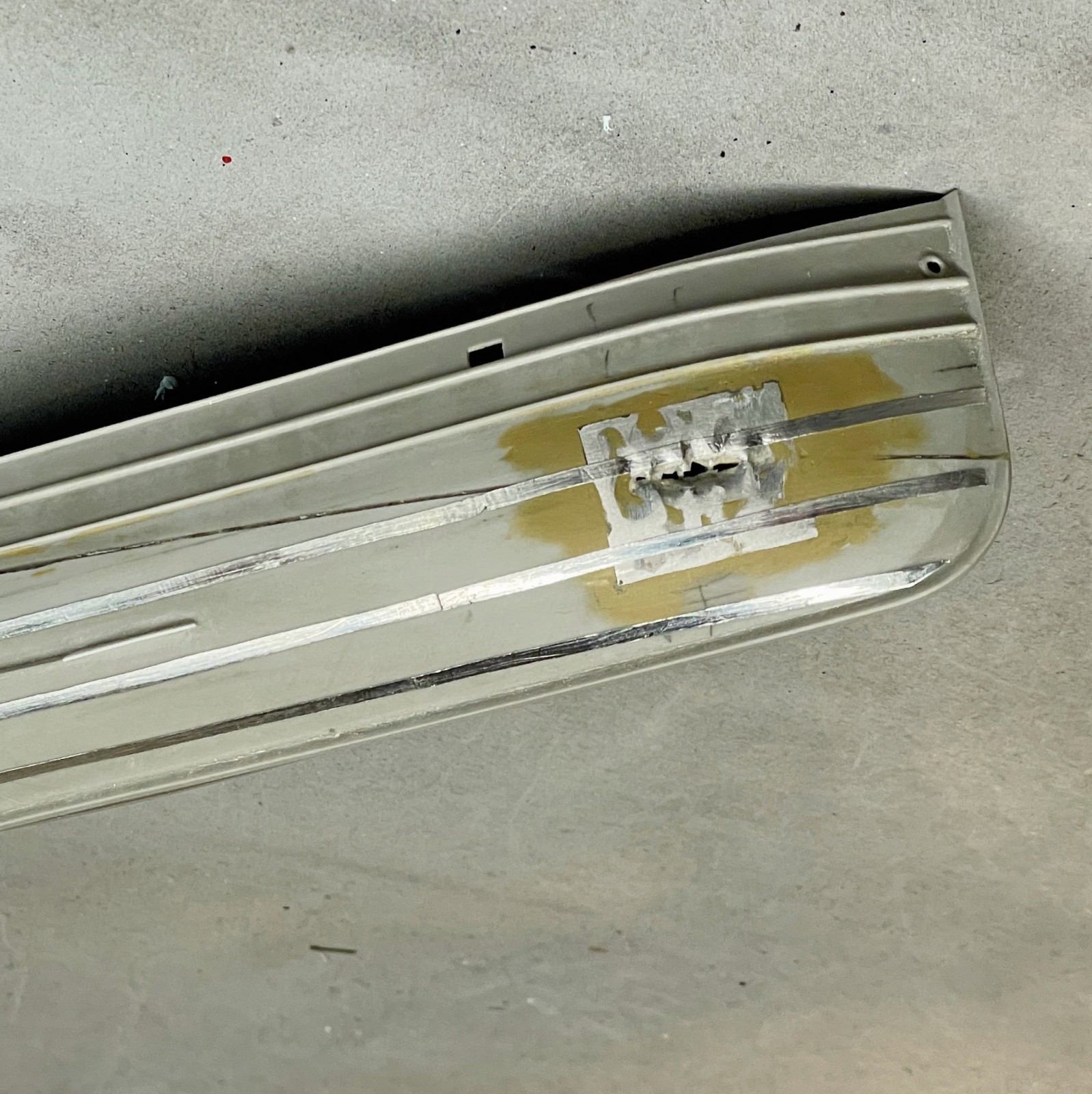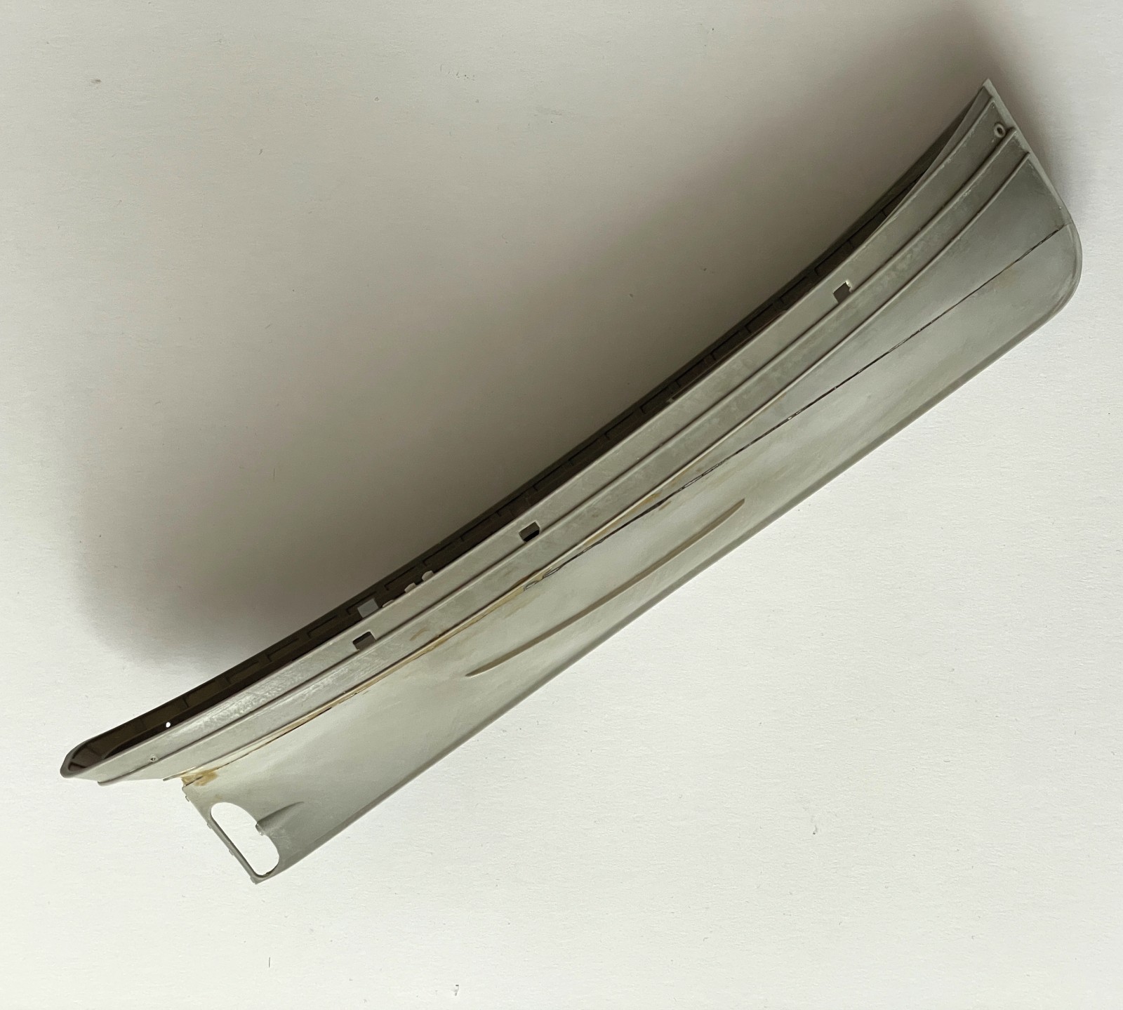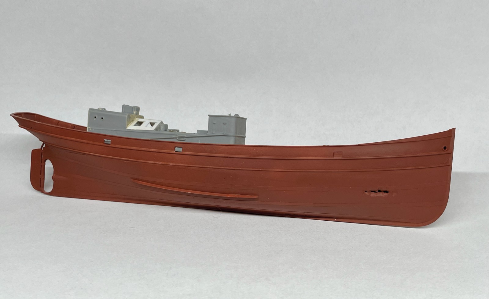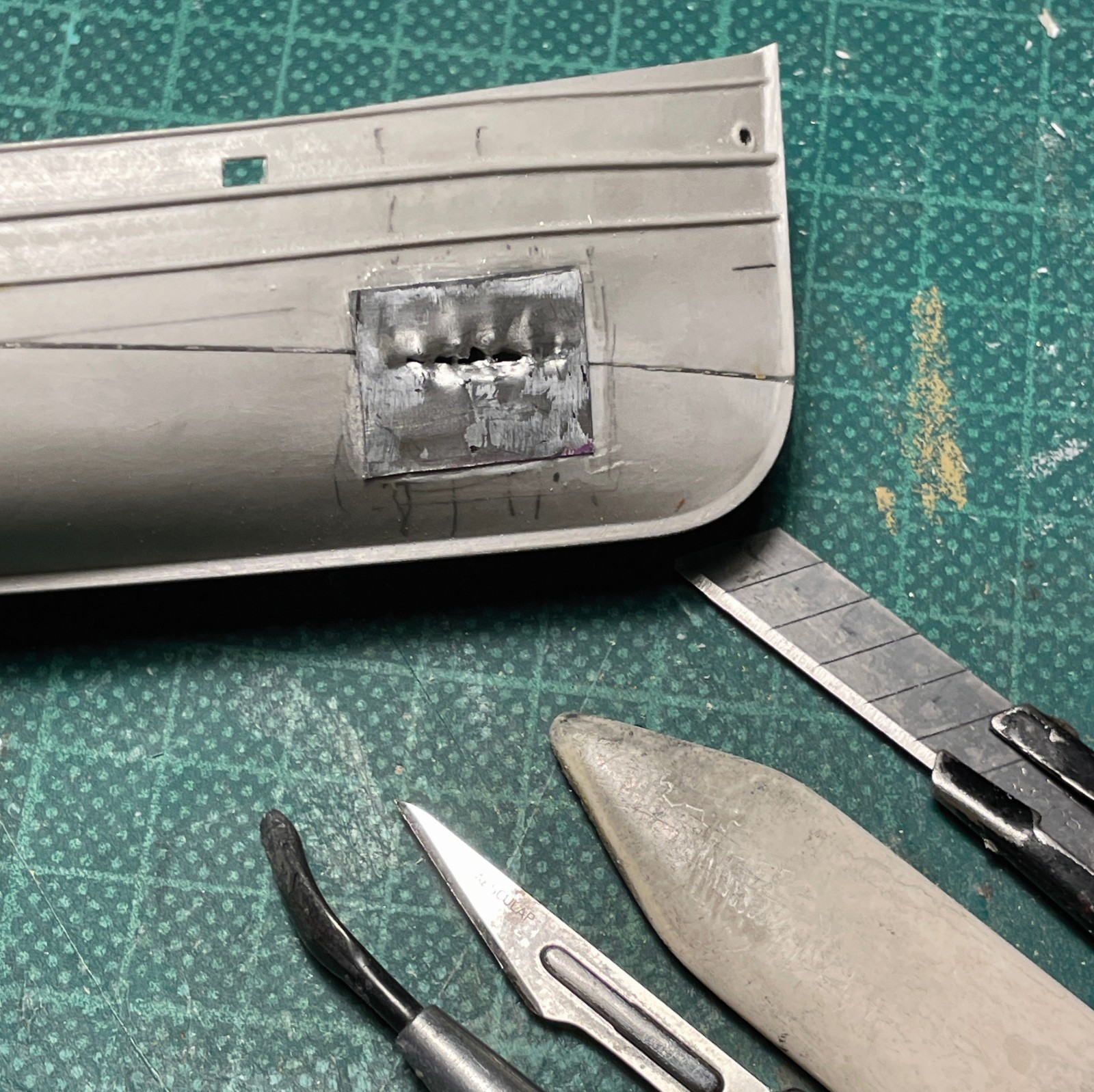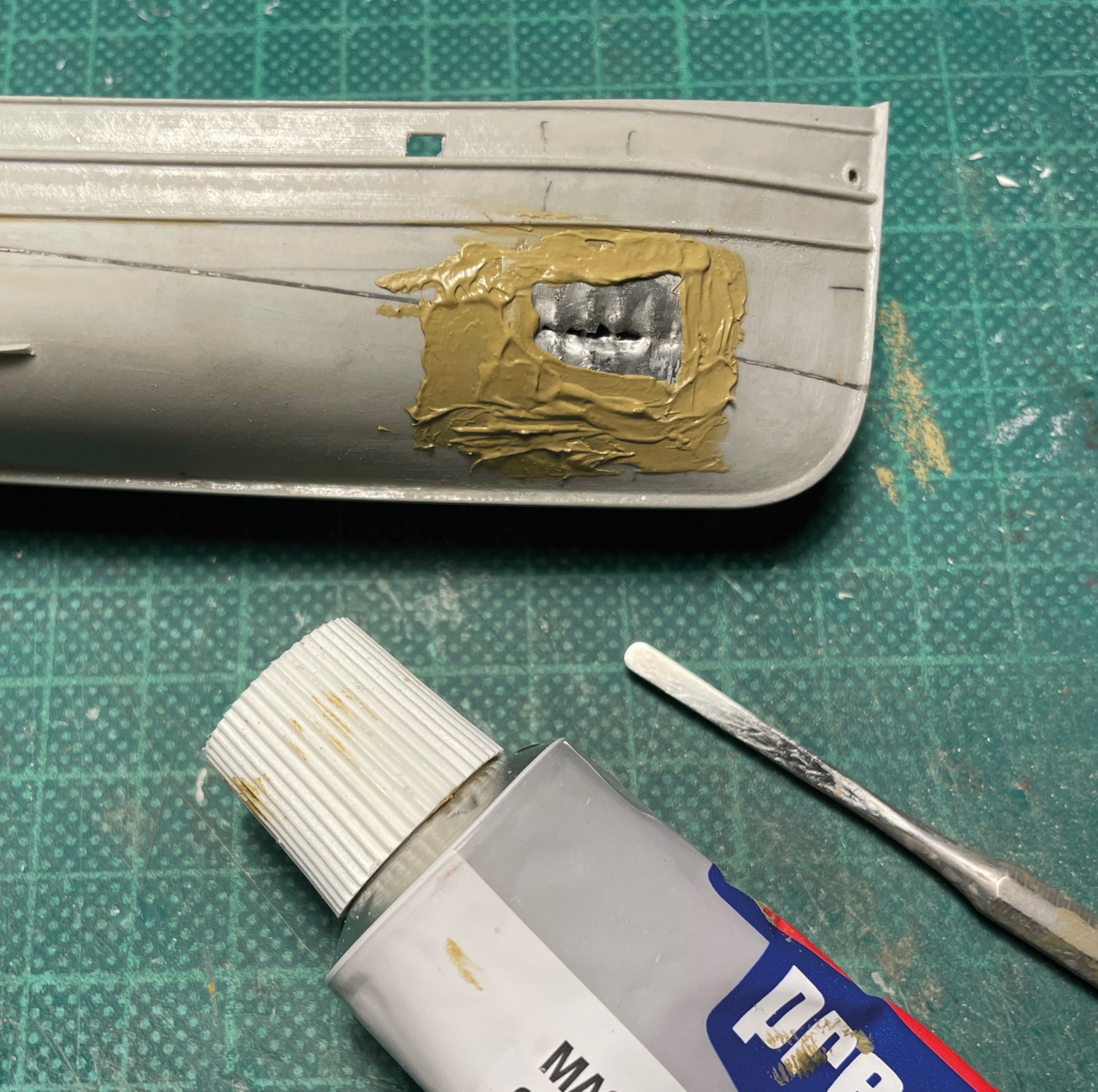 Ein kleines, eigenes Modell stellte der Abgang in den vorderen Bugbereich dar. Er sollte fragil und zerbrechlich wirken, die Türen offen und teilweise aus den Angeln gerissen. Anfänglich war da eine Enttäuschung, als sich das sehr dünne Plastik durch den Klebstoff zu verformen begann. Irgendwie brauchte ich Abstand nach der scheinbar vergeblichen Mühe und ließ es liegen. Lackierte es dann irgendwann, den Rest einer Farbe versprühend und es fing mir an zu gefallen. Was anfänglich ziemlich verhunzt - darum keine Fotos - ausgesehen hat trat nun, überraschend realistisch nach Blech aussehend in Erscheinung und ich arbeitete geduldig weiter Schicht um Schicht.