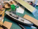 Jetzt, beim Schreiben dieses Artikels, quält mich, wie so oft die Erkenntnis, dass ich viel zu wenige Fotos gemacht habe. Fotos von Baustufen, die so manches, was nun mühsam in Texte verpackt werden muss, selbstredend verdeutlichen würden. Leider bin ich halt eine begeisterte Modellbauerin aber eine lausige Journalistin. Wenn mich die Begeisterung erfasst und es bei der Arbeit so richtig läuft, denke ich an alles andere als die fotografische Dokumentation. Da bin ich zeitweise so im „Flow“, dass alles was rund um mich herum geschieht sich der Wahrnehmung entzieht. Diese Welt der Miniaturen hat schon etwas magisches und sie zieht mich immer wieder völlig in ihren Bann. Es ist treibt mich an den Rand der Verzweiflung, wenn etwas nicht und nicht gelingen mag und sich all meine Energie an irgend einem widerspenstigen Detail verschleißt. Manchmal ist da ein tagelanges, ja sogar wochenlanges Grübeln um die Lösung eines Problems zu finden. Doch wenn es dann aus unerfindlich Gründen, allen Widerständen zum Trotz gelingt, kehrt eine tiefe Freude und Zufriedenheit ein. Gerade jetzt, in diesen Zeiten wo die Welt aus den Fugen zu geraten scheint, bin ich dankbar für meinen Fluchtort. Oft, vielleicht zu oft, ziehe mich zurück und flüchte in meine Fantasie, die sich unter der Lupenlampe zu einer kleinen Realität entwickelt. Diese Miniatur dieses kleinen Fischkutters war eine ziemliche Herausforderung und große Freude in einem. Zahlreiche neue Techniken wurden erprobt, die manchmal zu guten Ergebnissen führten, mich manchmal, reumütig zu altbewährten Techniken zurückkehren ließen.